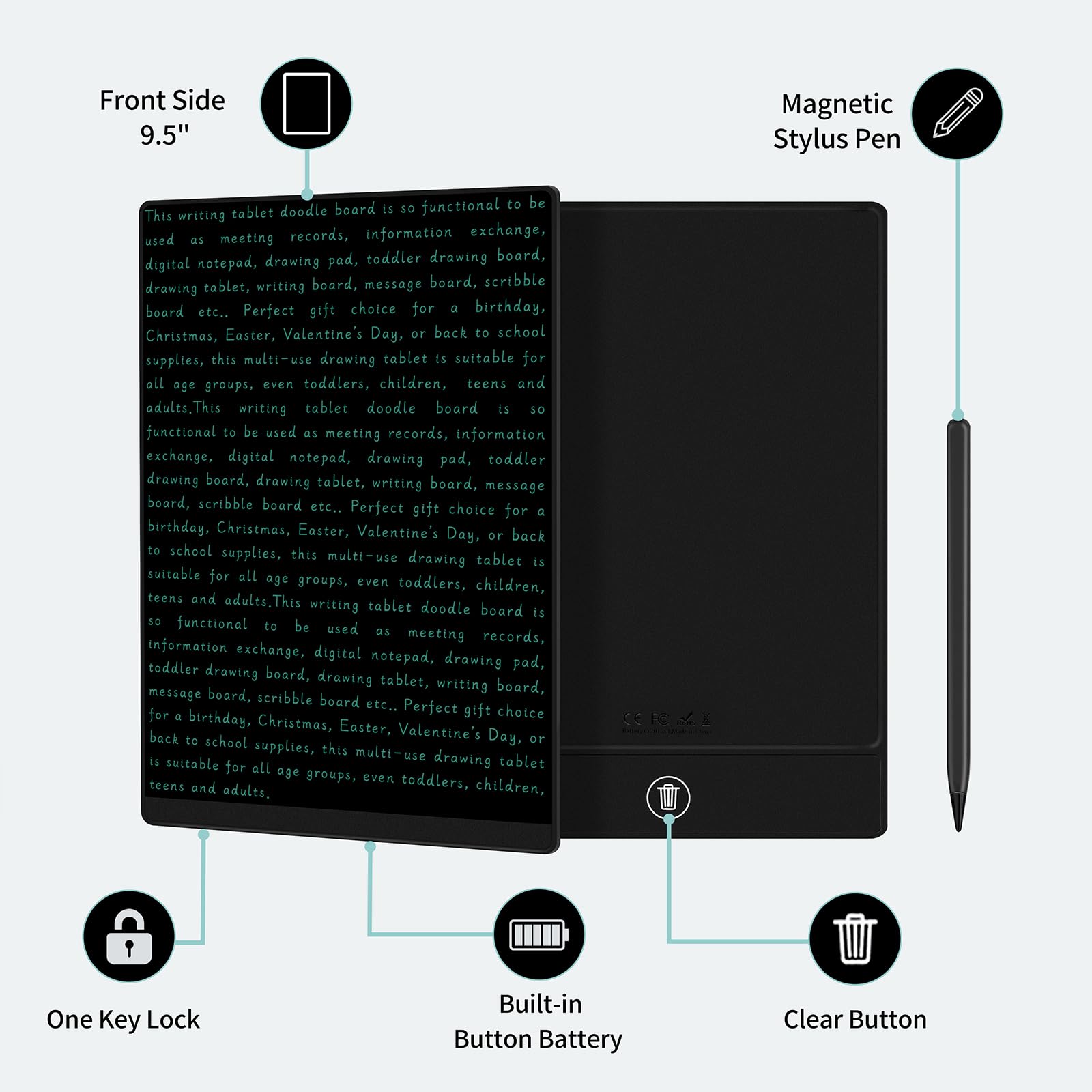 Lightweight And Portable: Our LCD writing tablet with 9.5 inch full screen is made of premium ABS material, plus a narrow frame with round corner design, more comfortable to record, communicate, study, work or play games; The drawing tablet is only 0.2 inch thin and 0.23 lb weight, making it easy to put in your school bag, handbag and travel bag easily