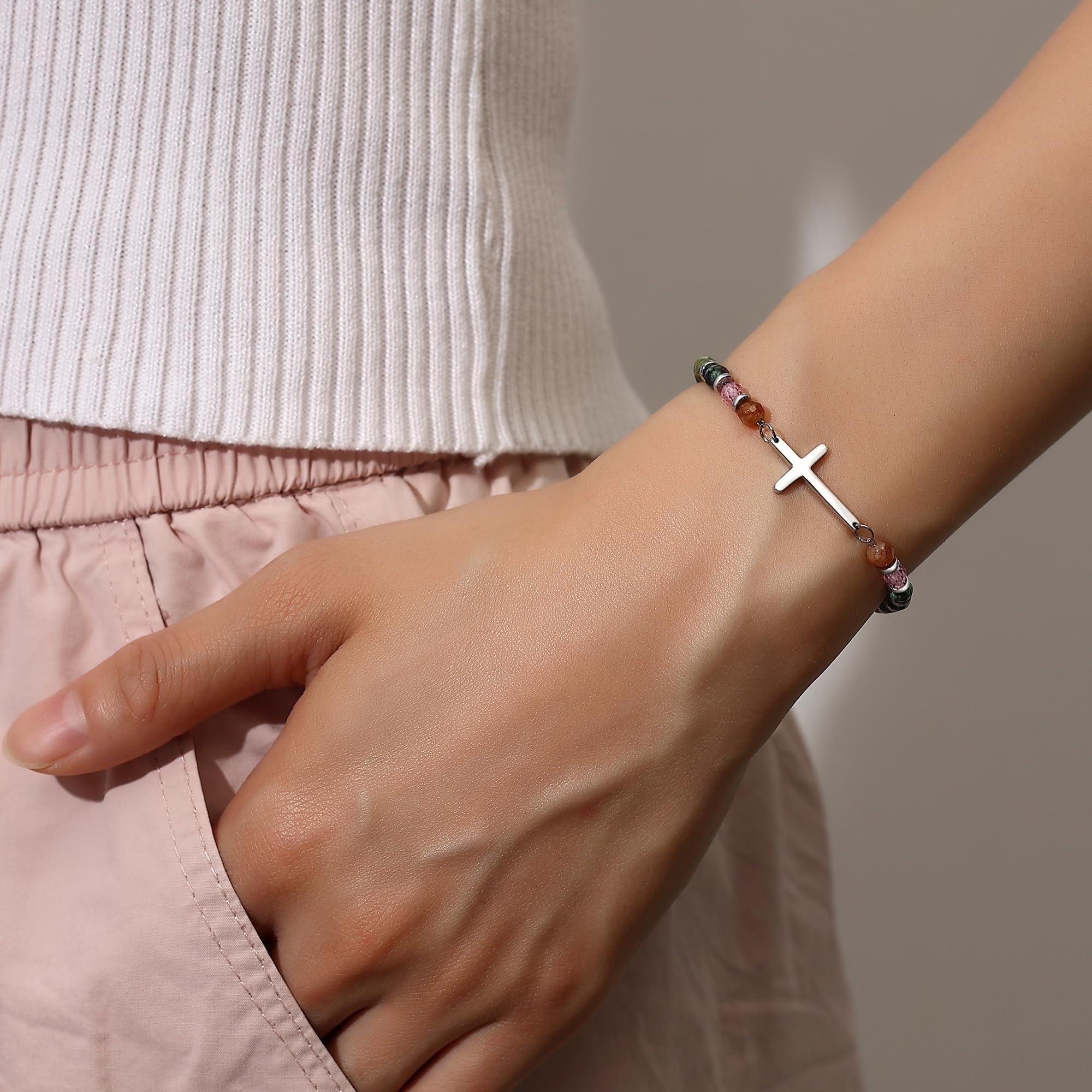 【 Premium Quality & Adjustable Size 】Crafted for comfort and durability, this 7.4" beaded cross bracelet for women features a 1.5" extension chain for an adjustable fit (6.5"-8" wrists). Handmade with 4mm colorful natural stones and hypoallergenic 316L stainless steel beads, it’s lightweight, tarnish-resistant, and perfect for daily wear.