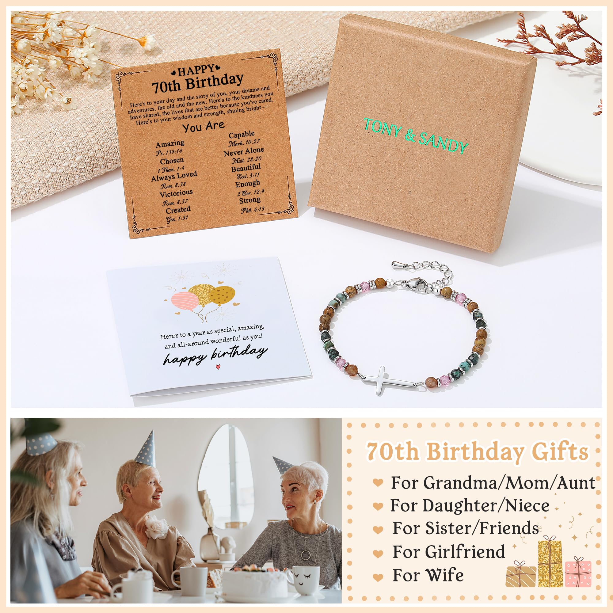 【 70th Birthday Gifts for Women 】Celebrate her 70th birthday with this elegant cross bracelet—a timeless keepsake designed to honor her strength, wisdom, and beautiful journey. Featuring a delicate cross charm and earth-tone gemstone beads, this bracelet is more than just jewelry; it's a symbol of faith, love, and milestone memories. Perfect as a unique 70th birthday gift for her—whether she's your wife, mom, sister, best friend, or any special woman in your life.
