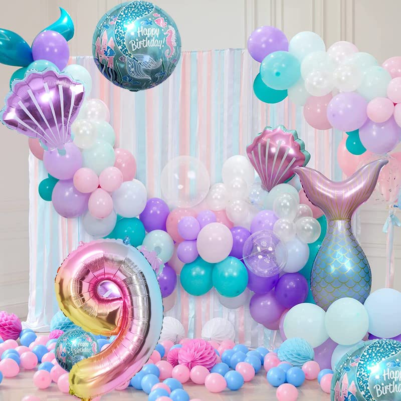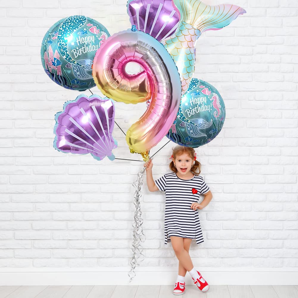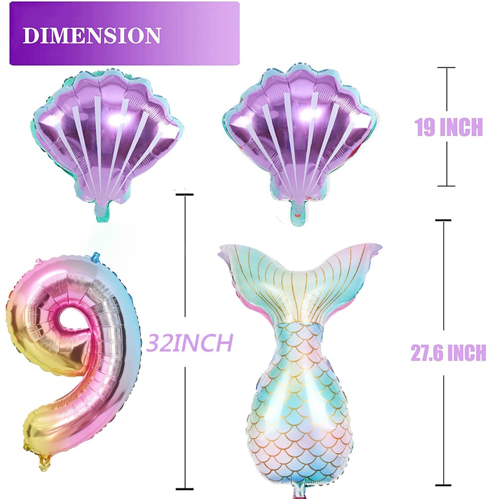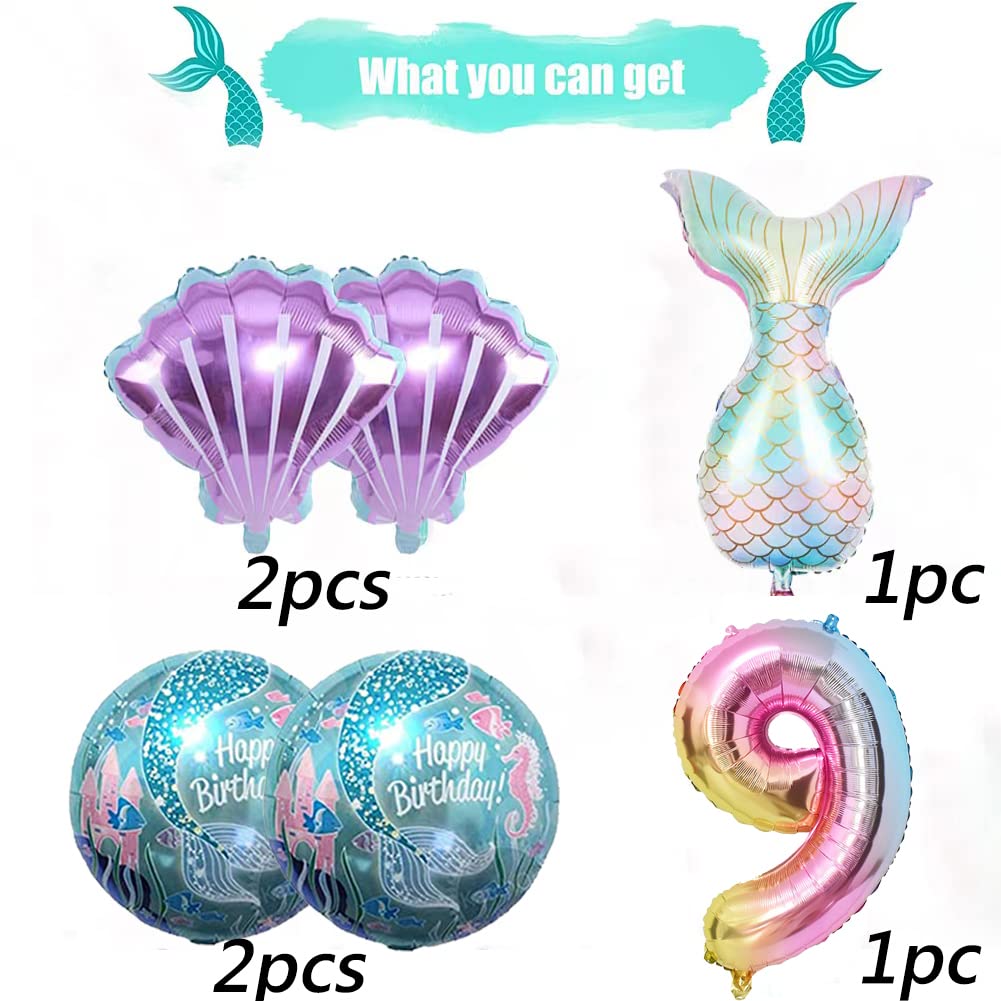 【Mermaid Party Decoration】Including:1 pcs 32inch large number foil balloon, 1pc mermaid tail balloons, 2pcs 18inch round mermaid balloons, 2PCS 21inch shell Balloons