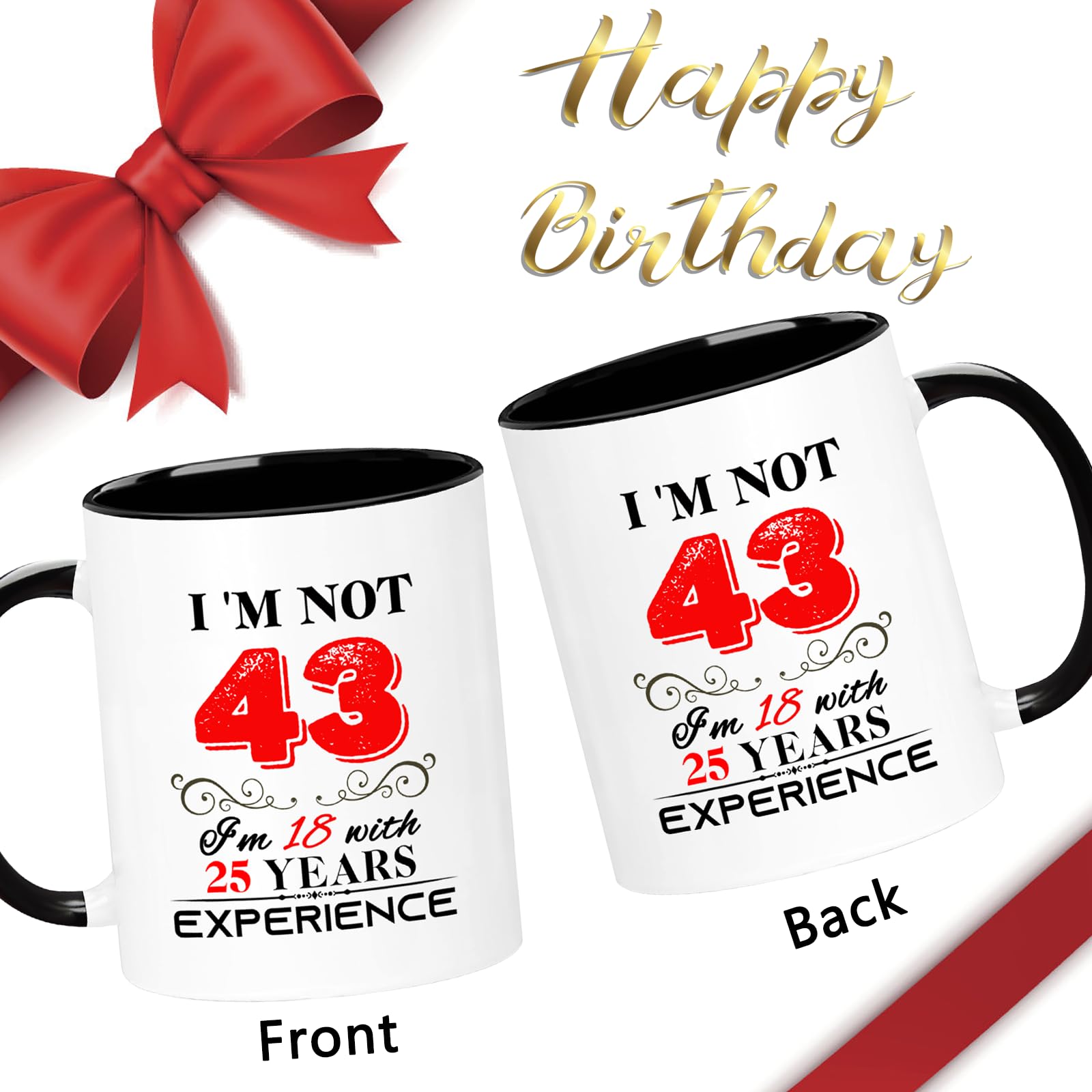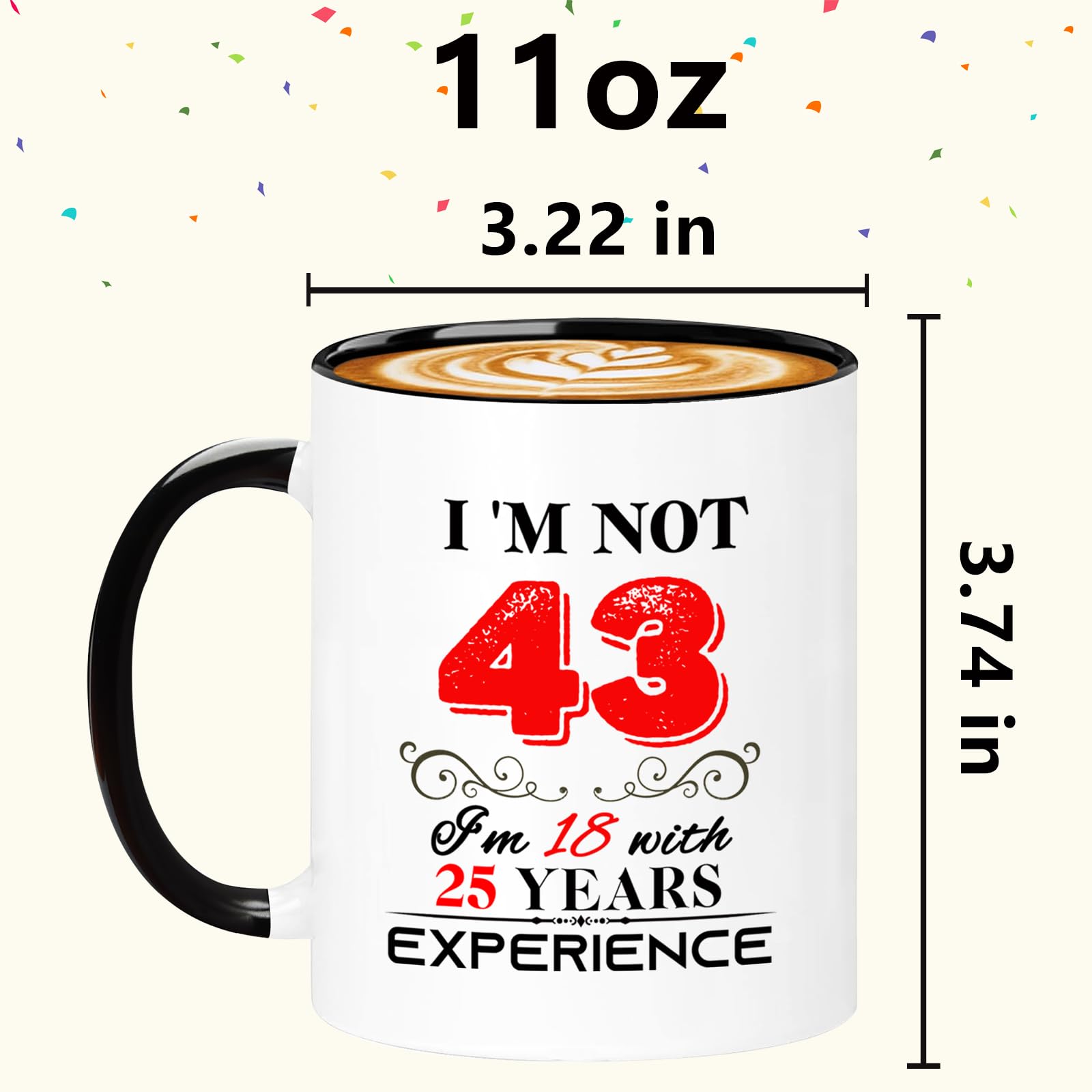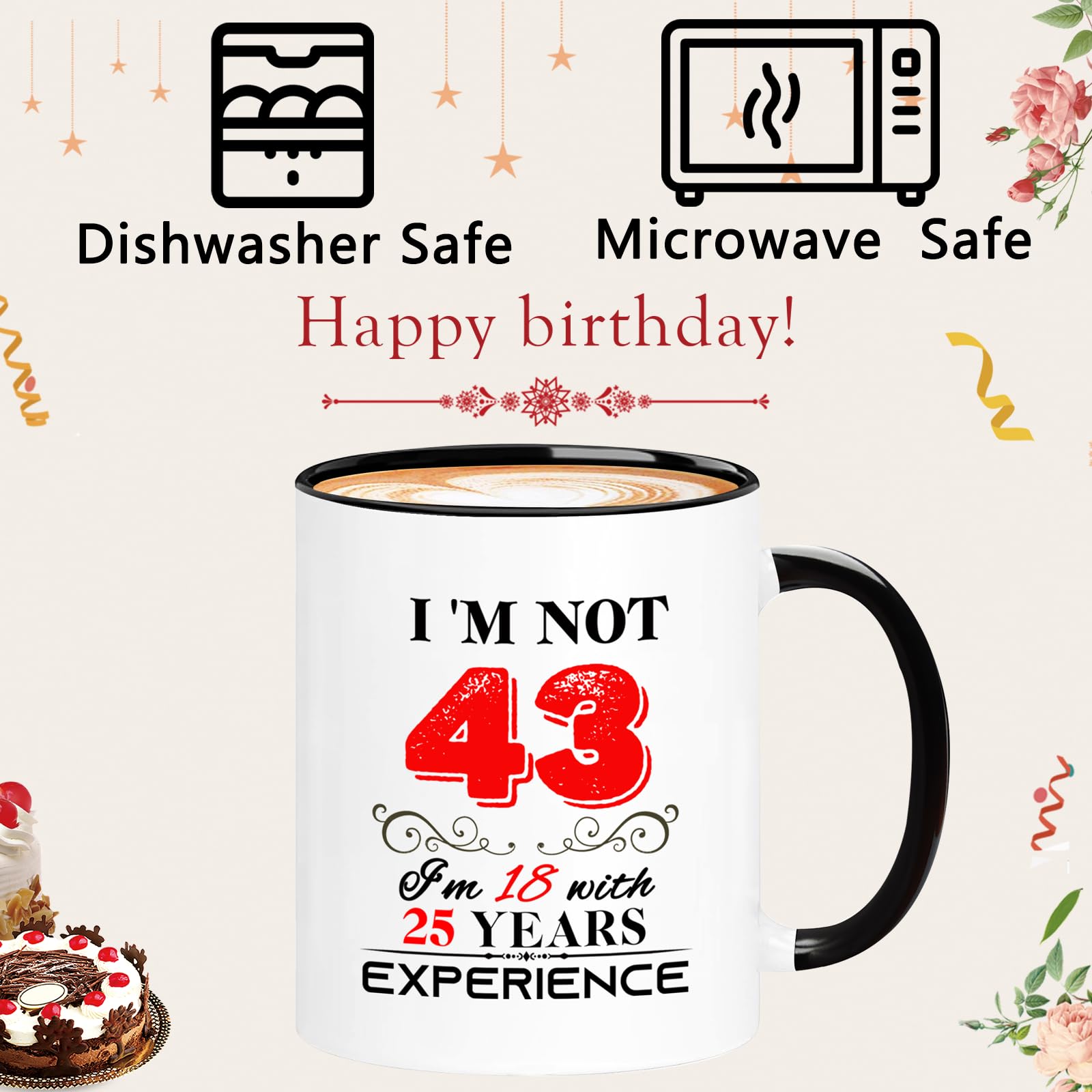 【Birthday Gift】: This funny "I'm not 43, I'm 18 with 25 years experience" Mug is the perfect birthday gift for a 43 year women men! Give it to your mom, dad, papa, mama, brother, sister, husband, wife, aunt, uncle, cousin, son, daughter, boyfriend, girlfriend, boss, coworkers, bestie, granddaughter, or your best friend for her he birthday.