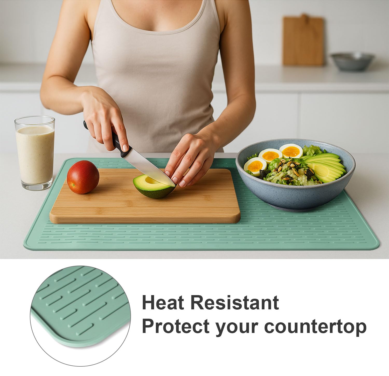 Kitchen Drying Mat:The unique design of wide raised line ridges increases air circulation, improves ventilation, and catches drips from dishes, glasses, fruits, and vegetables. The high edges and waterproof bottom keep the countertop dry and clean, making it an ideal kitchen drying mat.