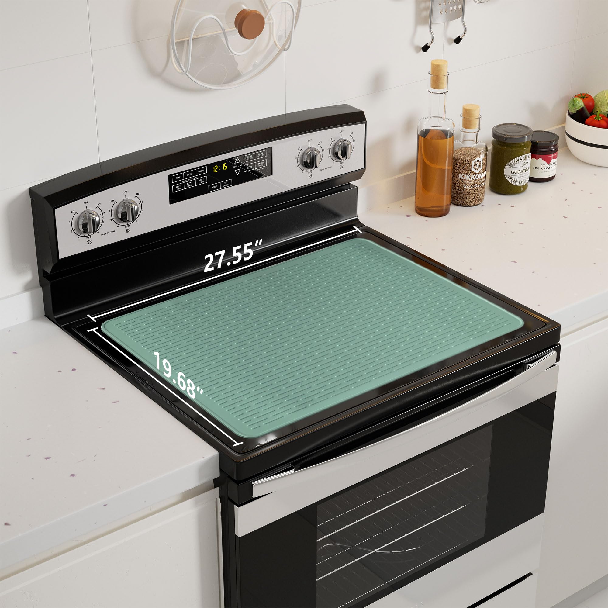 Glass Top Stove Cover:This extra large 28" x 20" inches silicone stove cover for glass top electric stove is perfect for protecting your electric stove top, kitchen counter top, electric cooktop, table, or washer-dryer top from scratches, spills, stains, scrapes, and dirt. It keeps the surface clean and tidy while providing an expandable workbench for food preparation.