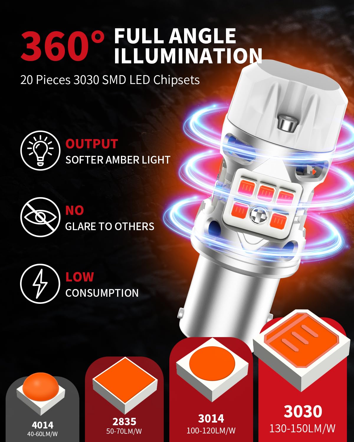 500% BRIGHTER THAN HALOGEN — High Visibility in Snowy & Low-Light Conditions: Equipped with 20pcs 3030 premium LED chips, these bulbs deliver a 360° amber illumination with no dark spots. The powerful 4000LM / 48W output dramatically improves visibility — especially crucial on snow-covered roads, foggy winter mornings, busy night-time holiday traffic