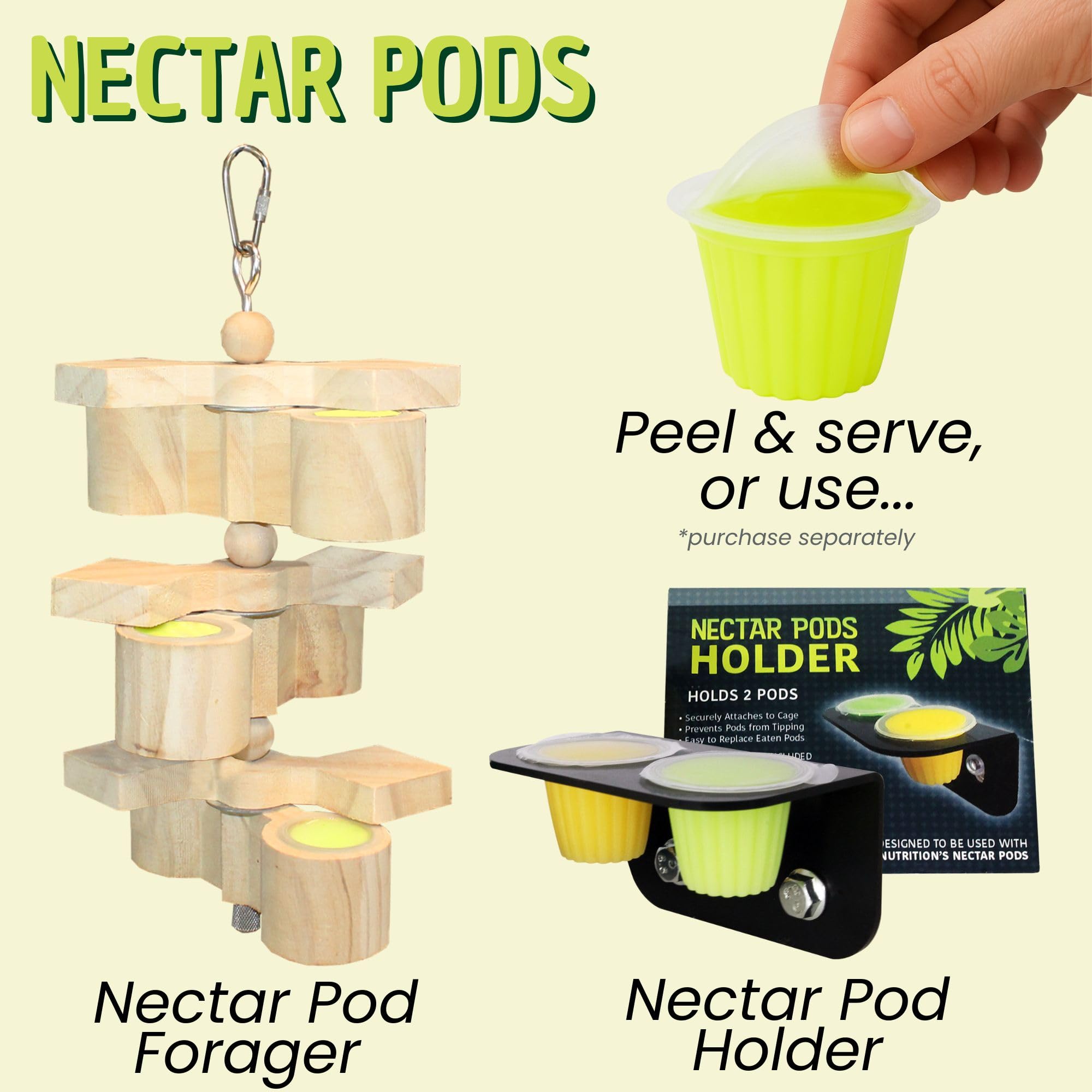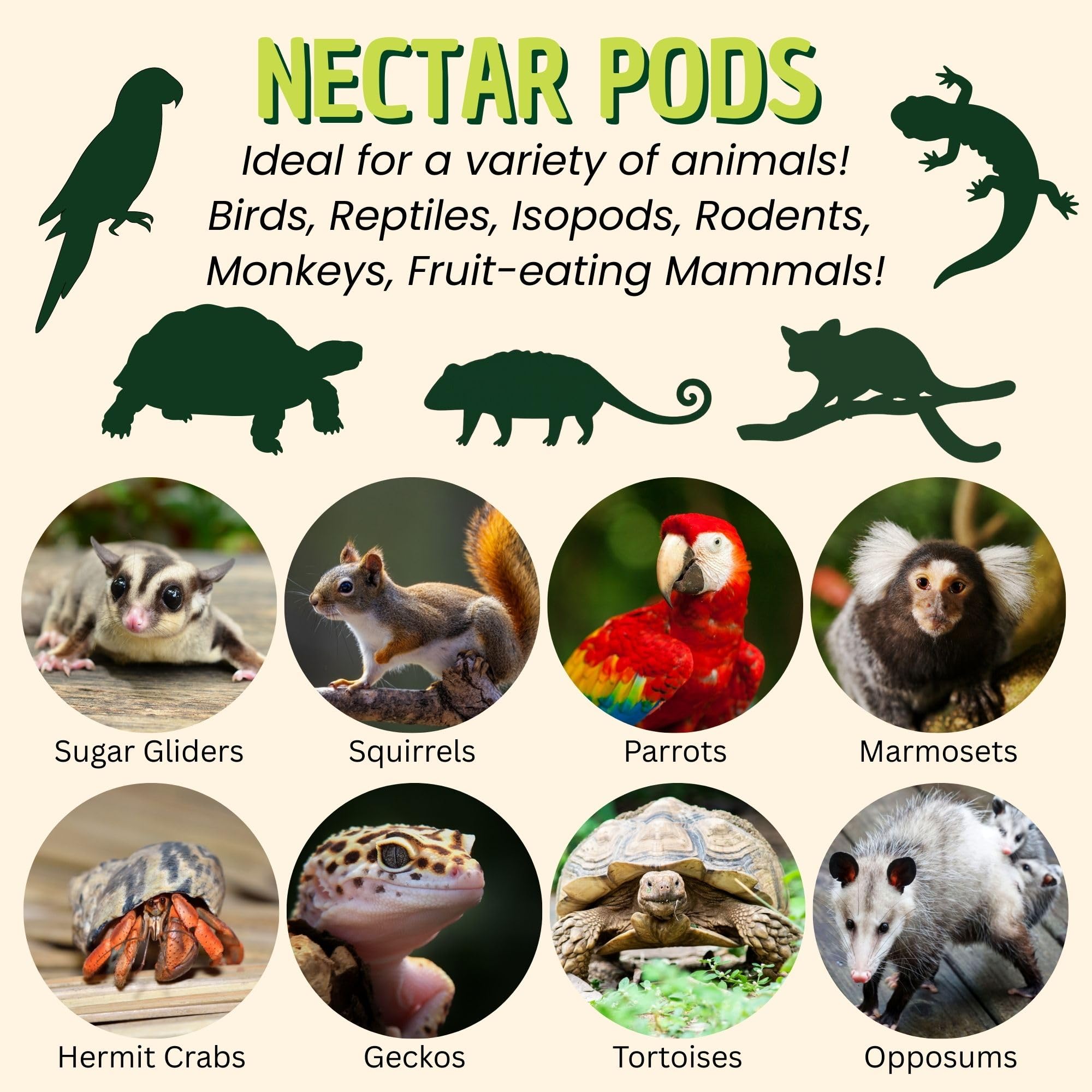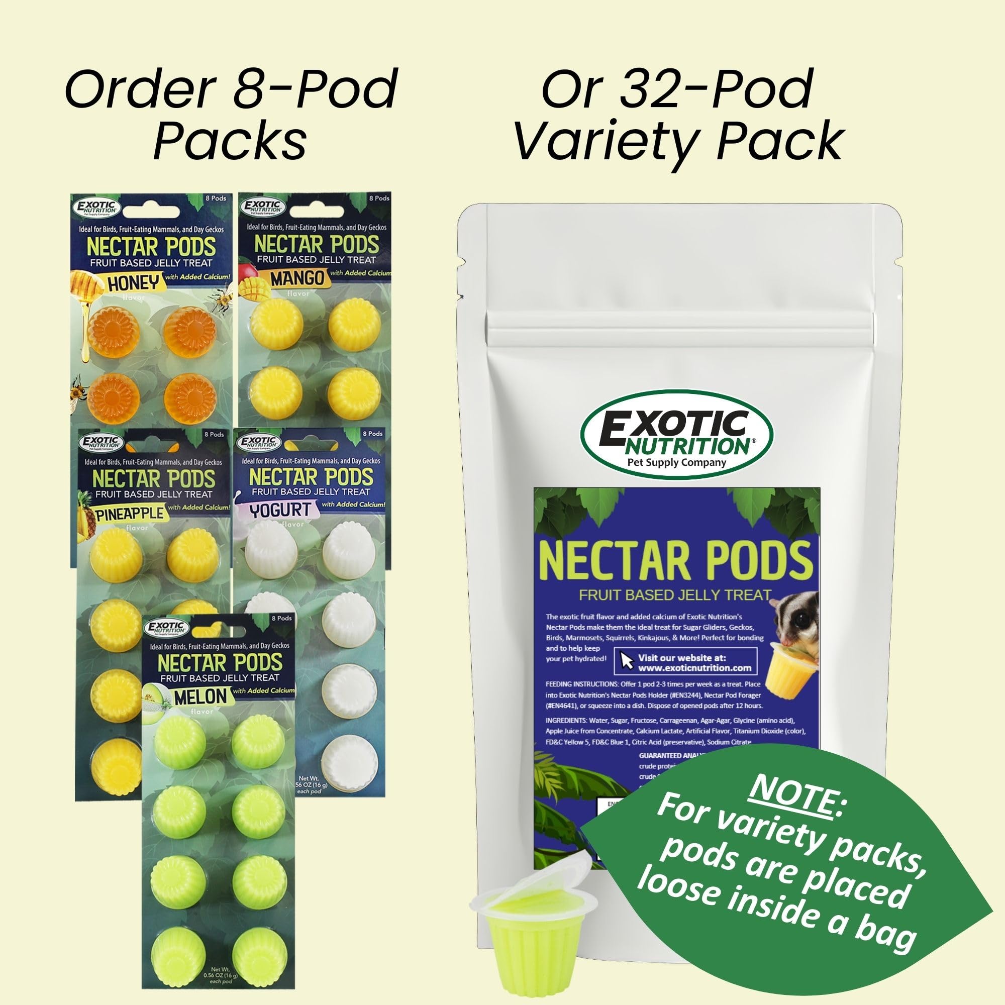 Exotic Nutrition's Nectar Pods are a fruit-based, jelly treat. Offering your pet a delicious treat has never been easier! WHAT YOU GET: 1 pack of 8 individual pods FEATURES: ✔ EASY TO FEED - Nectar Pods are conveniently packages as single servings. ✔ HEALTHY - The exotic fruit flavors & added calcium make Nectar Pods the ideal treat for birds, fruit-eating mammals, and day geckos ✔ LONG SHELF LIFE - Unopened pods store unrefrigerated for months for convenient use. ✔ VARIETY - Lend variety to an otherwise monotonous diet. ✔ TRAINING - Assist in training by allowing you to reward your pet. ✔ BONDING - Form a connection between pets and owners. ✔ ENRICHMENT - Add behavioral enrichment. INGREDIENTS: Water, Sugar, Fructose, Carrageenan, Agar-Agar, Glycine (amino acid), Apple Juice from Concentrate, Calcium Lactate, Artificial Pineapple Flavor, Titanium Dioxide (color), FD&C Yellow 5, FD&C Blue 1, Citric Acid (preservative), Sodium Citrate GUARANTEED ANALYSIS: crude protein (min) 0.50%, crude fat (min) 0.40%, crude fiber (max) 0.20%, moisture (max) 74.00%, calcium (min) 0.77%, phosphorus (min) 0.37%, glycine (min) 0.15% FEEDING INSTRUCTIONS: Offer 1 pod, 2-3 times per week, as a treat. Place within Exotic Nutrition's Nectar Pods Holder or Nectar Pod Forager. Or remove top and place pod in your pet's food dish, or squeeze contents out into a feeding dish. Always dispose of plastic pod shell after use, and monitor pets if plastic shell is put within the cage. STORAGE INSTRUCTIONS: Store unused pods in a cool, dark, dry place. Dispose of opened pods after 12 hours. ANIMALS: Loved by sugar gliders, day geckos, parrots and other birds, hamsters, squirrels, marmosets and other monkeys, kinkajous, fruit-eating mammals, and more.