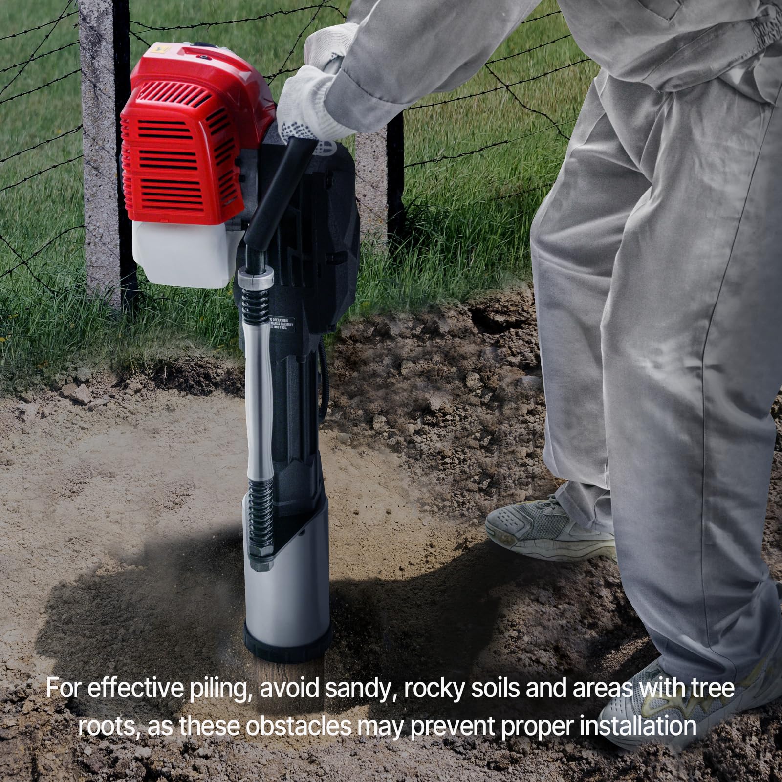 Rapid Piling: This 52cc pile driver features a fast piling speed, strong hammering force, and an impact frequency of up to 1300-1700 BPM with an impact energy of 50J. It enhances work efficiency, allowing you to complete piling tasks quickly. For effective piling, avoid sandy, rocky soils and areas with tree roots, as these obstacles may prevent proper installation