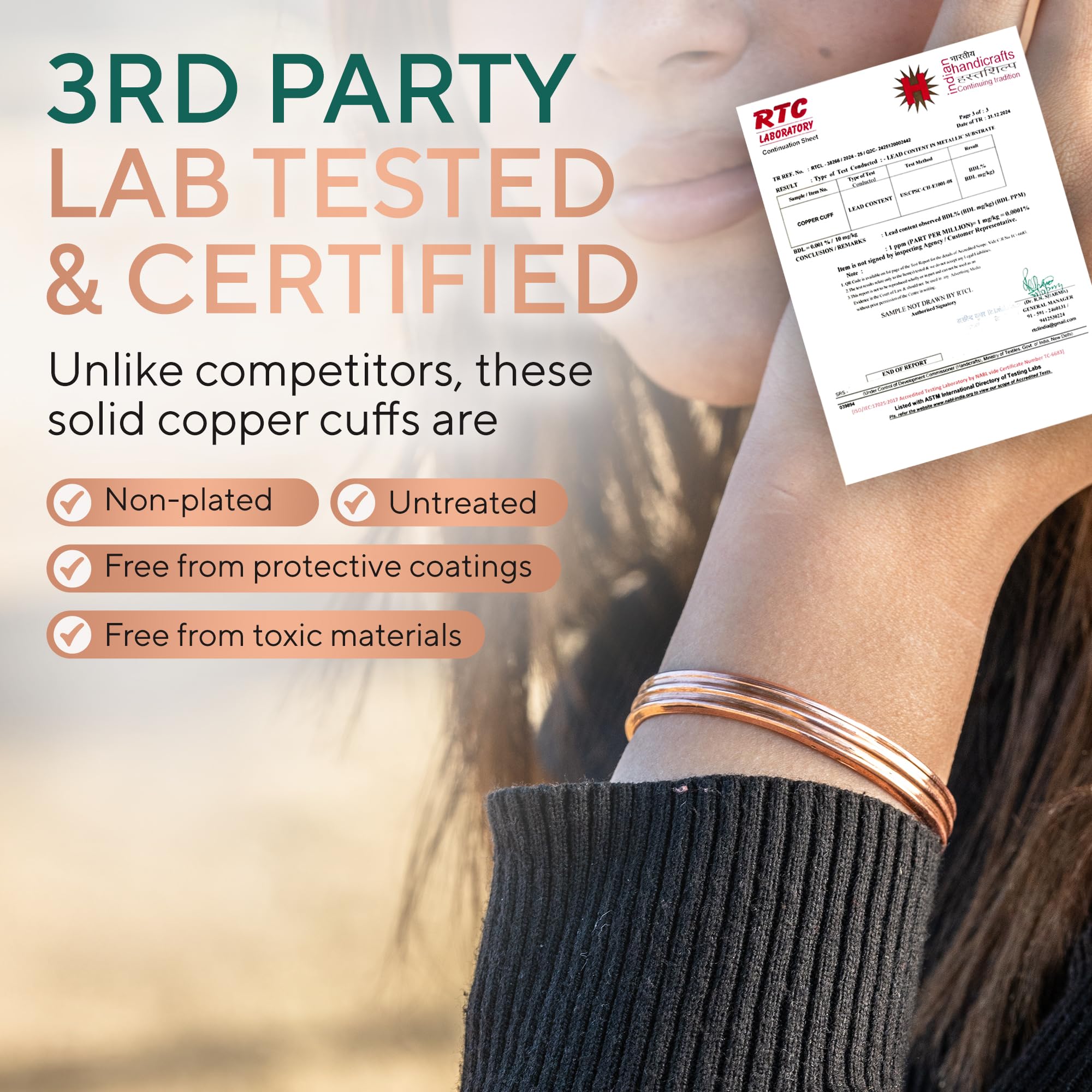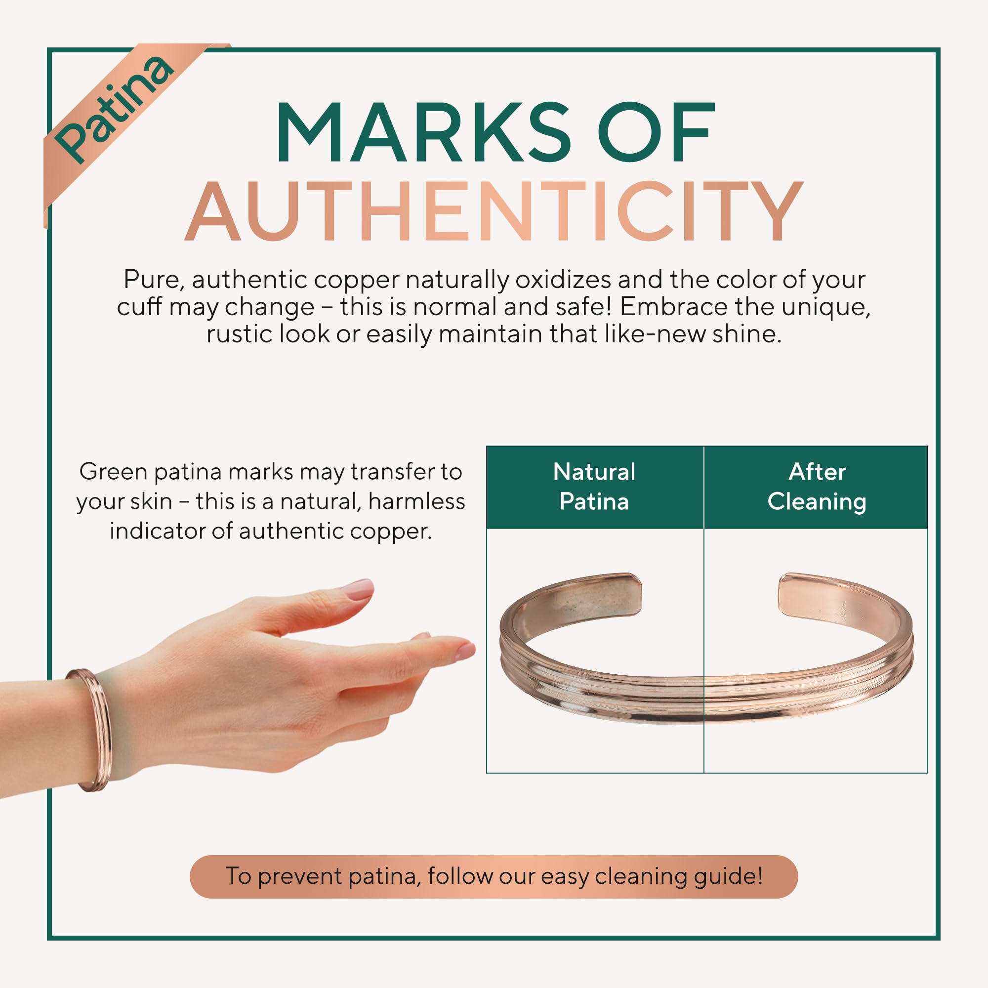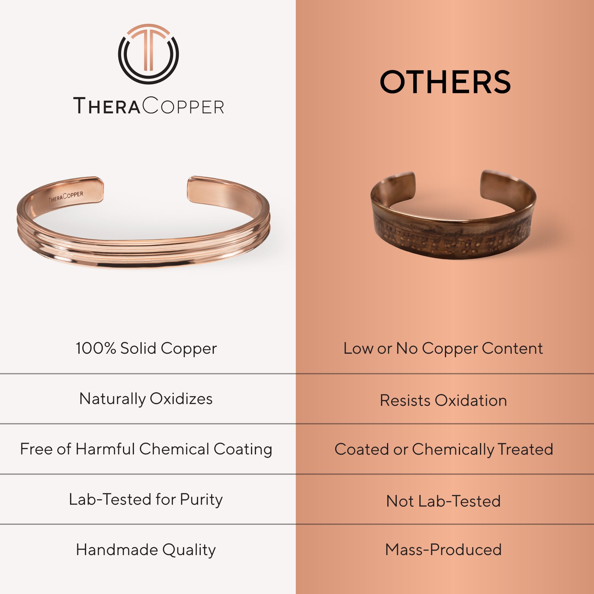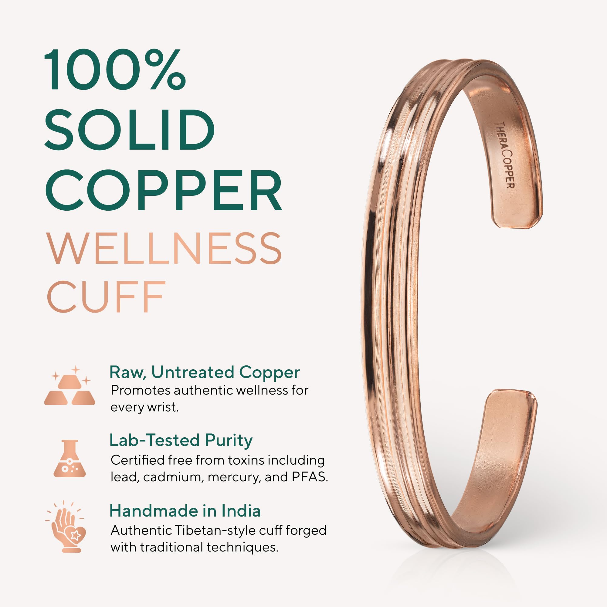 THE PUREST COPPER: Handcrafted with 100% pure copper, our real copper bracelet is lab-tested and certified free from harmful metals like lead, nickel, cadmium, and PFAS. Many alternatives use cheap, mixed copper or plated bracelets with toxic coatings—TheraCopper is completely natural, untreated, and safe. Over time, your pure copper cuff bracelet will develop a natural patina, a hallmark of authentic, untreated copper—not a defect. Simply restore its original shine with salt and lemon juice or any copper cleaner.