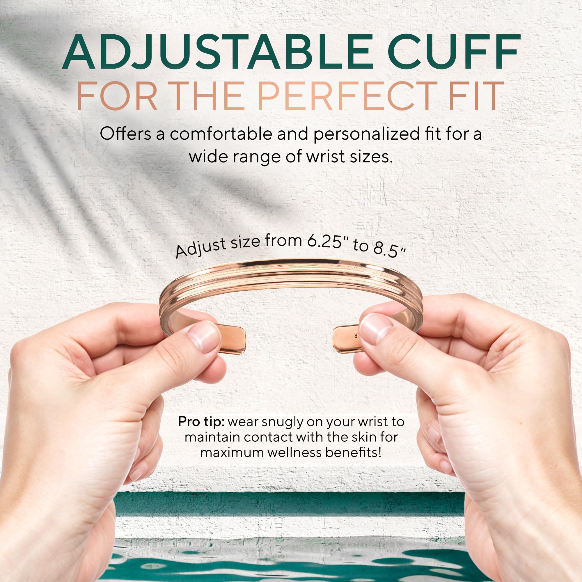 ADJUSTABLE FIT: Designed for all-day comfort, our open-cuff copper bracelet easily adjusts to fit wrist sizes 6.25" to 8.5" (SMALL to X-LARGE). Whether it's a womens or mens copper bracelet, the customizable fit ensures a secure yet comfortable feel without compromising style. A perfect choice for those who appreciate the timeless charm and wellness benefits of real copper jewelry for women and men.
