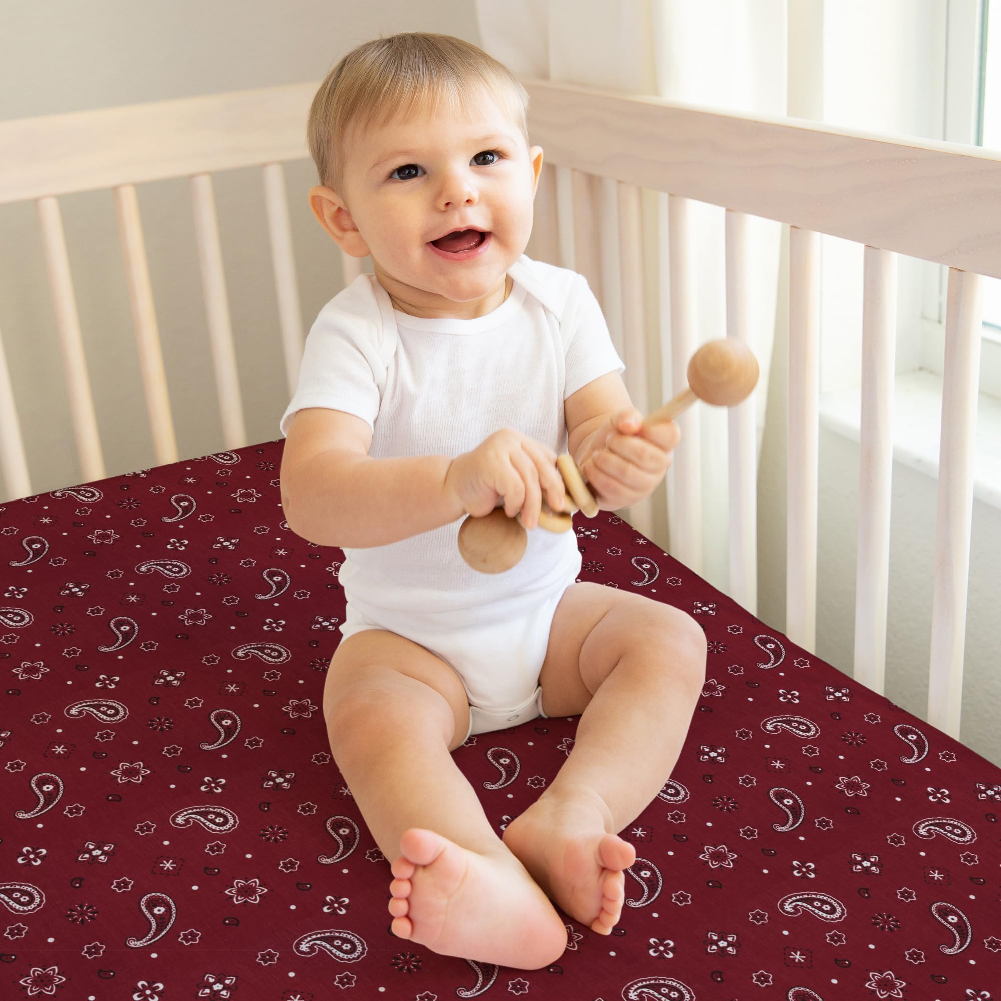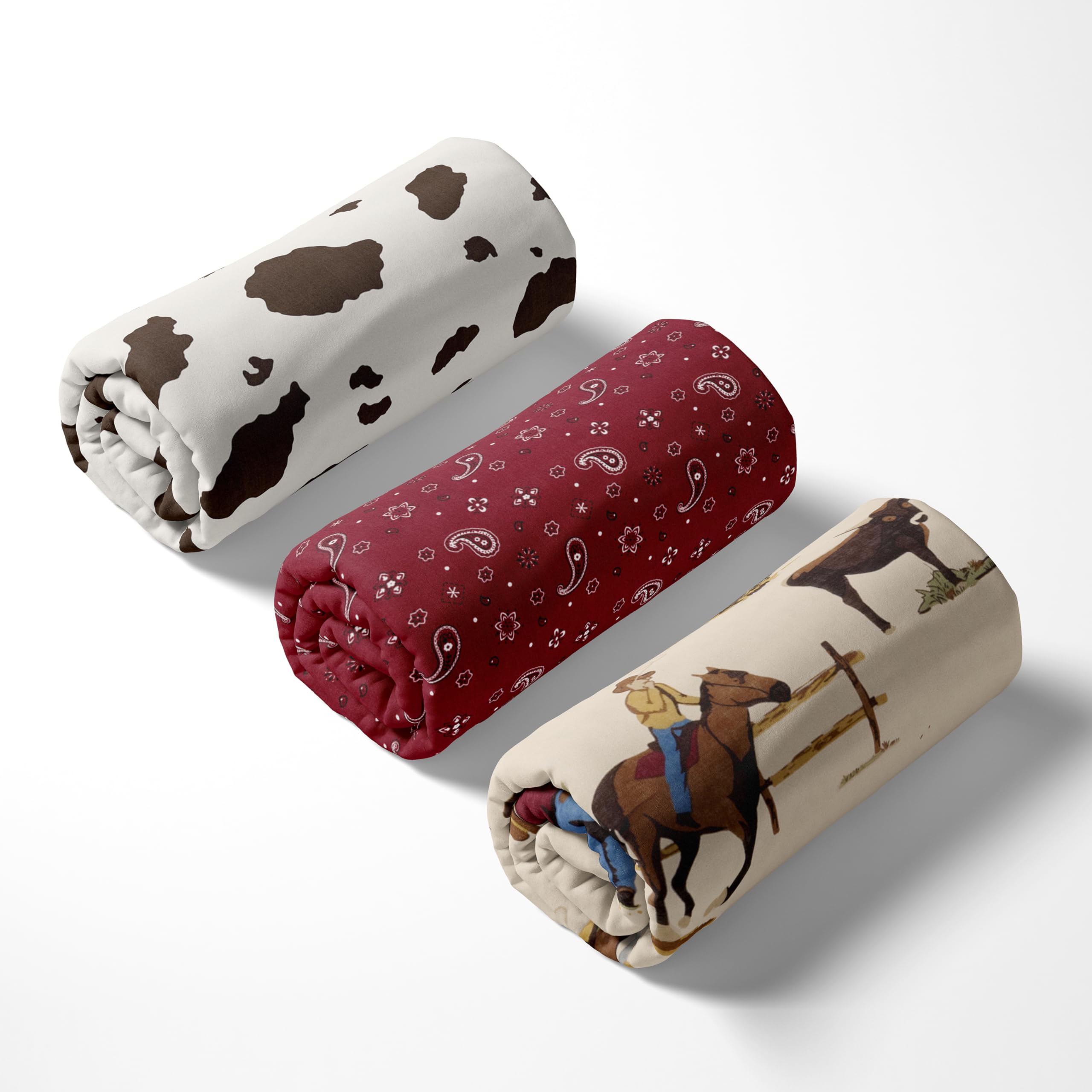 SNUG FIT: Includes: (3) Baby Crib Sheets: 52in. x 28in. x 8in. each. Our newborn standard crib sheets fit snugly, with premium elastic sewn around the entire bottom edge for a secure fit on most standard sized cribs and toddler beds, to reduce shifting and bunching. This microfiber cribsheets set features an exclusive design of a red bandana print, a brown cow print & neutral tan illustrations of wild western animals print & is gentle on delicate skin to foster a soothing sleep environment.