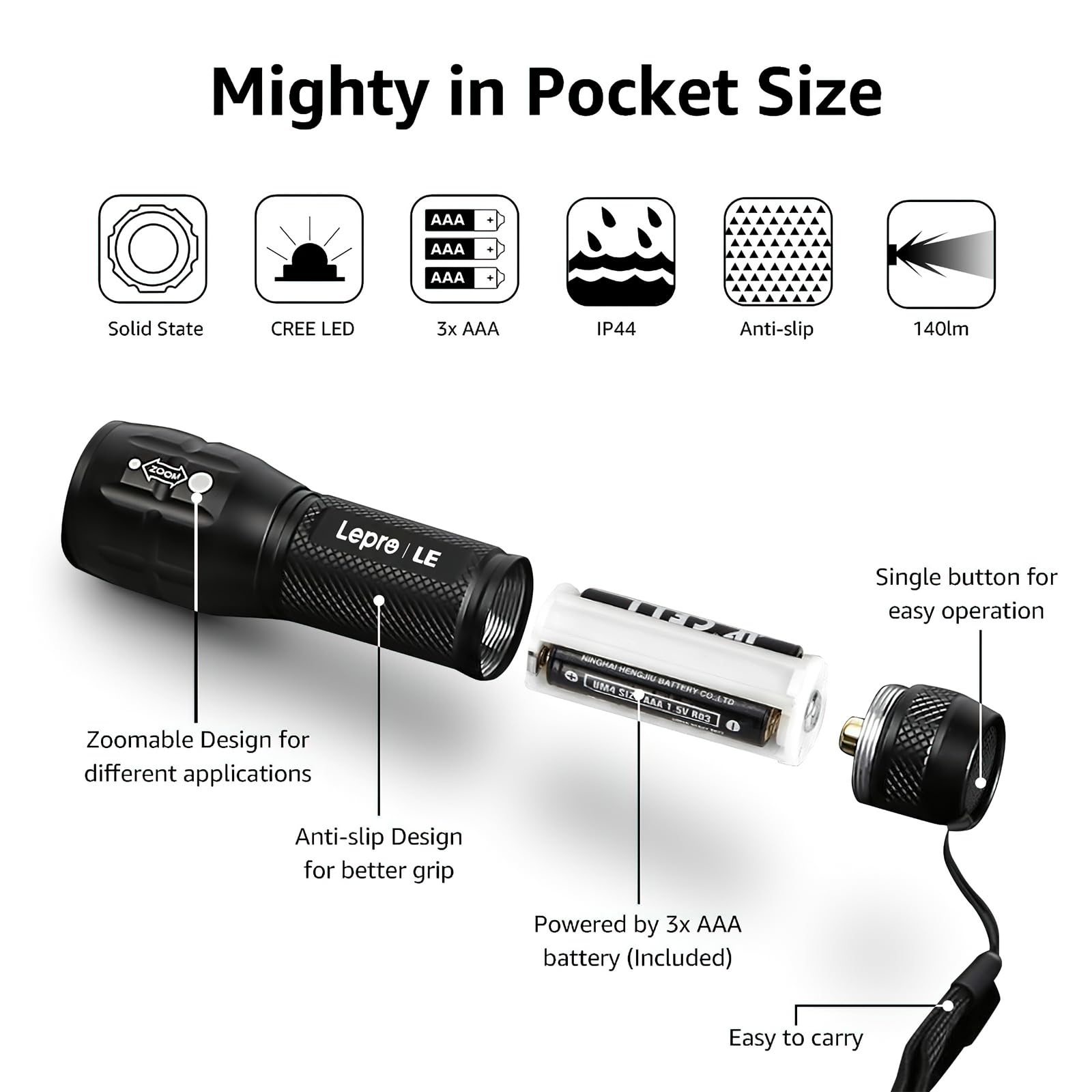 ZOOMABLE FLASHLIGHT- Led flashlight has ability to narrow or widen the area you wish to light. You can stretch the head-pulling zoom to adjust its focus and get spot beam or flood beam you need.