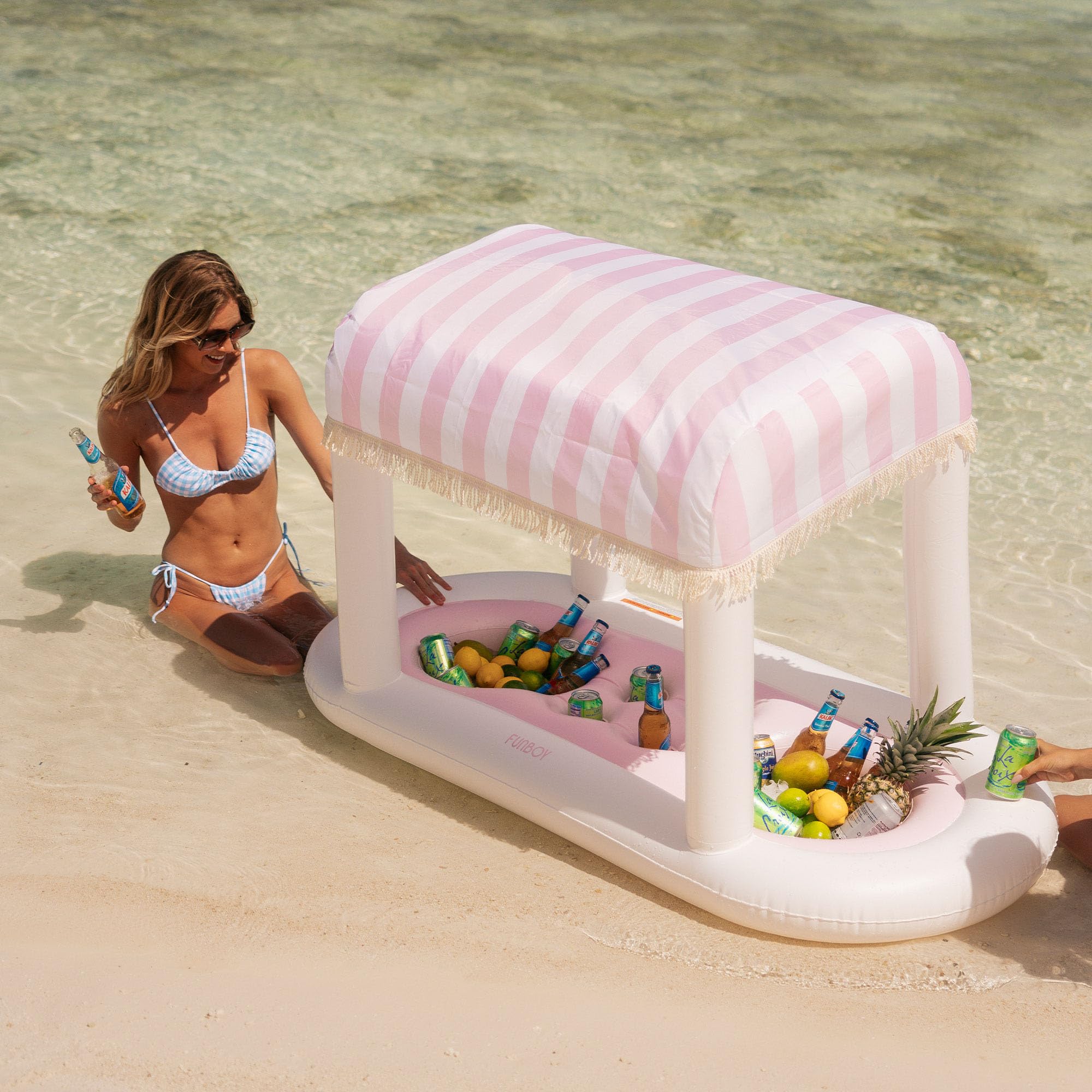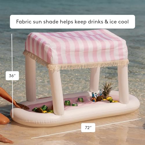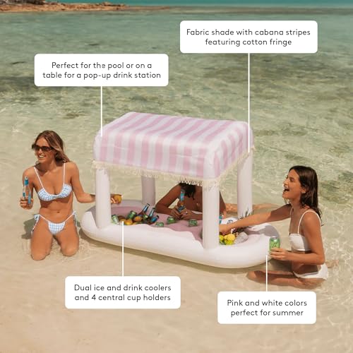 Introducing the FUNBOY Floating Cabana Bar – a must-have for outdoor enthusiasts and entertainers alike! Boasting an impressive length of nearly 6 feet, this versatile accessory adds a touch of fun to any outdoor gathering. Whether you're looking to create the ultimate floating drink station in the pool or elevate your table setup at the next outdoor party, the Floating Cabana Bar has got you covered. Featuring two drink stations that hold over 12 cans each and 4 central cup holders. Removable fabric shade lined with fringe augments any pool or backyard setting!