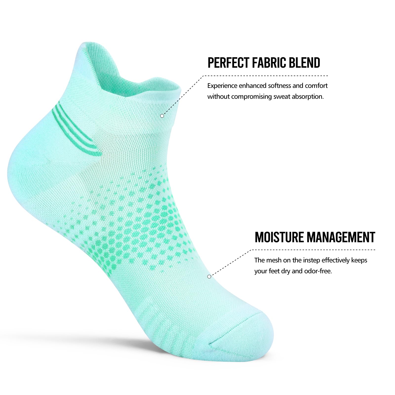 [CUSHION SOLE and ANTI-BLISTER]: Womens running socks with great soft cushion at the bottom, heel and toe areas to absorb shock and relieve foot pain. The Y-stitched heel pocket and elasticated band prevents socks from slipping and blisters from forming