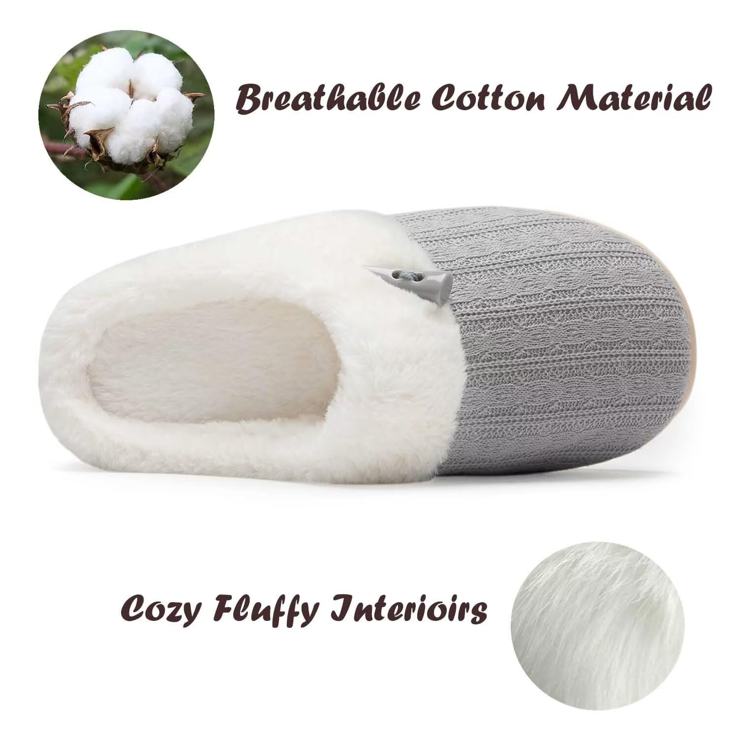 EASY SLIP ON STYLE:Step into comfort easily with these open back fuzzy bedroom slippers that are made with fluffy plush.Soft plush faux fur lining offers superior comfortability from the clouds.Also these comfy house shoes are so chic with knitting upper and horn button design