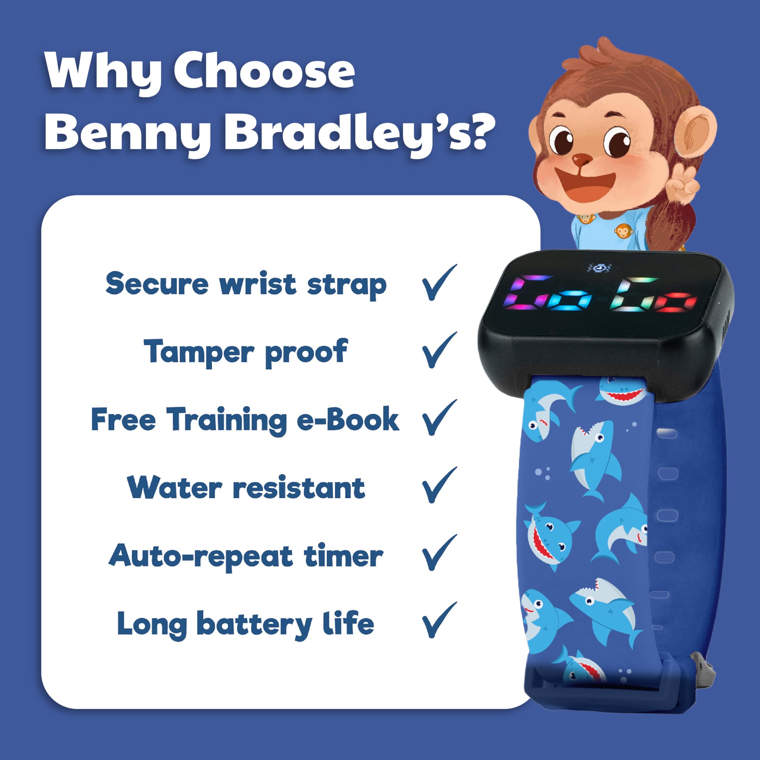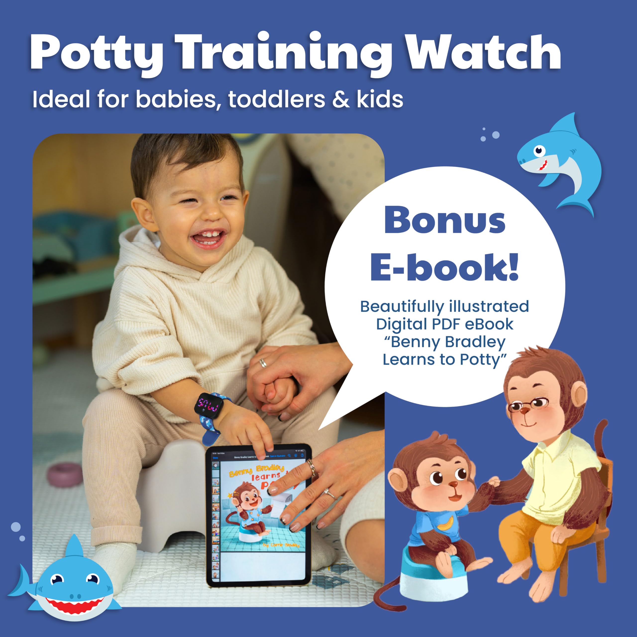 EBOOK INCLUDED - Comes with complementary 18-page picture digital ebook, "Benny Bradley Learns to Potty," a beautifully illustrated children's book, It's fun and educational for potty-training toddlers, Mommies and Daddies! Please note this is meant to be read on a digital reader such as a tablet, phone, kindle, or computer reader device. This watch package does not come with a physical book.