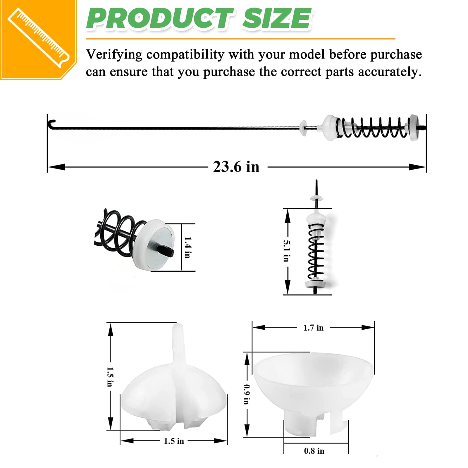 ✔✔【UPGRADED W10780048 WASHER SUSPENSION ROD KIT】The kenmore washer suspension rod kit w10780048 includes 4 x Suspension rods, 4 x Suspension balls, 4 x Suspension ball housing. ▶Length:23.6 inches. The wtw6600sw2 rtw4640yq1 suspension rod kit is made of a combination of high-quality stainless steel metal, ABS plastic material and silica gel structure. The rods are coated to avoid potential rust problems. Hook design, easy to install. If the washing machine loses the balance or code error, use the new suspension rod kit to keep the balance back to normal use