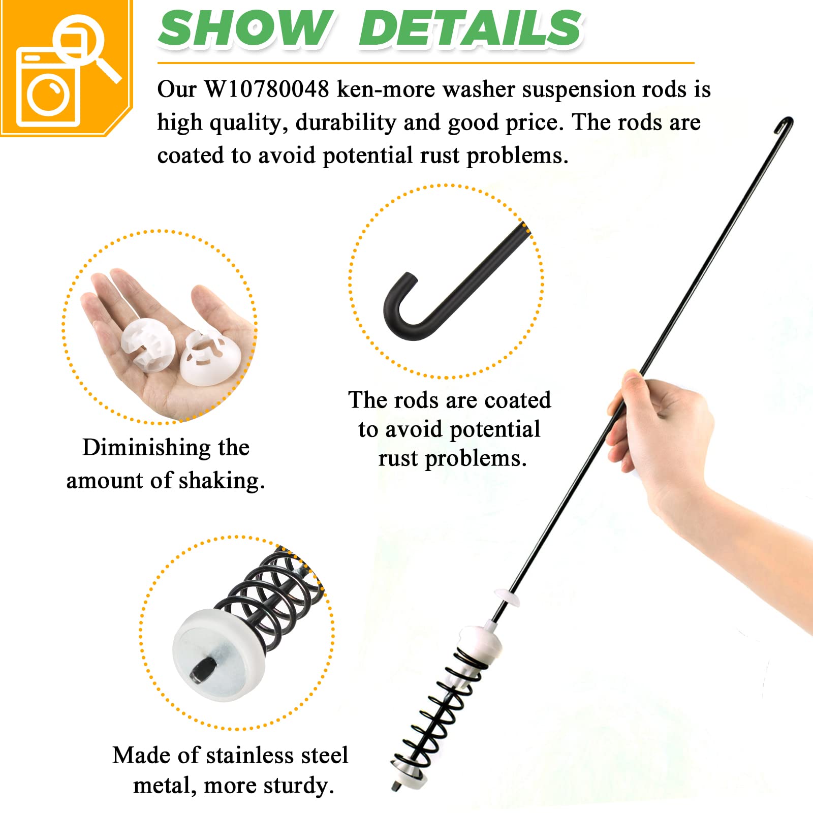 ✔✔【ITEM SPECIALITY】2026 Upgraded W10780048 Washer Suspension Rod Kit support the washing machine washing tub and balance the washing machine under unbalanced conditions to reduce vibration. If one or more of the suspension rods for kenmore washer W10780048 is broken, the washer will vibrate or shake. The unbalanced load error "UL" in cabrio style machines is often caused by faulty suspension. Please check and replace the suspension rod in time to help restrain the vibrate or shake of the washing machine tub. Our W10780048 kenmore washer suspension rods is high quality, durability and good price