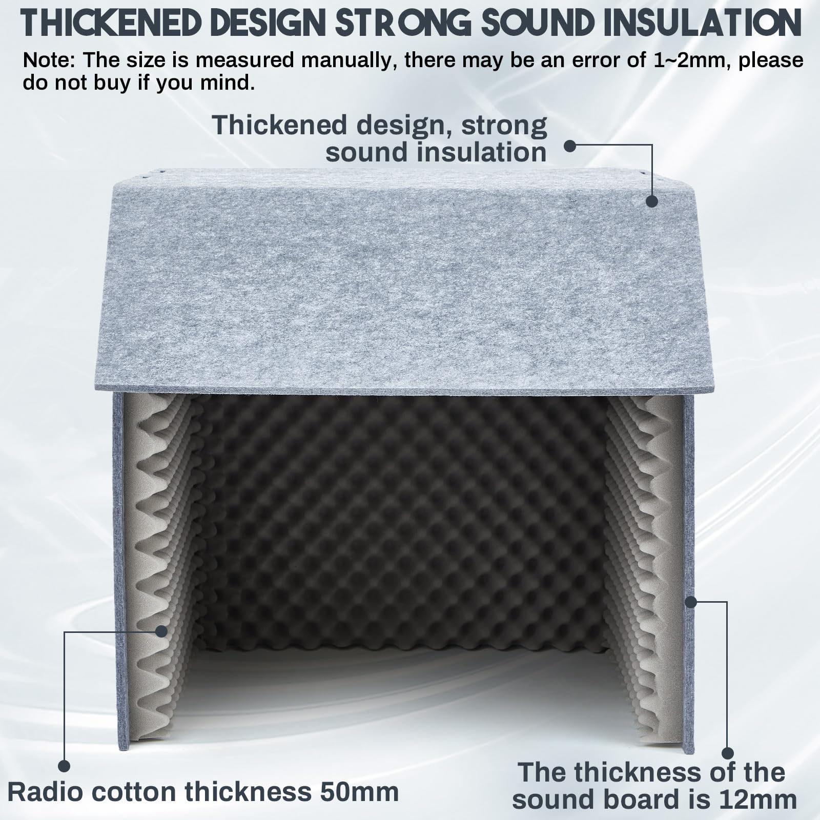 Exquisite Material and Design: the desktop soundproof cover crafted with acoustic cotton and polyester fibre, this desktop soundproof cover, also known as a recording booth or microphone isolation booth cube, incorporates a multi layer efficient sound-absorbing design; The shell is comprised of a 12 mm thick sounding board and 50 mm thick sounding cotton, ensuring a clearer sound for majority of your recording needs