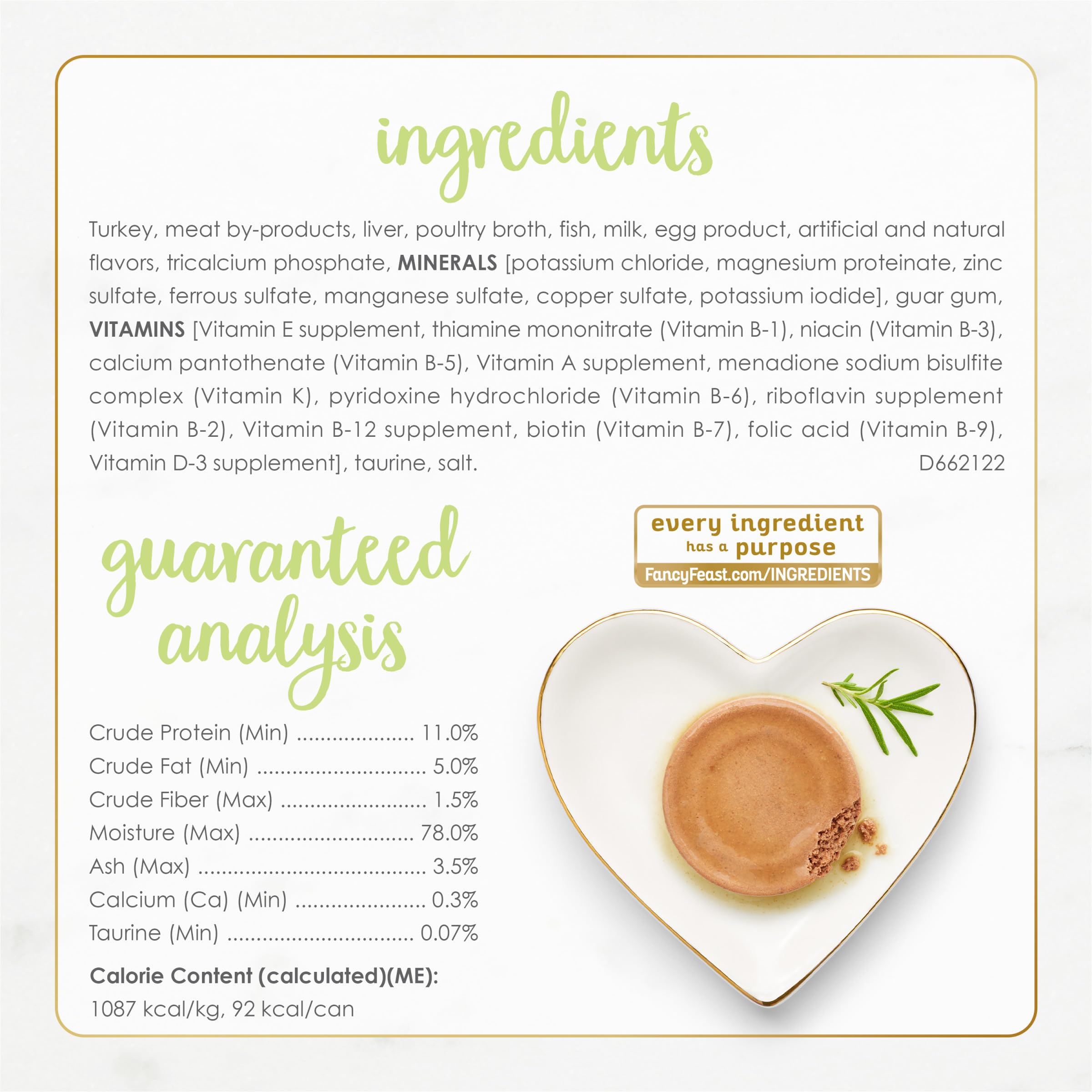 Even the littlest kittens deserve the best in life, which is why Purina Fancy Feast Kitten Tender Turkey Feast wet cat food is designed just for her little tastes and needs. Watch her delight in the smooth texture that's just right for tiny teeth and the tempting gourmet flavor that kittens love as she begins a lifelong love of flavor-filled gourmet cat food. Providing 100 percent complete and balanced nutrition for kittens and made with responsibly sourced ingredients, this delectable little dish helps you begin caring for her needs along with providing her with exciting mealtime options. It's made with real milk to help her transition from nursing to eating, making it an ideal option for weaning your litter of kittens. Giving her her first little bites of turkey in an easy-to-digest pate, this Purina Fancy Feast Kitten Tender Turkey Feast features essential vitamins and minerals to help her on her way to a long and healthy life of love with you.