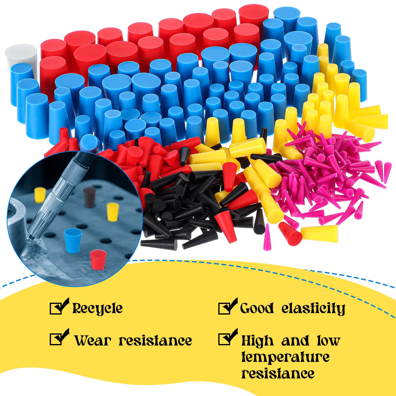 Silicone Material: crafted from silicone material, the tapered stoppers offer remarkable resistance to wear, tear, and environmental factors; It ensures the user has dependable and stress free labor in numerous applications, with less requirement for replacements