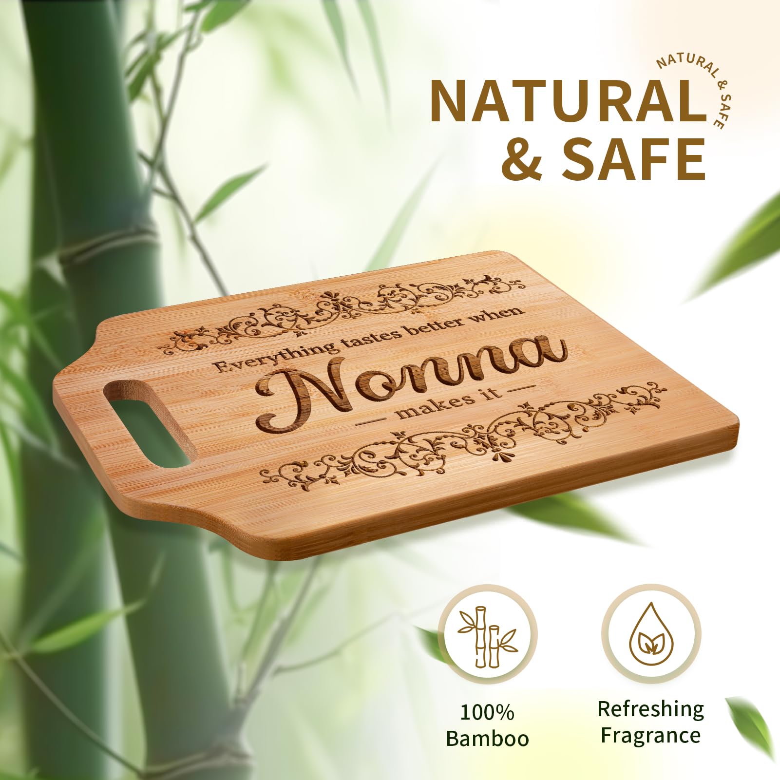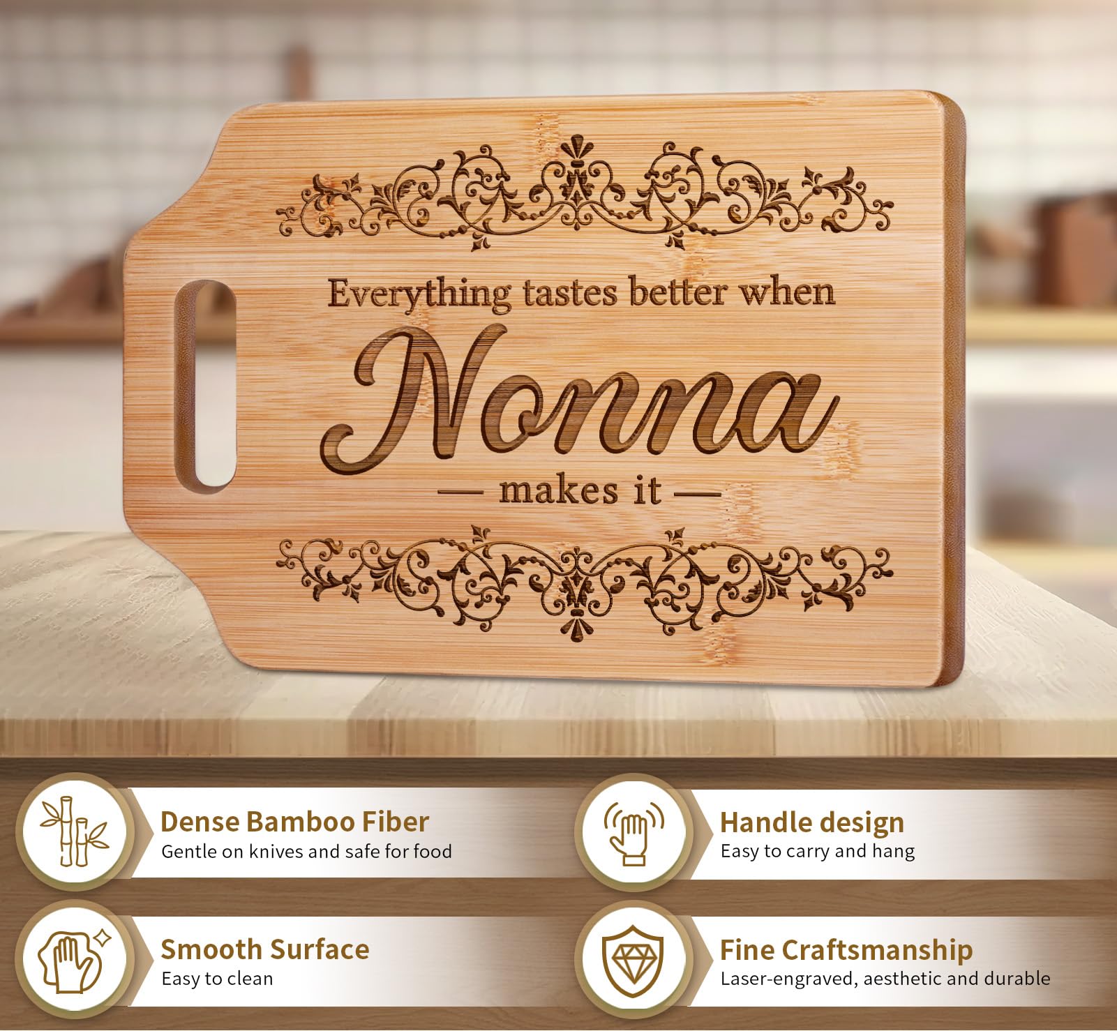 【Workmanship】AceThrills bamboo cutting boards undergo high-intensity compression and polishing, resulting in extreme durability and wear-resistance. The laser-engraved design eliminates any food safety concerns that ink printing may cause, making it the perfect gift for your nonna.