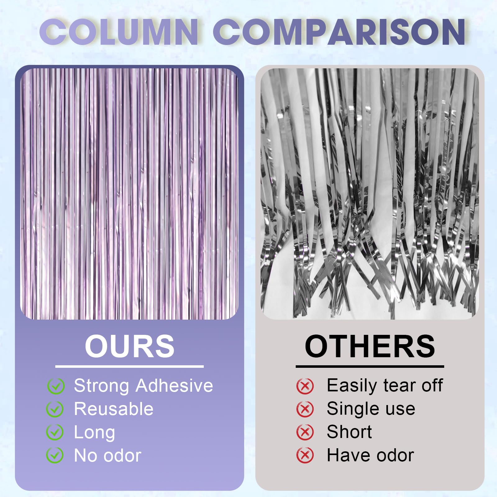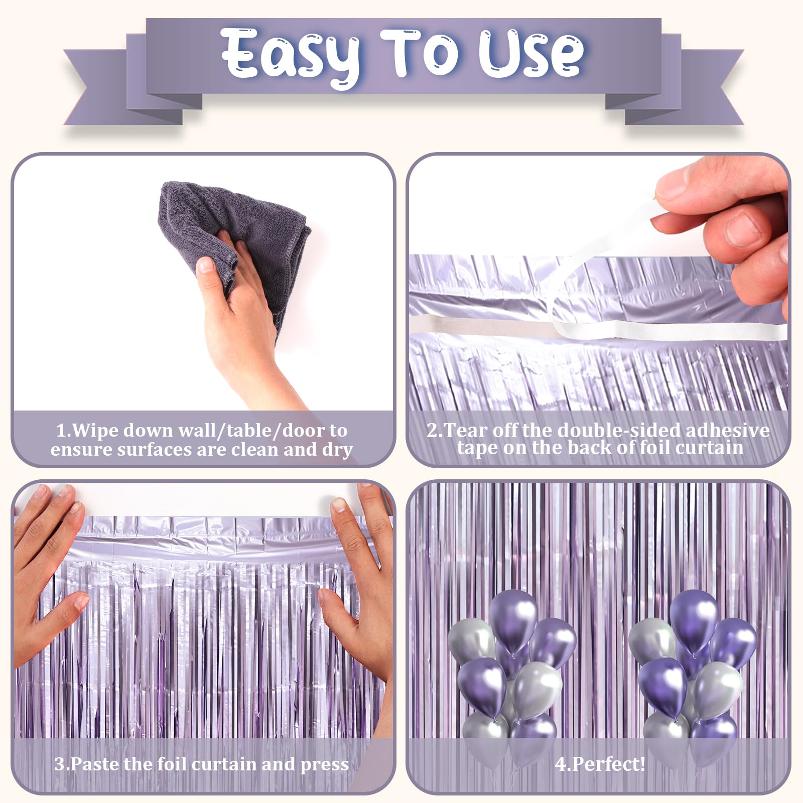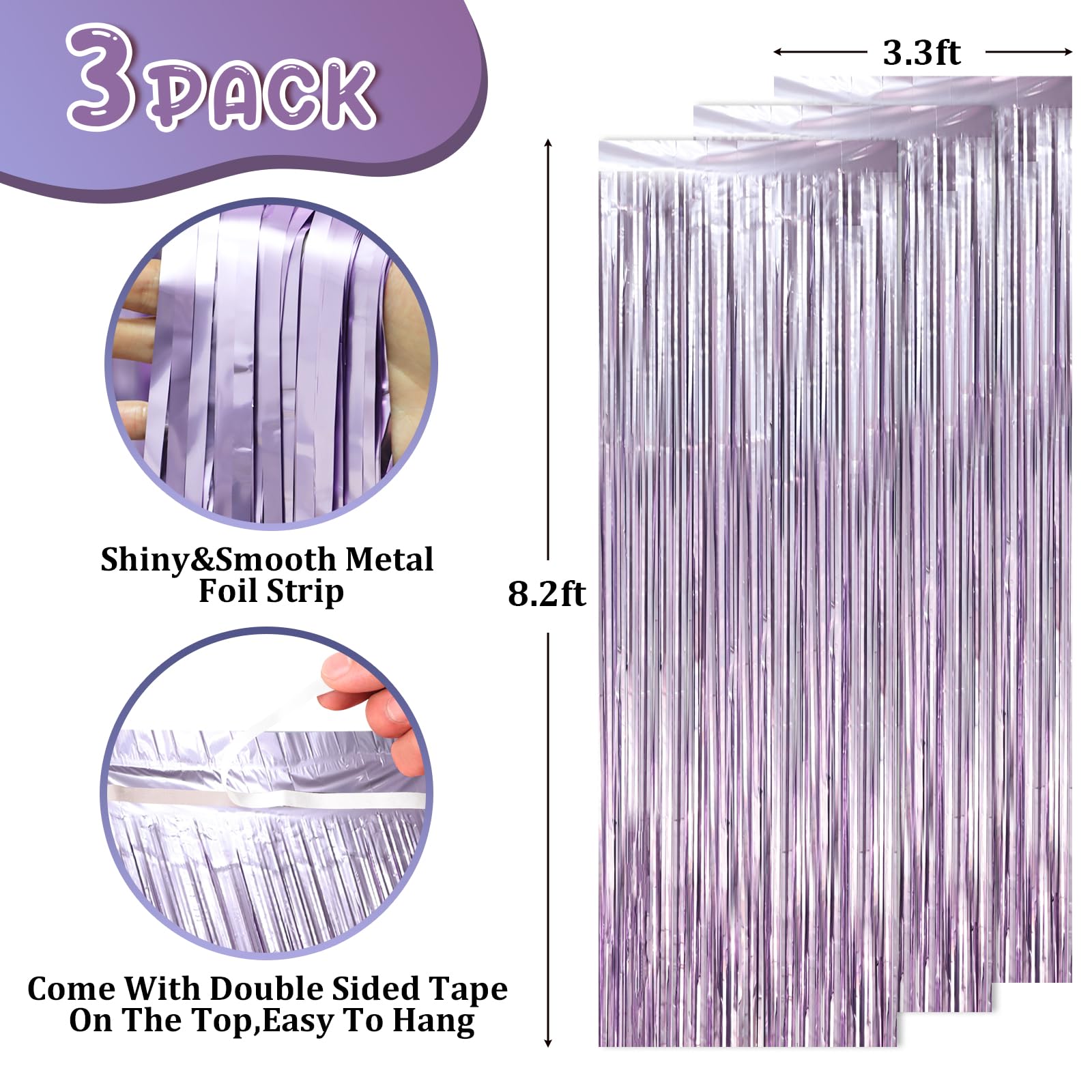 Package Included: 3 packs of light purple foil fringe curtains, the size of the foil curtain is 3.3*8.2ft. It's long enough to fit any occasion