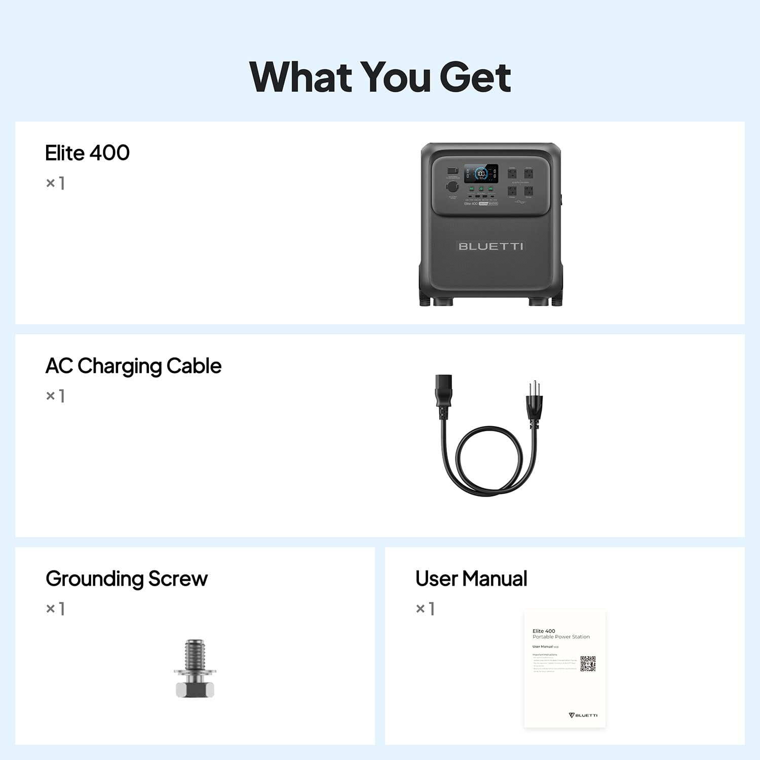 [What You Get] - BLUETTI Elite 400 portable power station, 560W Charger 1 (ππππ ππππππππππ), AC charging cable, solar charging cable, user manual.