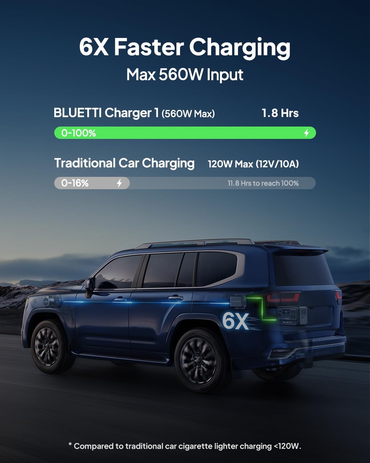 [6X Faster than Regular Car Charger] - Charger 1 charges Elite 400 portable power station at a maximum 560W input, full charge in 7.5h, 6X faster than traditional car chargers (<100W).