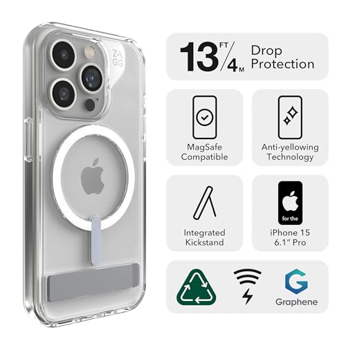 ULTIMATE IMPACT PROTECTION - Made of crystal clear scratch-resistant Graphene, one of the hardest materials on earth, the ZAGG Crystal Palace Snap Case for iPhone 15 is an extremely protective clear case with drop resistance of up to 13 feet (4m). Features a built-in kickstand.