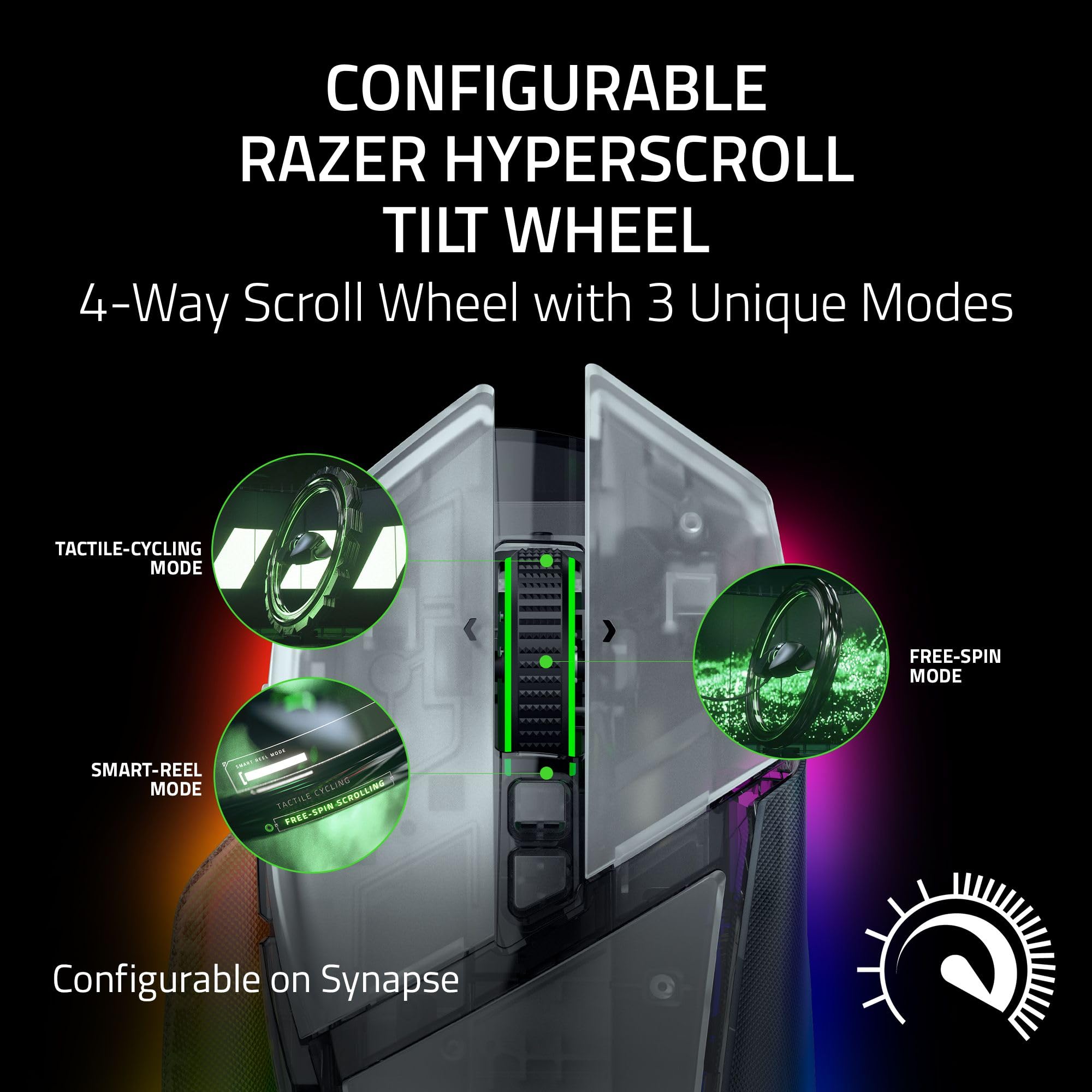 CONFIGURABLE HYPERSCROLL TILT WHEEL — Choose between tactile cycling and smooth, free-spin scrolling, or auto-switch between them based on the scroll speed in Smart-Reel mode—now configurable on Synapse