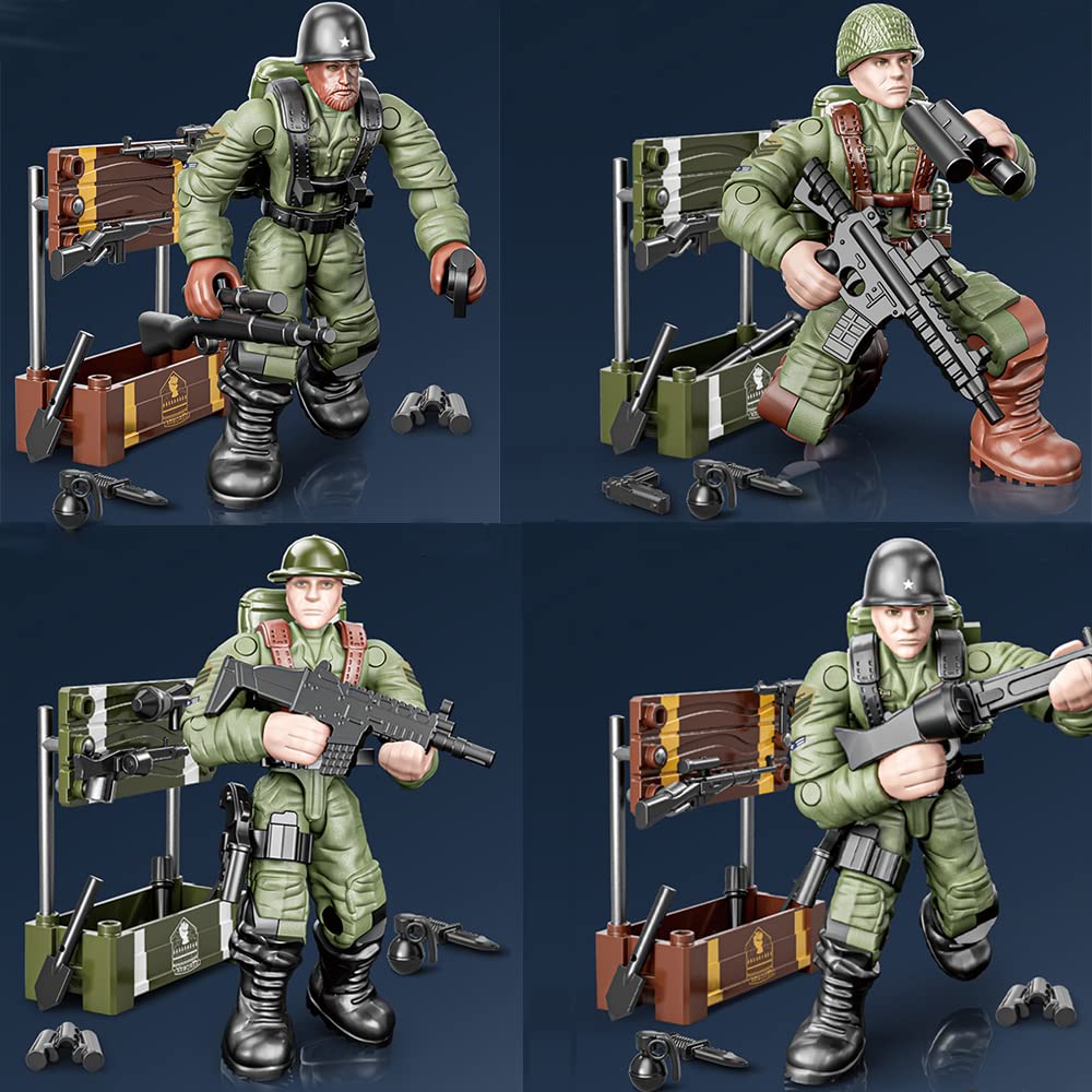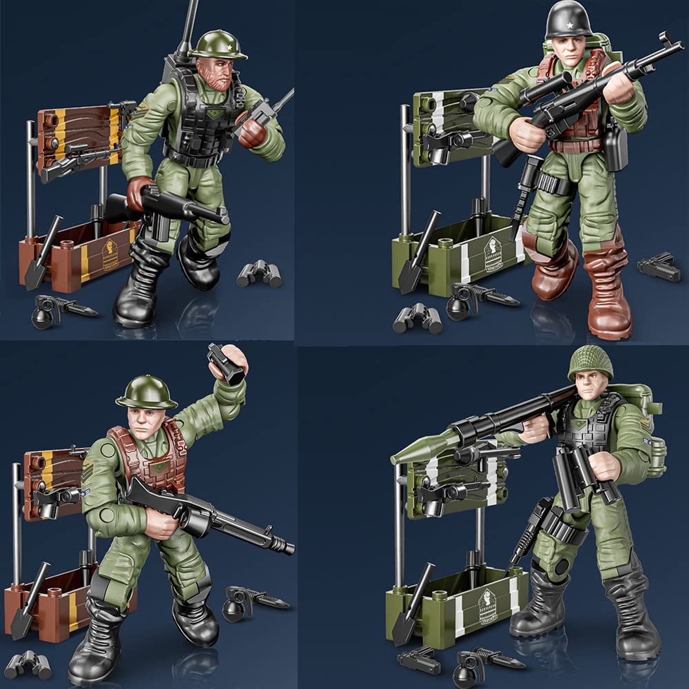 【8 PCS Military Mini Action Figures Playset】Feature 8 packs unique building blocks to build 8 distinct WWII soldiers building sets, 8 pcs fully-armed soldiers with gun weapons and accessories. You can quickly get started with your military experience with step by step instructions.