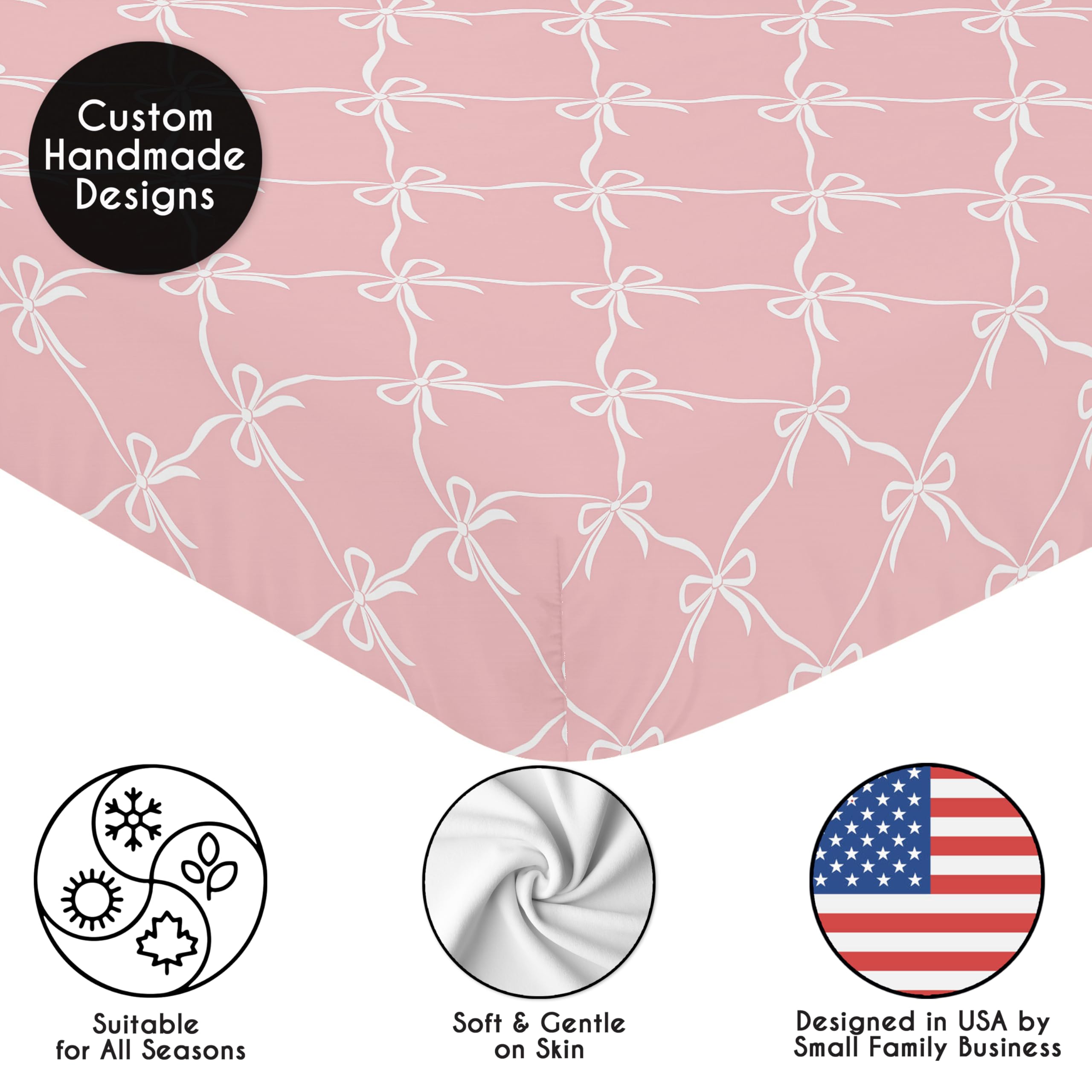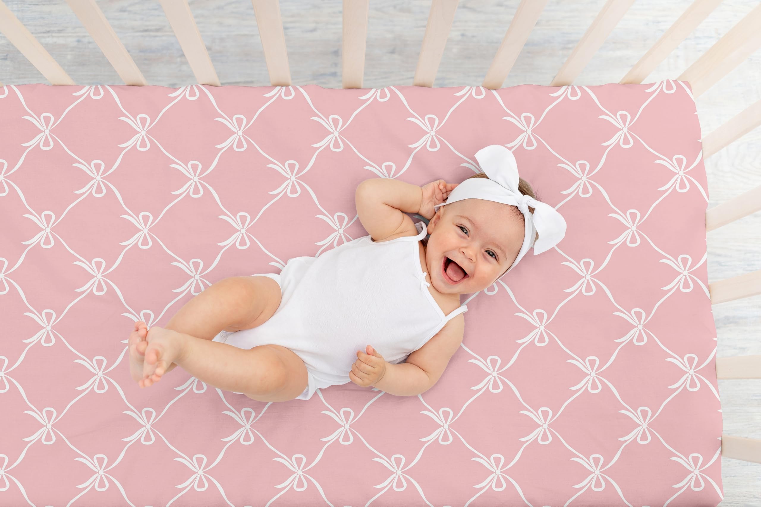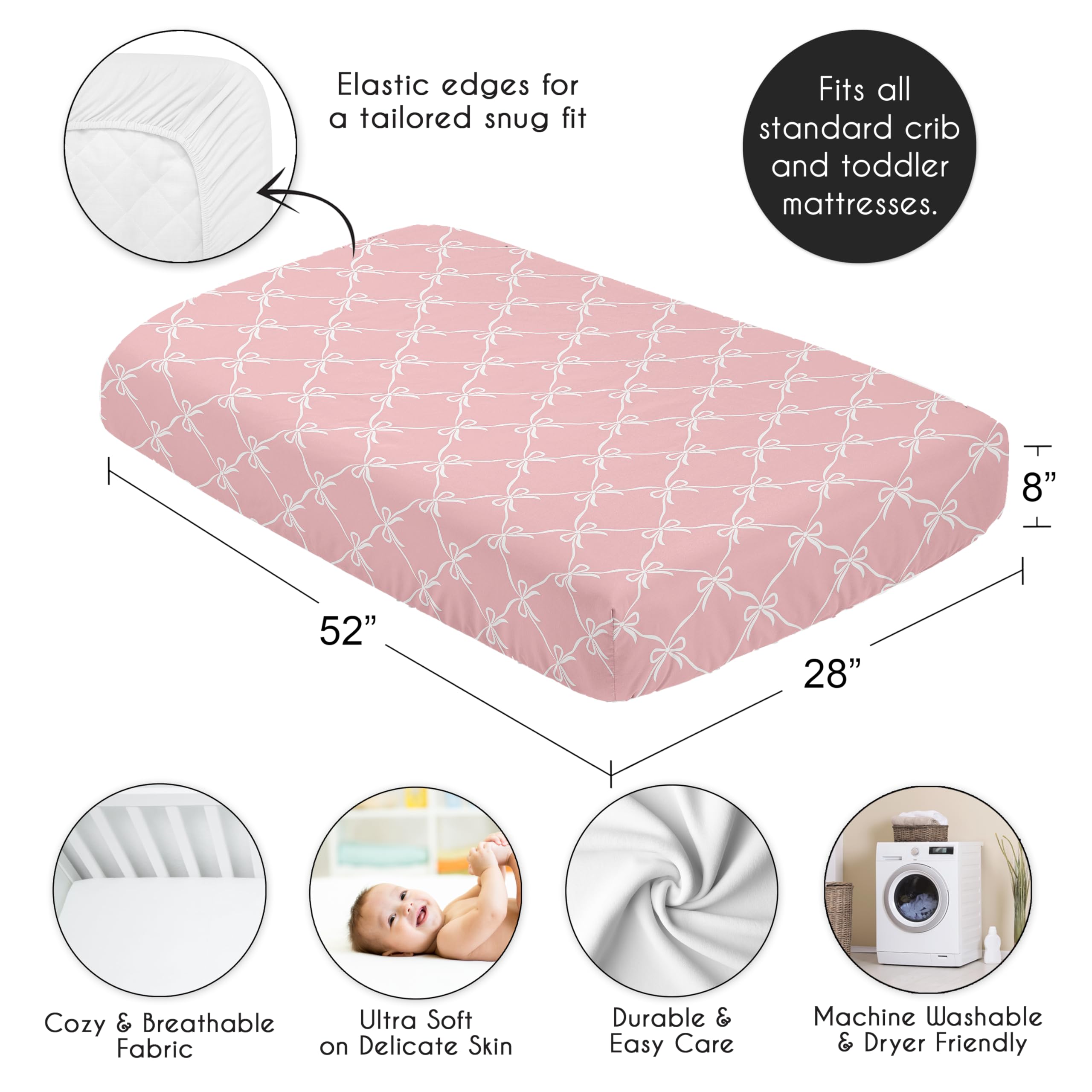 SNUG FIT: Includes (1) Fitted Crib Sheet 52in. x 28in. x 8in. Our newborn standard crib sheets fit snugly, with premium elastic sewn around the entire bottom edge for a secure fit on most standard sized cribs and toddler beds, to reduce shifting & bunching. This brushed microfiber crib sheet features an exclusive design of white & blush pink bows for the classic, elegant, shabby chic, princess ballerina and ballet collection and is gentle on delicate skin to foster a soothing sleep environment.