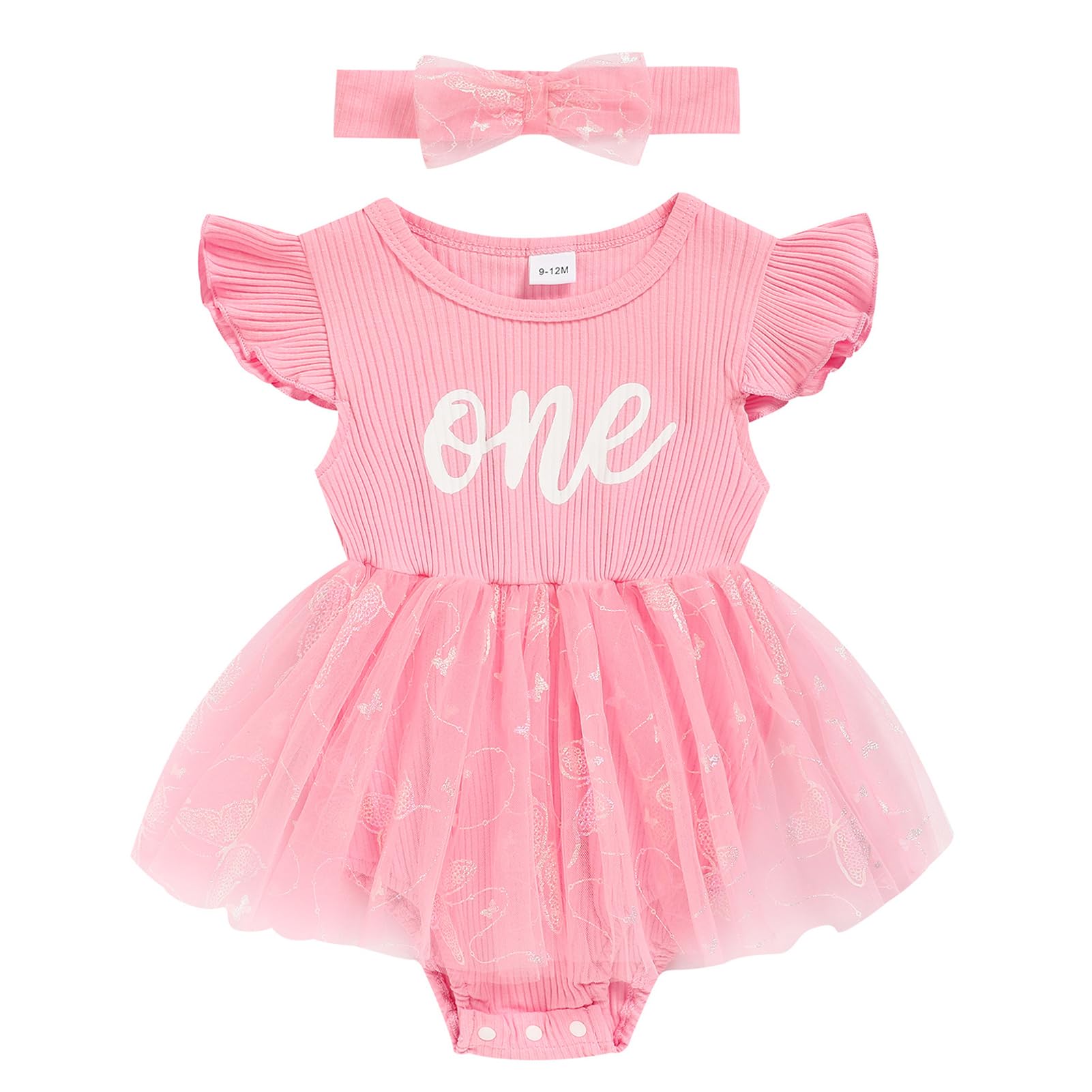 🎀 1ST BIRTHDAY ROMPER - "One" letters and lovely strawberry / butterfly / donuts print romper, three snaps for easily diaper changing, candy colors cake smash outfits, ruffle ribbed tulle one-piece clothes for your little girl's first birthday.