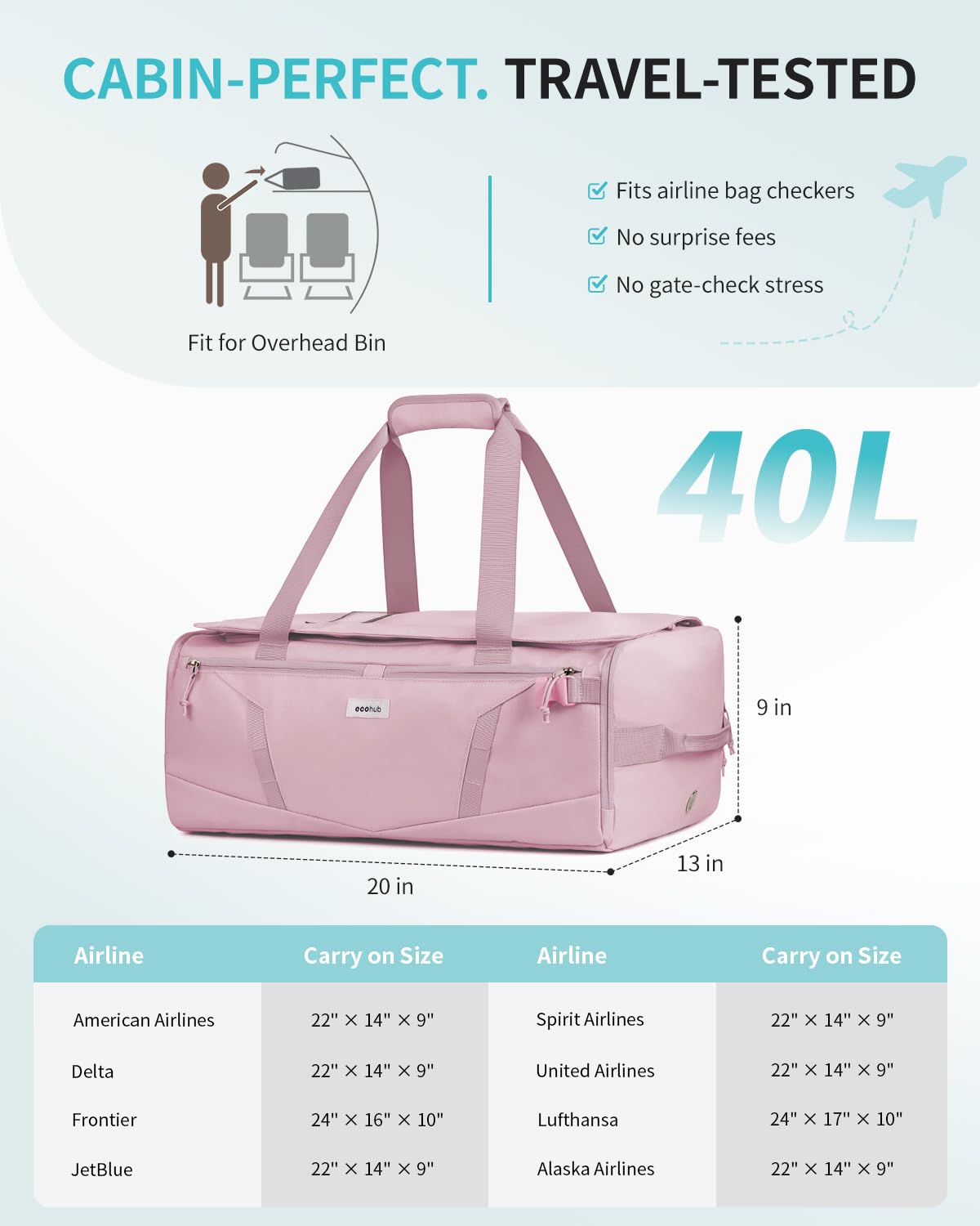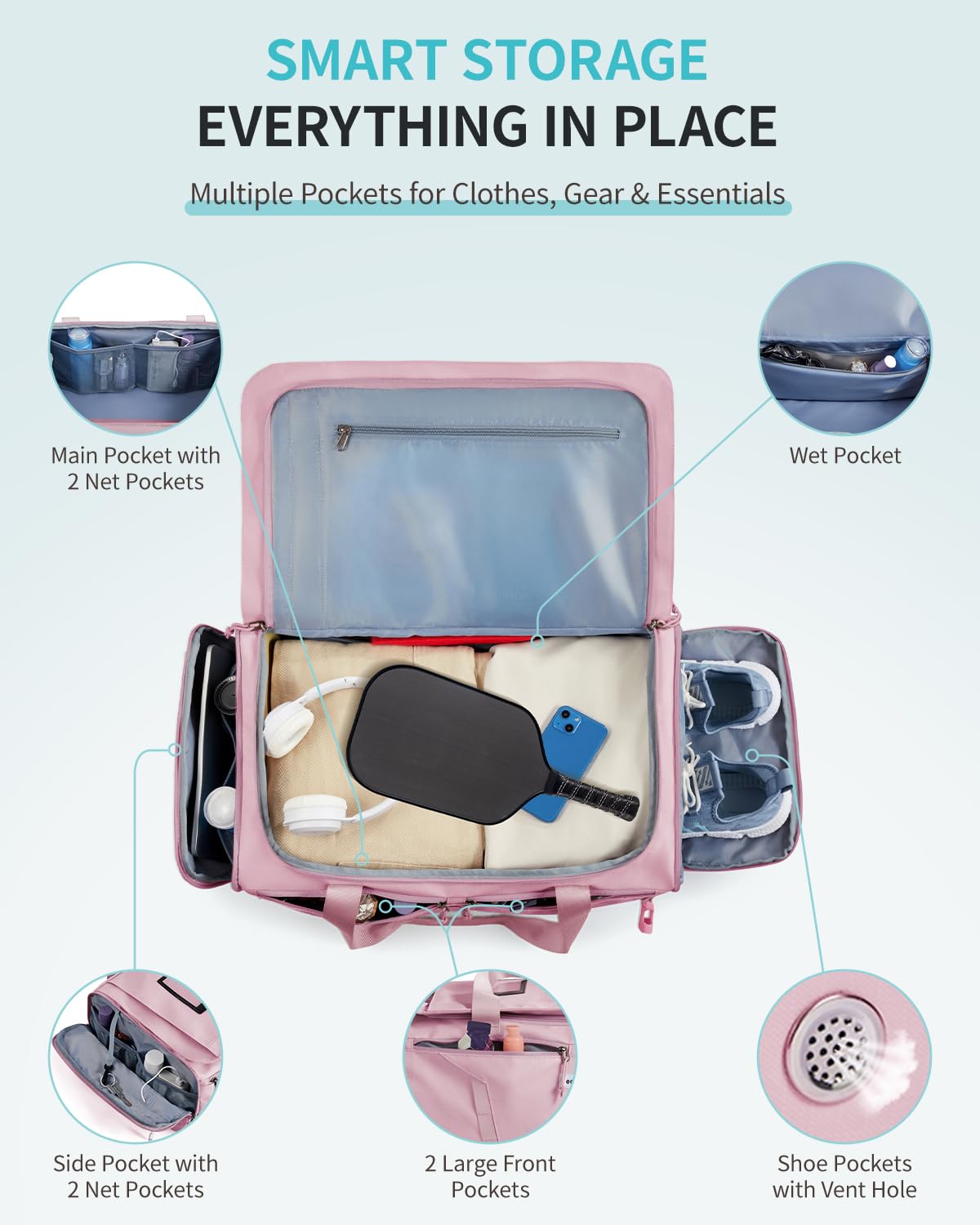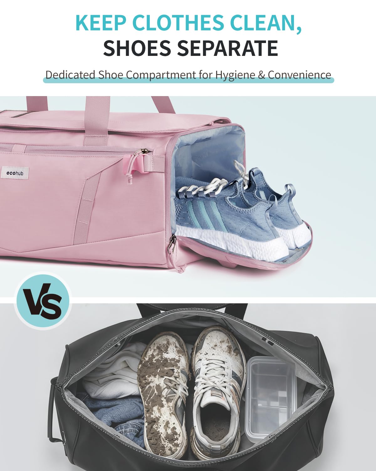 【Spacious & Organized】 40L large capacity with multiple compartments. Dedicated ventilated shoe compartment keeps your sneakers or dirty gear apart from clean clothes, making post-gym packing more hygienic. Built-in waterproof wet pocket holds damp towels or swimwear, while multiple interior and exterior pockets keep essentials organized.