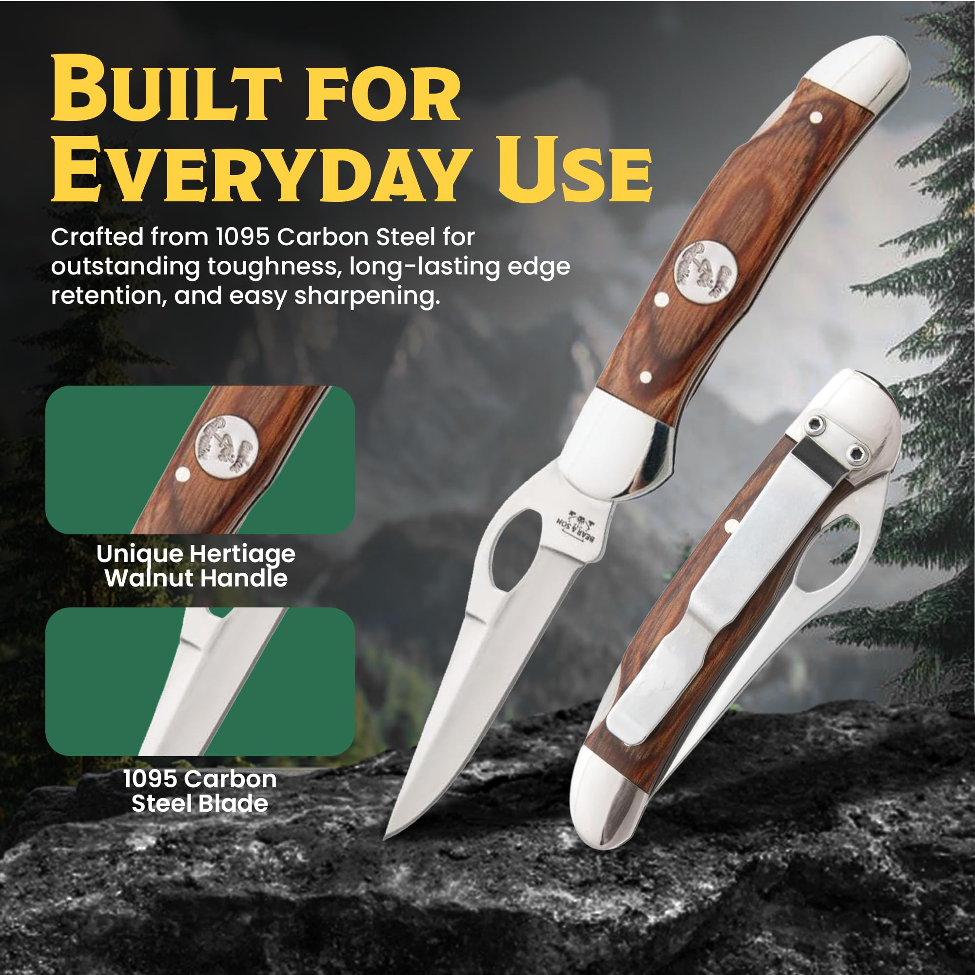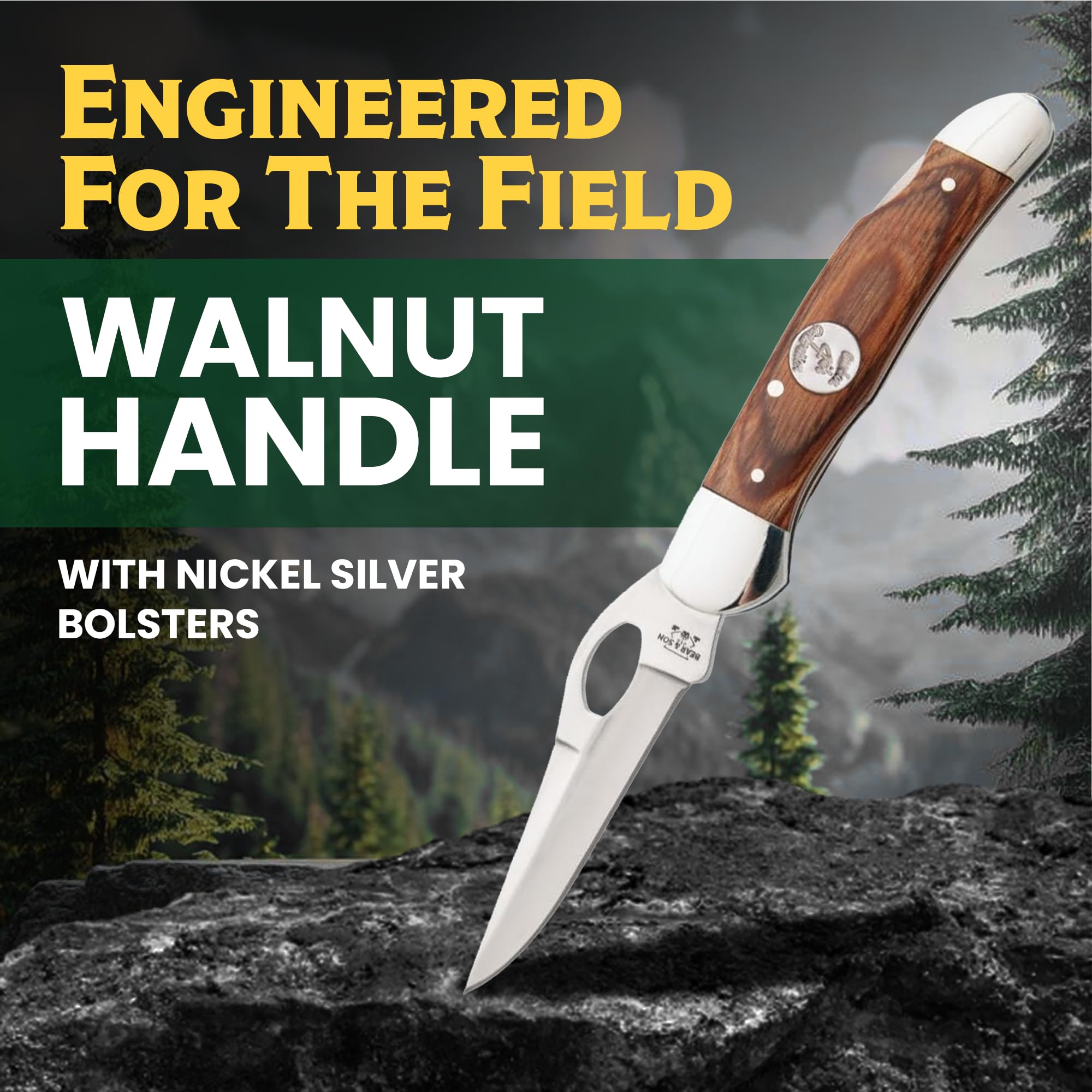 HERITAGE DESIGN & AMERICAN CRAFTSMANSHIP — The 4th Generation Bear & Son Cowhand Knife blends traditional style with dependable function. Handcrafted in the USA with a heritage walnut handle and nickel silver bolsters, it delivers durability, comfort, and timeless appeal for collectors and everyday users alike.