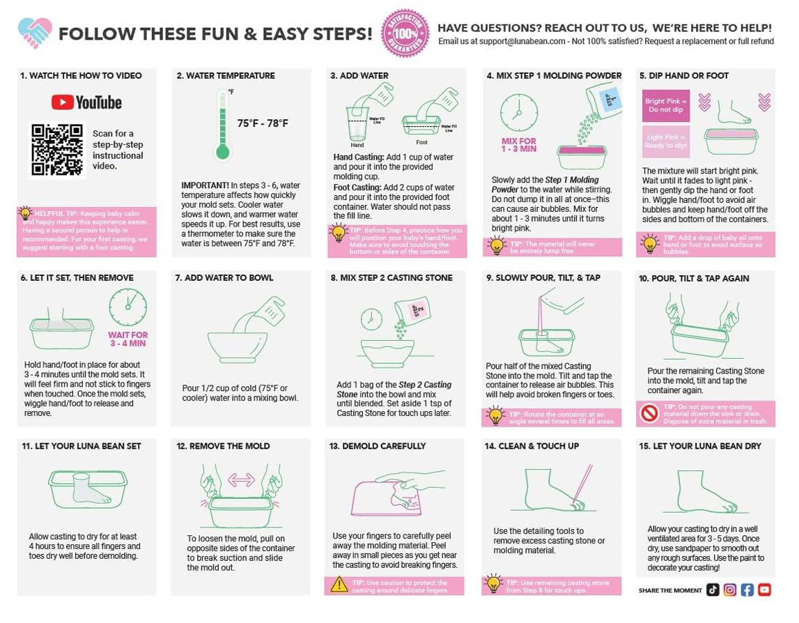 Easy DIY Baby Handprint Kit - Just mix, mold, cast, and peel away. Our baby footprint kit comes with clear, easy-to-follow instructions. If your cast doesn’t come out perfect, just send us a photo—we’re here to help you get it right.