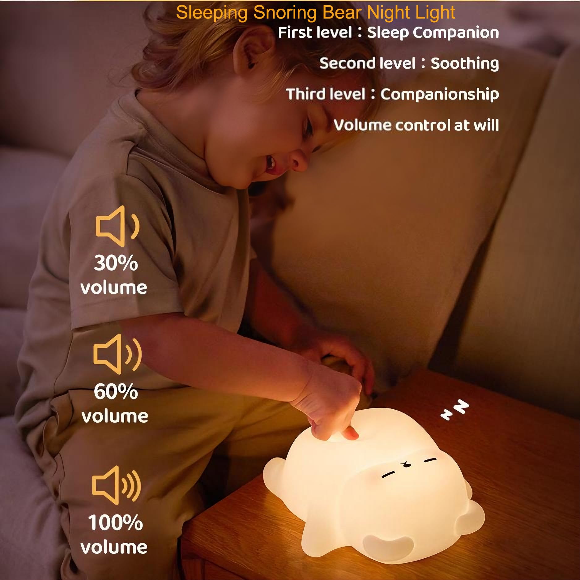 Adjustable Brightness And sound:Snoring Bear Lamp has 3 Level Adjustable Warm Light,30% Low brightness,60% Atmosphere lighting,100% High brightness lighting,Just tap lightly to switch between different brightness levels!soft brightness,eye friendly.Can Be Used As A Bedside Lamp For Kids And Adults,kawaii design as Cute Room Decor Night Light,for Bedroom,Living Room study 3 levels of sound adjustment,can turn off the snoring sound by switching the sound button or clicking it 4 times in a row.