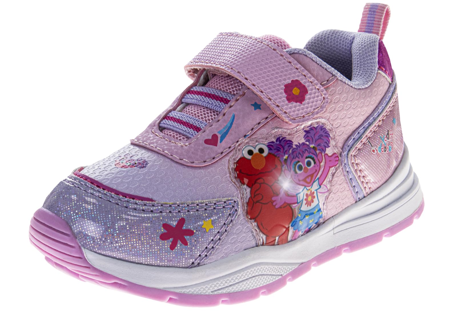 KIDS SHOES: Sesame Street light-up sneakers for toddlers and little kids with Elmo & Cookie Monster, available in black/red, navy blue, and light blue, sizes toddler 5-10, little kid 11-12.
