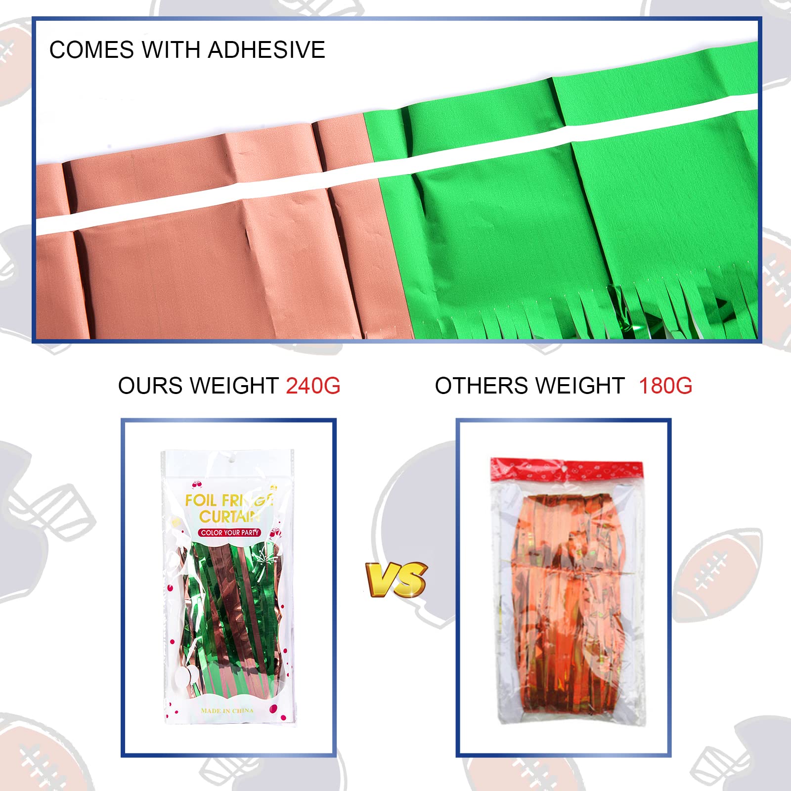 🏈 PACKAGE : 5 pack dark green and brown football themed foil fringe curtains, large size (width x drop) 3.3 x 6.6 ft each, perfect for football party decoration and Sport Game Day party decorations. These foil fringe curtains will let your football party increase more game atmosphere on Super Ball Sunday and first year down birthday party.