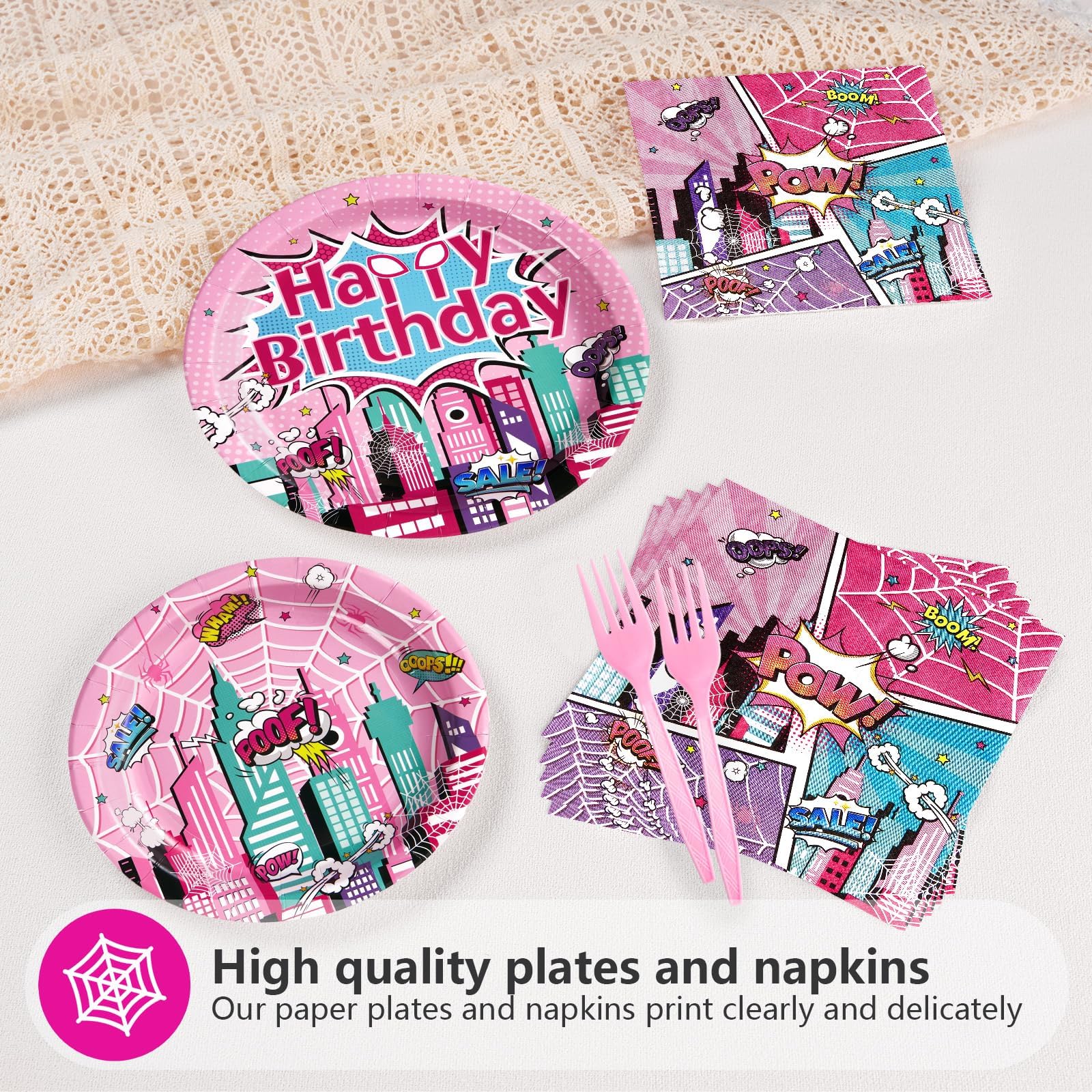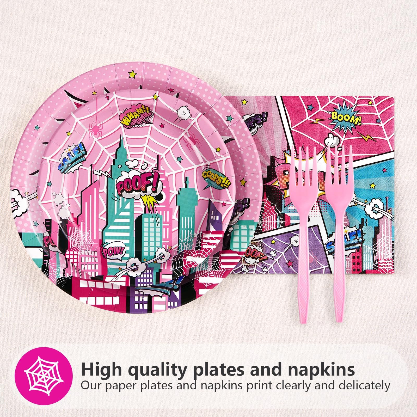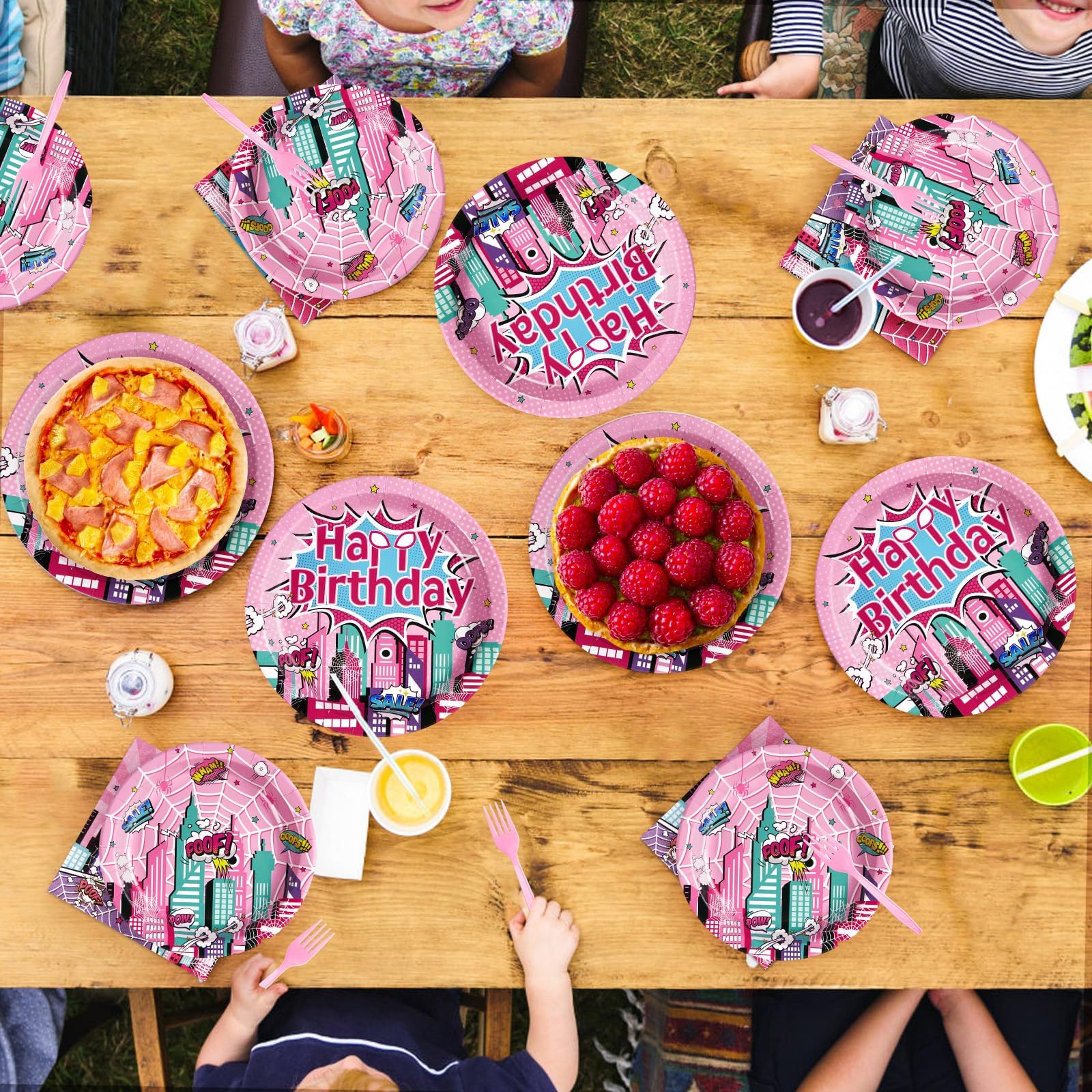 Grencian 96 Pcs Super Girl Hero Birthday Party Supplies Pink Spider Party Plates and Napkins Disposable Spider Pink Ghost Decorations Tableware Set for Girls Birthday Baby Shower Serves 24