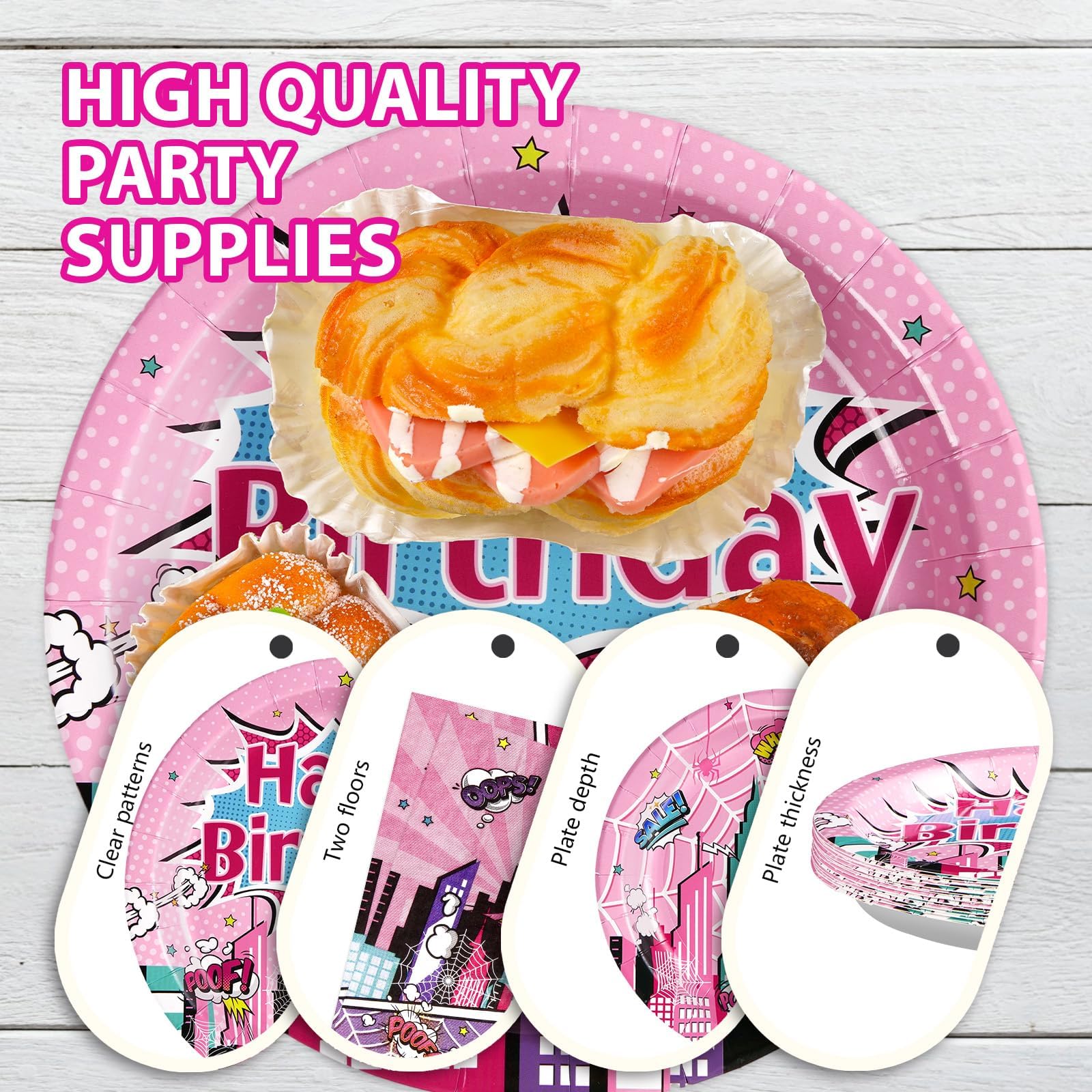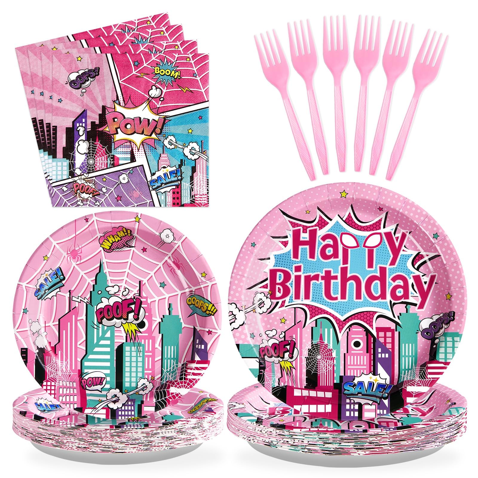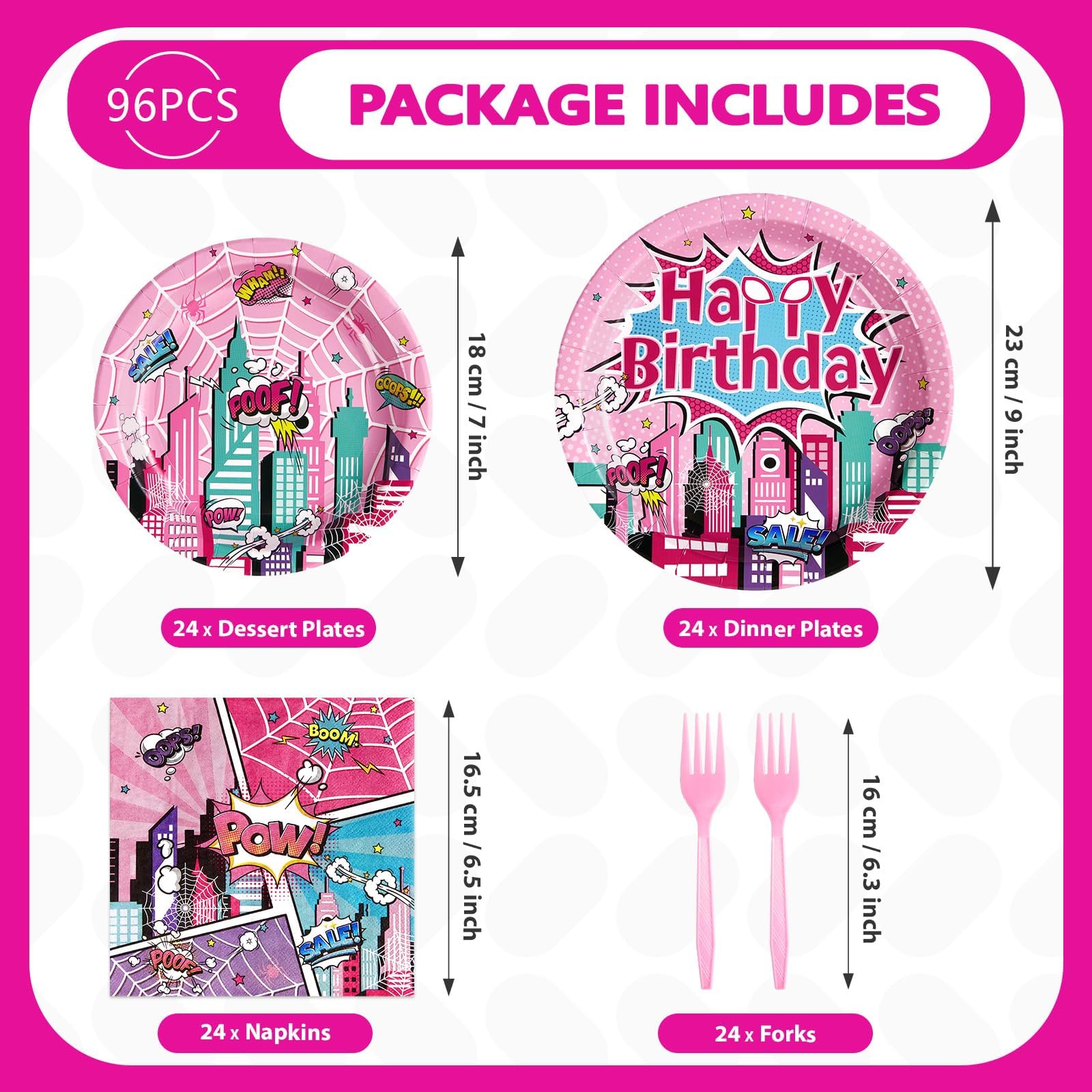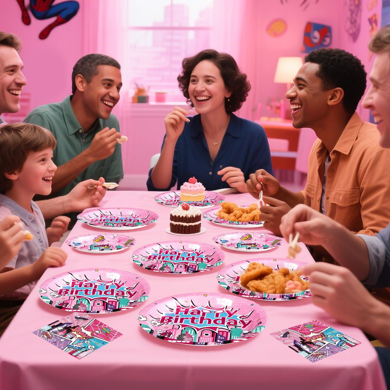 Grencian 96 Pcs Super Girl Hero Birthday Party Supplies Pink Spider Party Plates and Napkins Disposable Spider Pink Ghost Decorations Tableware Set for Girls Birthday Baby Shower Serves 24