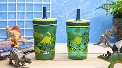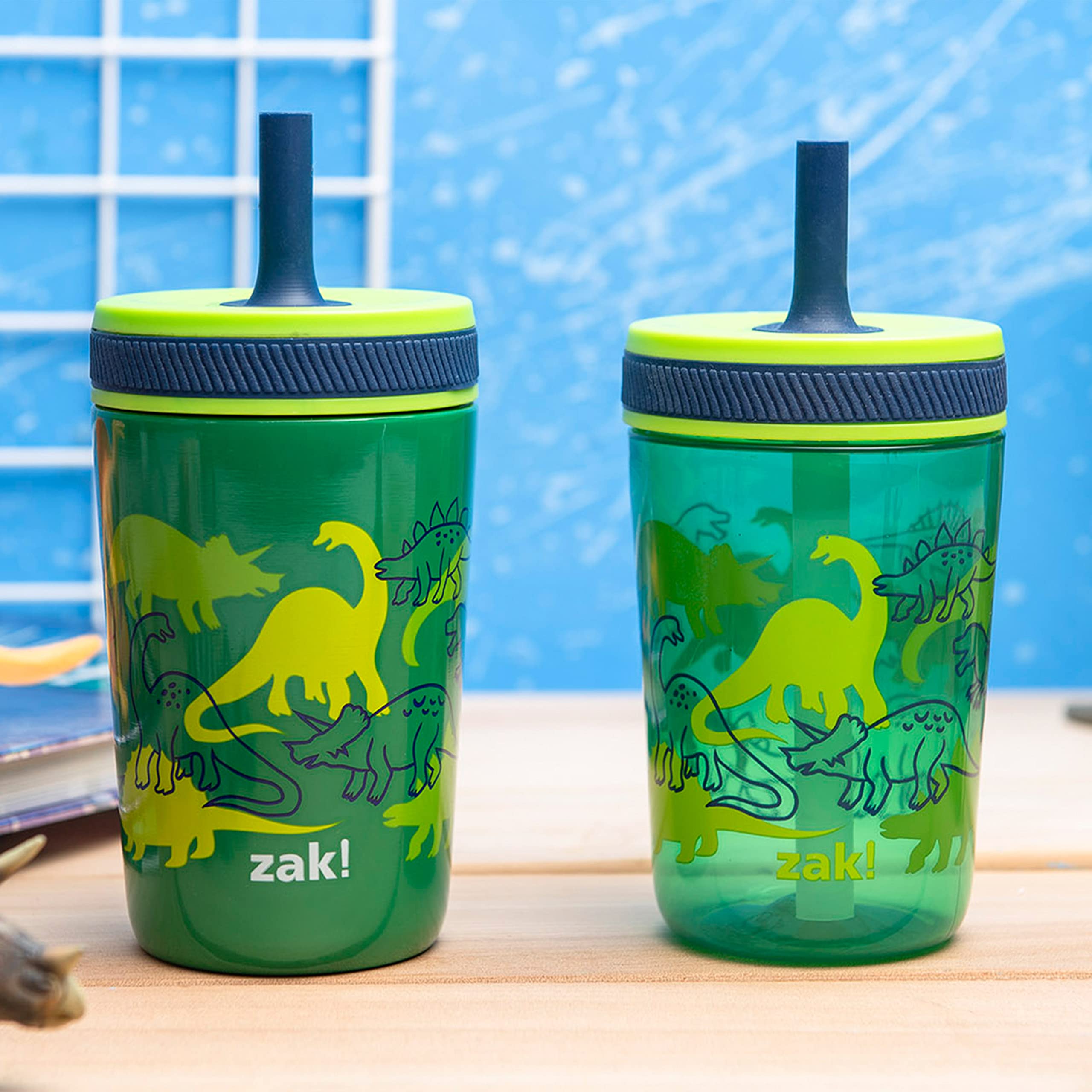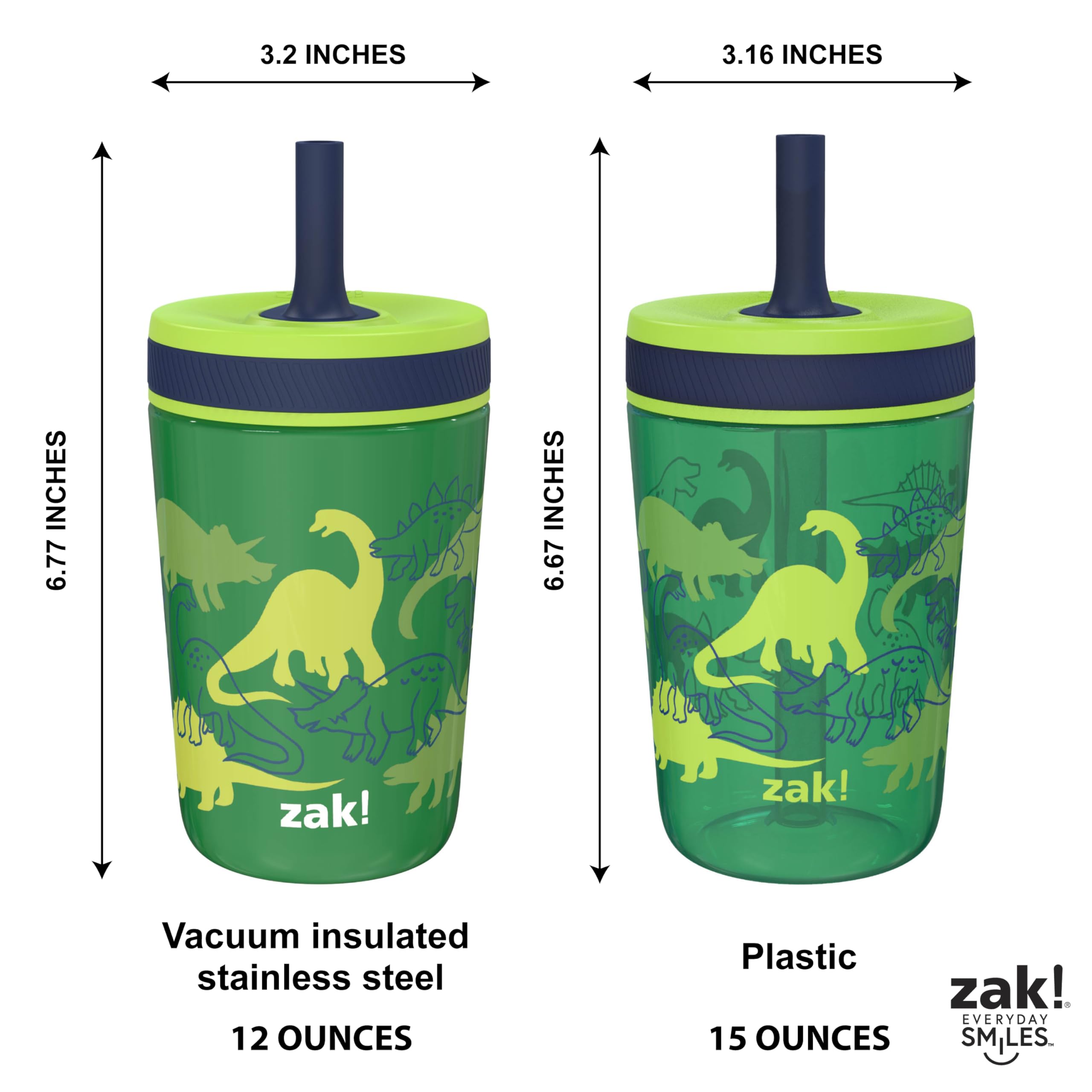 This leak-proof tumbler set from Zak Designs makes hydration fun for kids! Durable Materials: The set includes two different tumblers, one made from plastic and one made with double-wall stainless steel; both are durable enough to use every day. The comfortable straws are made from silicone, and everything is completely BPA free. Leak-Proof Straw: The straw has a built-in valve that allows liquid to flow when drinking and prevents spills when the tumbler is tipped over. It's perfect for travel or for young children graduating from sippy cups. Hydrate Anywhere: Choose lightweight plastic or double-wall stainless steel, whichever suits the situation! The tumblers won't splash or leak, making them ideal to take on the go. At home, you don't have to worry about spills around papers or electronics, and drinks stay easily accessible through the straw. Specifications: 1 plastic tumbler (15 oz), 1 stainless steel tumbler (12 oz), 1 additional sipper and straw. Made of durable plastic, stainless steel, and silicone. BPA-Free - Zak is committed to safety. Lids and plastic tumbler are top rack dishwasher safe, hand wash stainless steel tumbler; do not microwave. Design: Dino Camo.