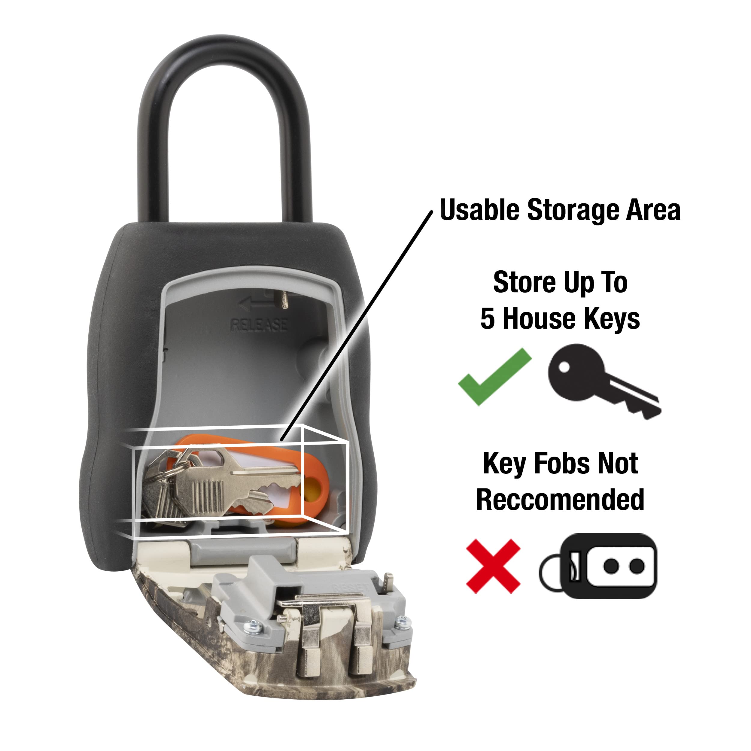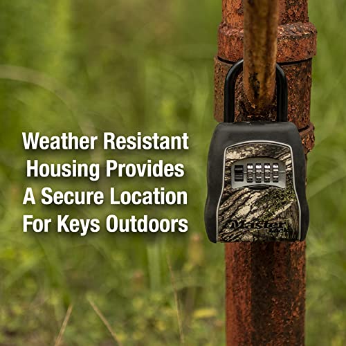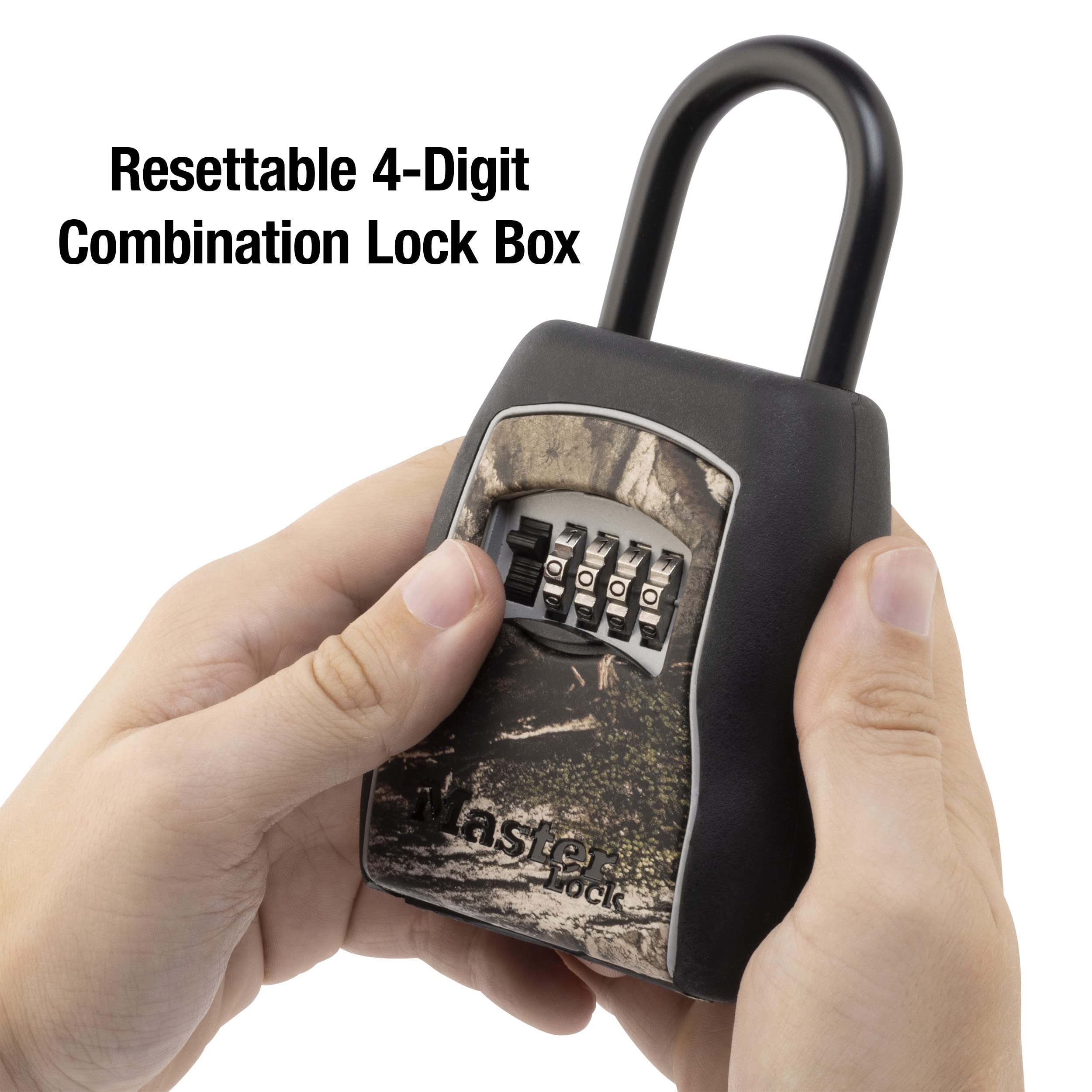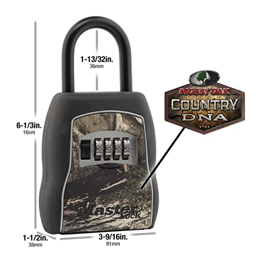 The Master Lock No. 5400DCAMODNA Portable Lock Box features a 3-1/2 in (89 mm) wide metal body for durability, featuring the Mossy Oak® Country DNA™ pattern for outdoor camouflage security. The portable design offers removable “over the knob” installation. Set your own 4-digit combination for keyless convenience and increased security. The shutter door protects combination dials from weather, dirt, and grime; and molded body and vinyl coated shackle prevent scratching. The Limited Lifetime Warranty provides peace of mind from a brand you can trust.