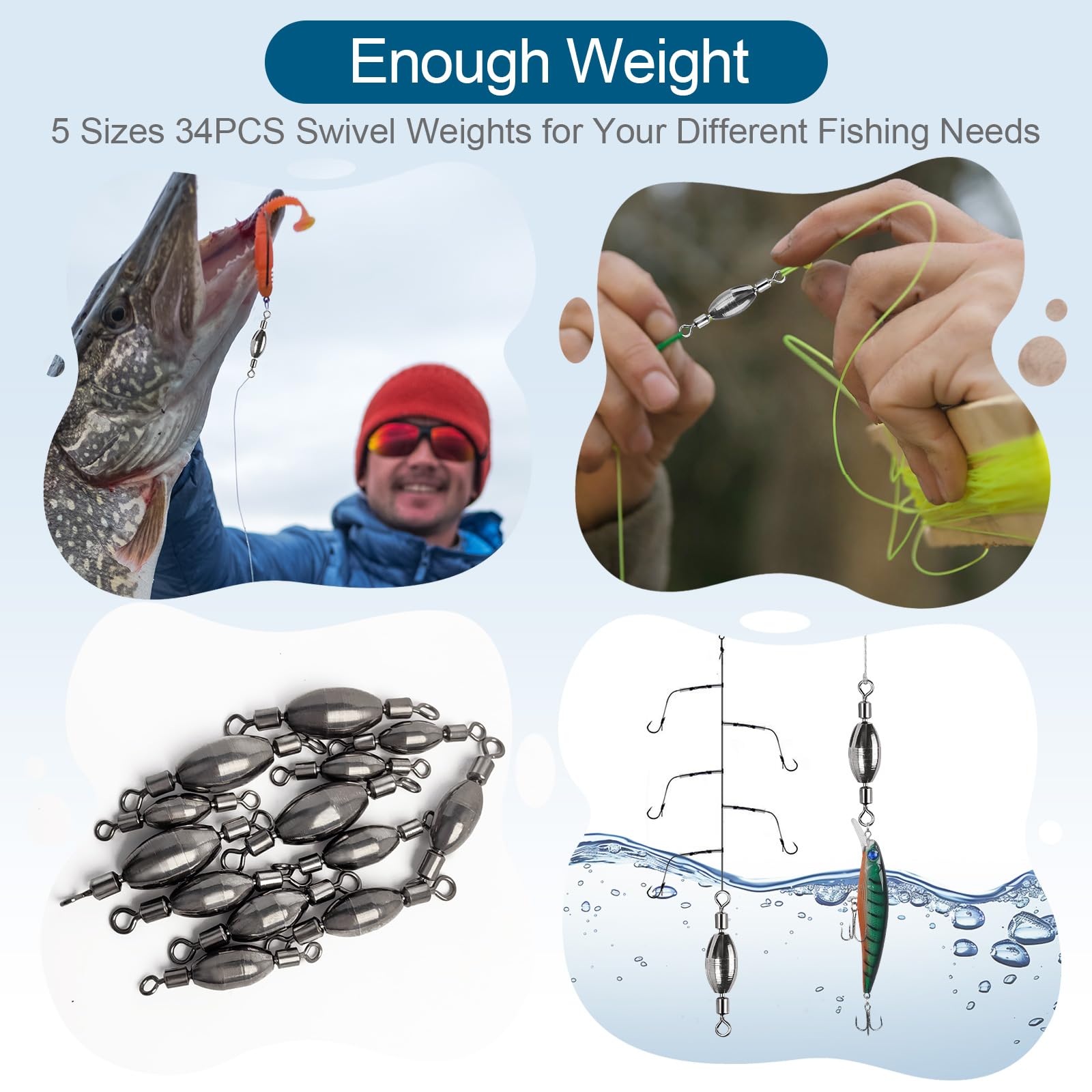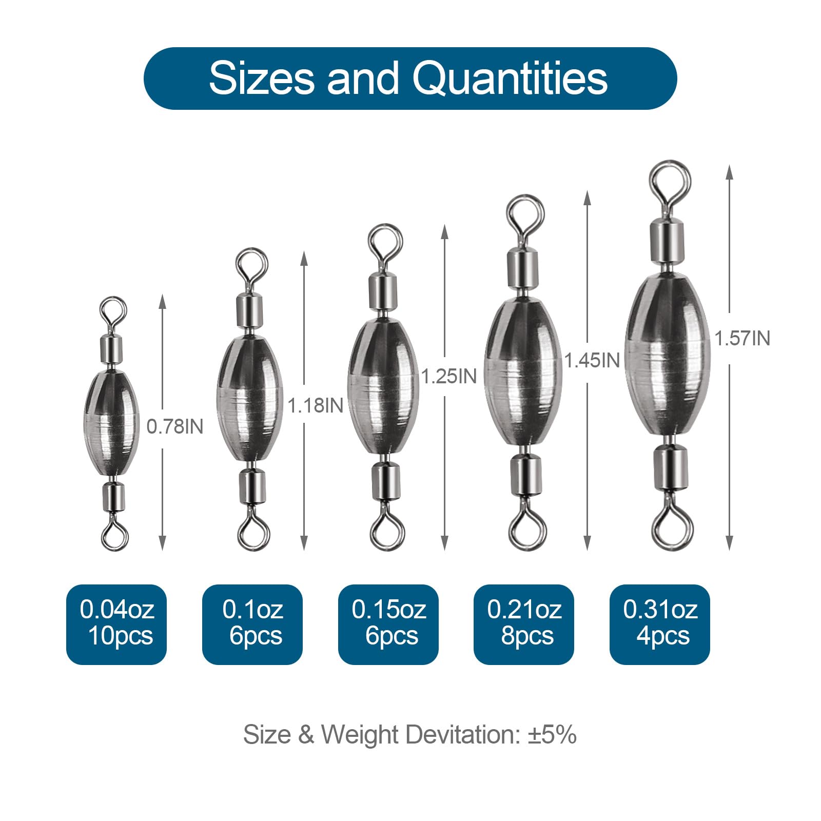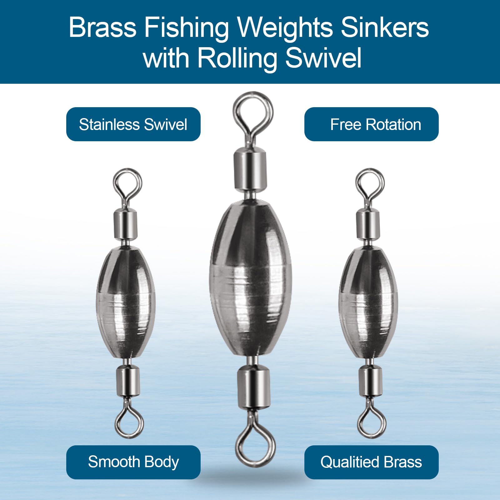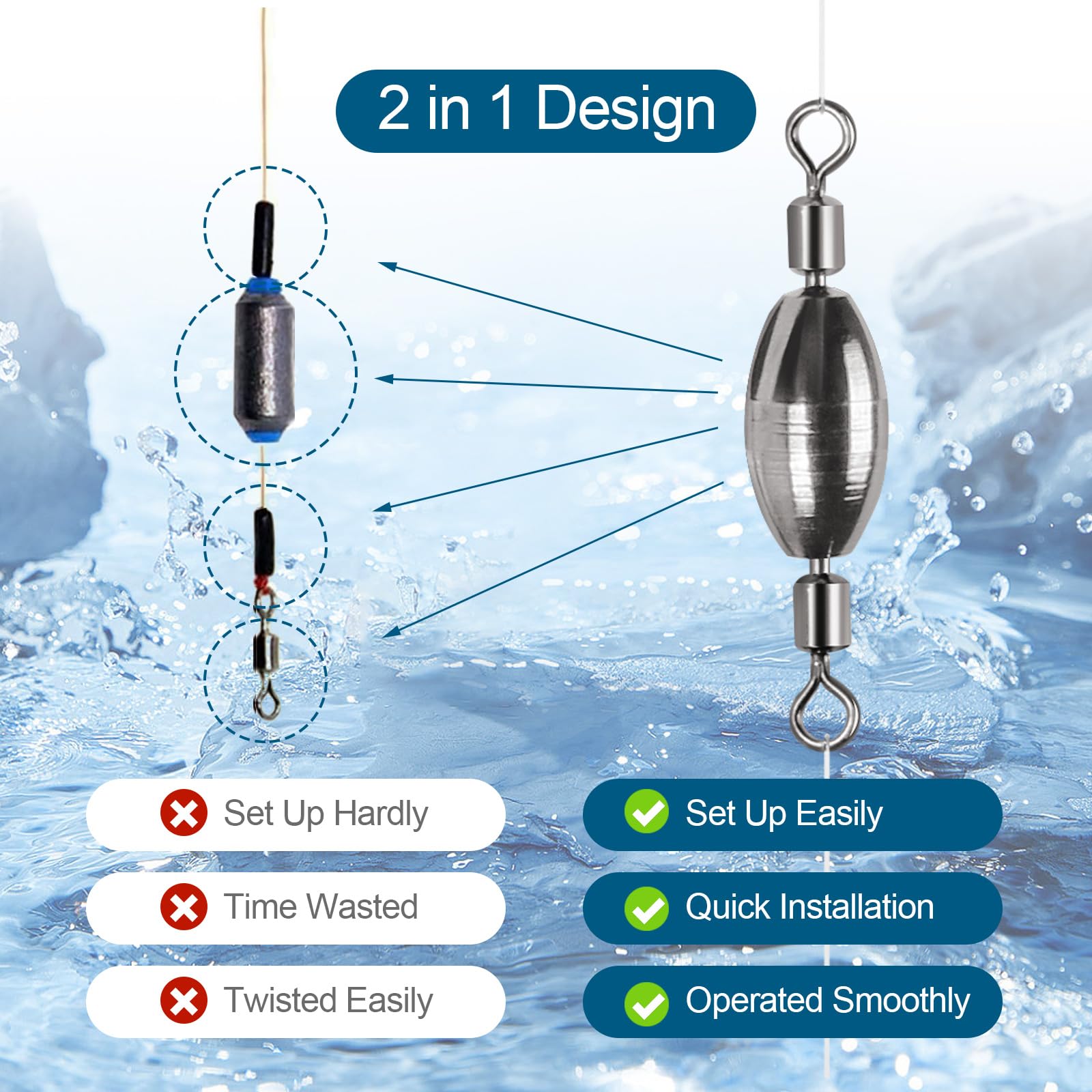 Unique Design: This fishing weights sinker with rolling swivel, 2 in 1 unique design. It combines the advantages of fishing swivel and fishing weights sinkers, which can be connected with fishing line or lure. Both end swivels of the fishing weights rotate smoothly. Streamlined surface makes the sinkers work great and come through rocks and woods without snagging.