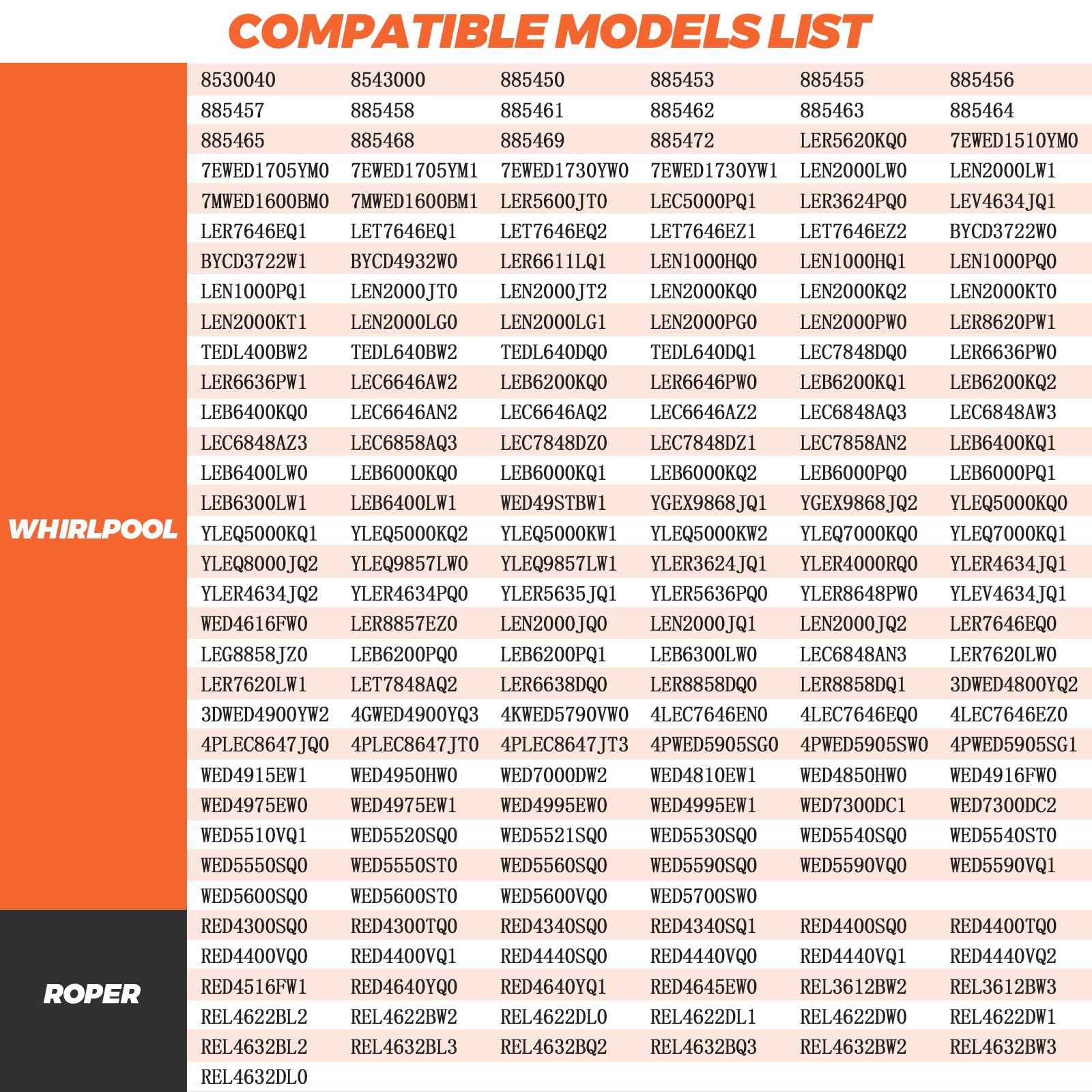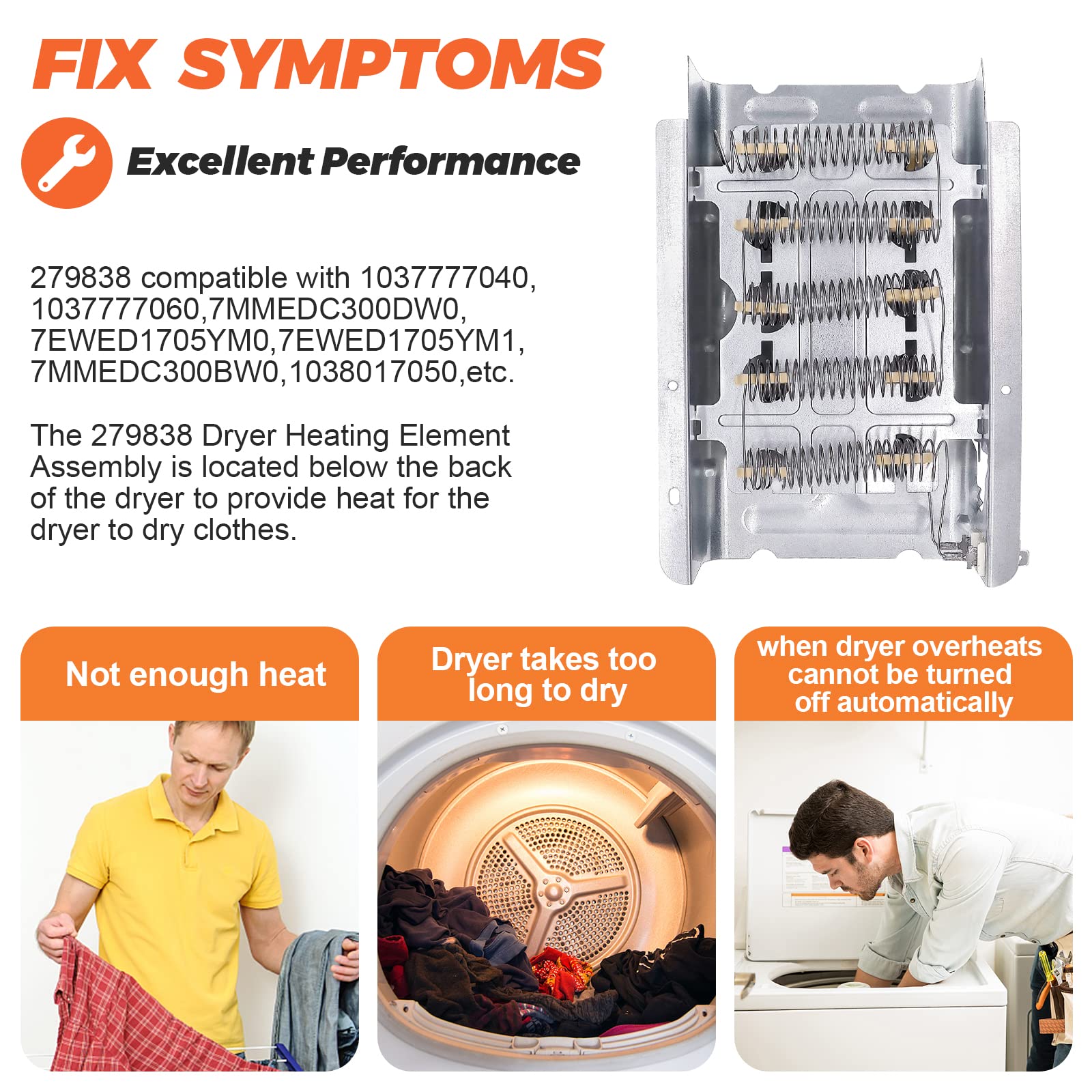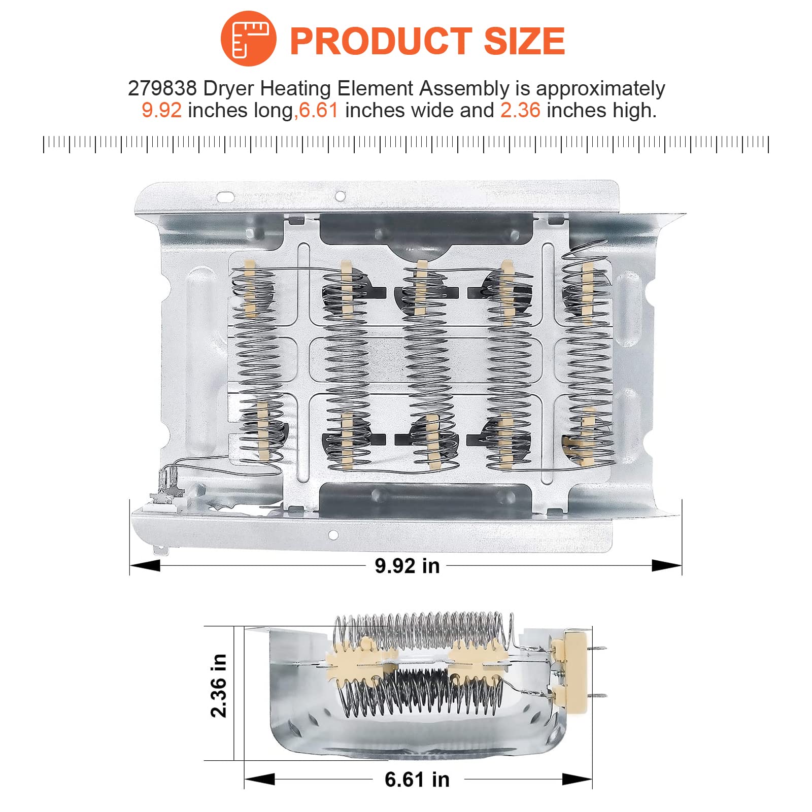 ใ๐๐ข๐ ๐ฃ๐๐ง๐๐๐๐๐๐ง๐ฌใ-- 279838 Dryer heating element replacement for Whirl-pool, Ken-more, Cro-wley, Ro-per, Est-ate, Am-ana, Adm-iral and more brand dryers. โฆReplaces part numbers: W10724237, 2438, 279837, 279838A, 279838VP, 3398064, 3403585, 8565582, AP3094254. โฆCompatible with the following models: 11096560200, 1037777000, 1037777020, 7EWED1510YM0, 7EWED1705YM0, 7EWED1705YM1, 7EWED1730YW0, LEN2000LW0, RES7745RQ0, RED4100SQ0, 7MMEP0080WW0, AED4370TQ0, AED4470TQ0, IP80000, CEDX463JQ0,etc