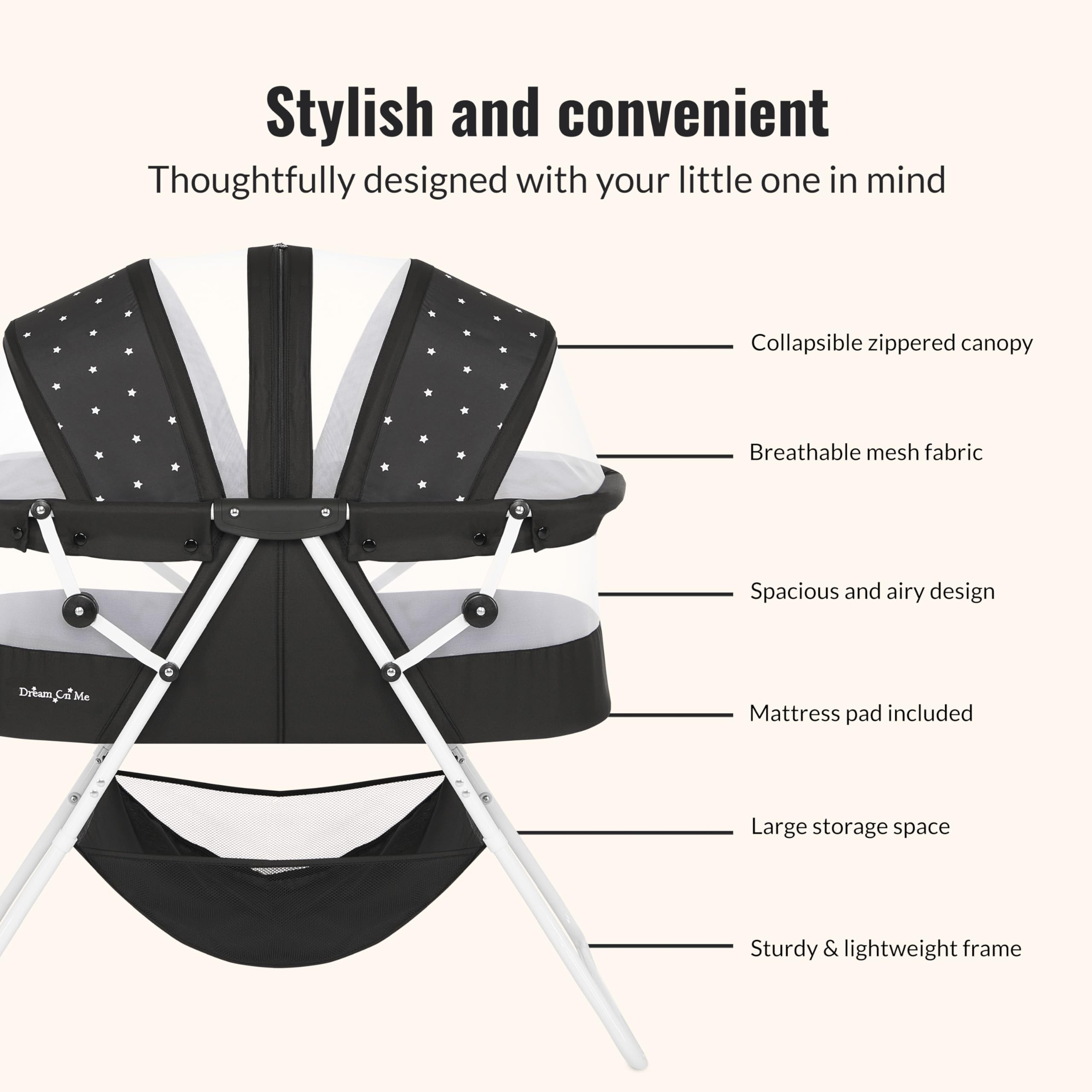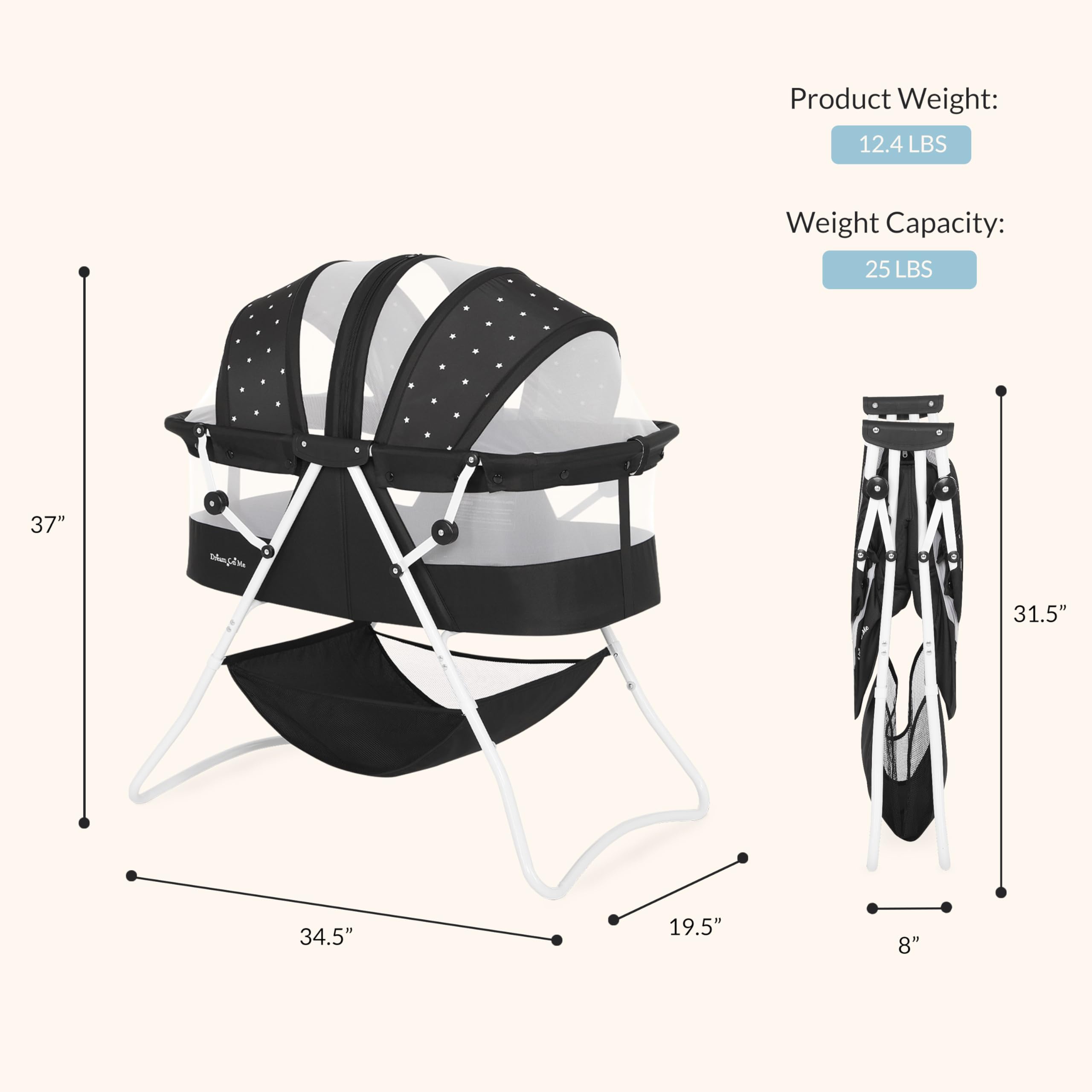 Spacious & Portable: Bassinet dimensions : 33″ L x 19.5″ W x 37″ H; Folded with carry bag – 6″ x 19.5″ x 32″; Folded without legs – 6″ x 19.5″ x 20″. Lightweight at 12.4 lbs and supports newborns up to 25 lbs.