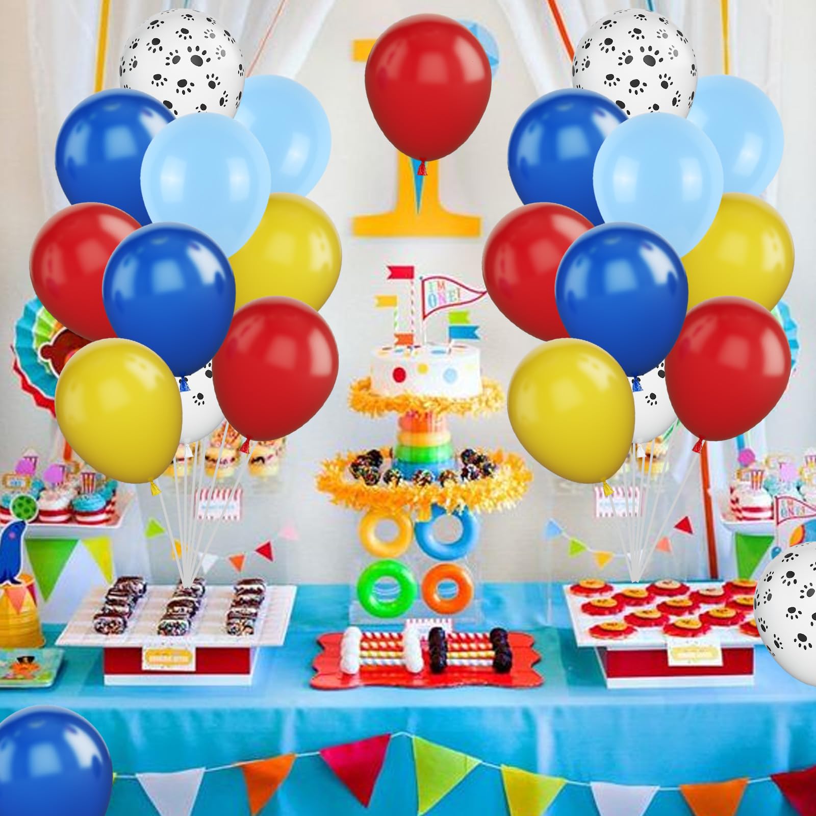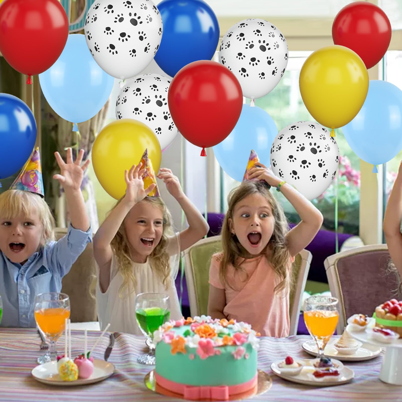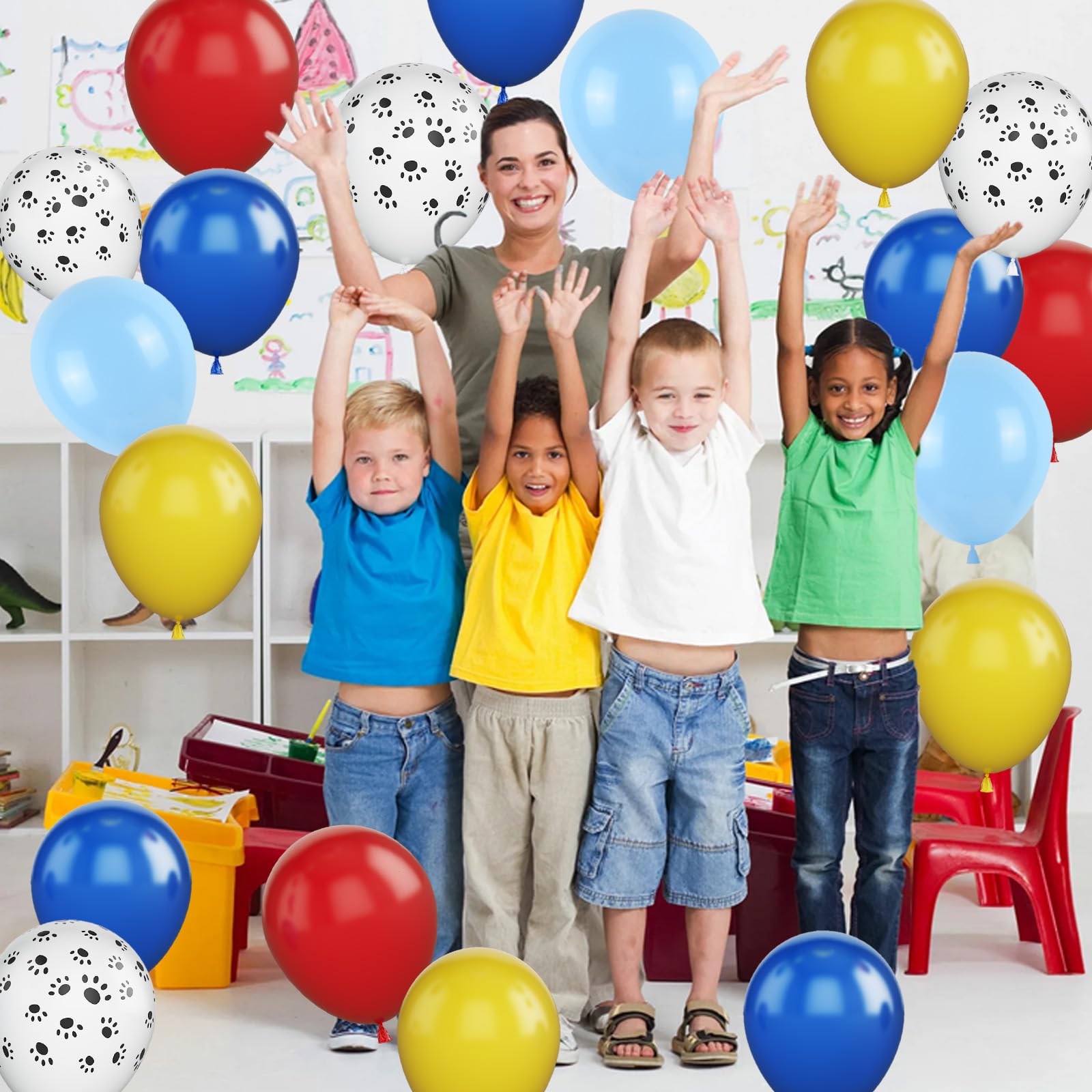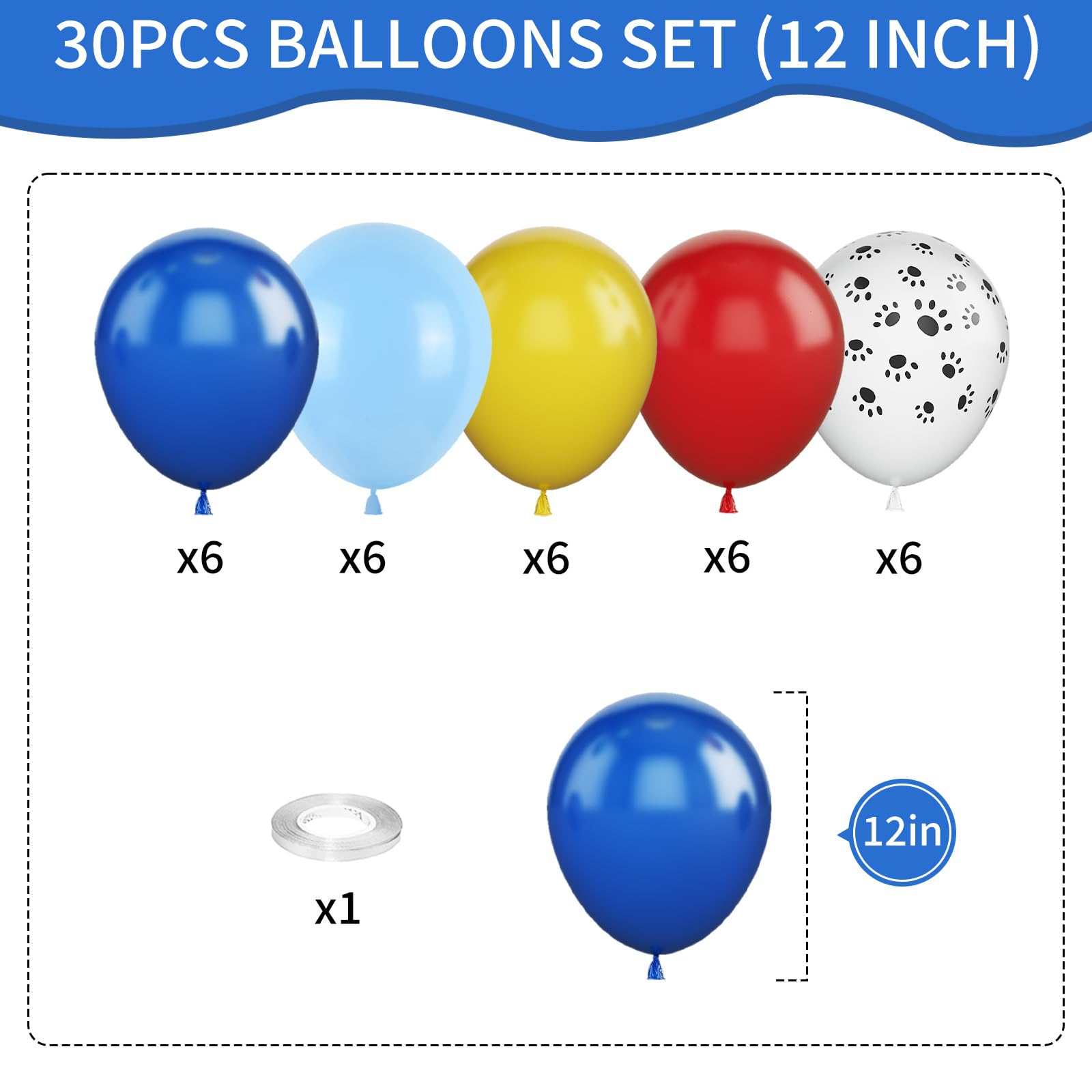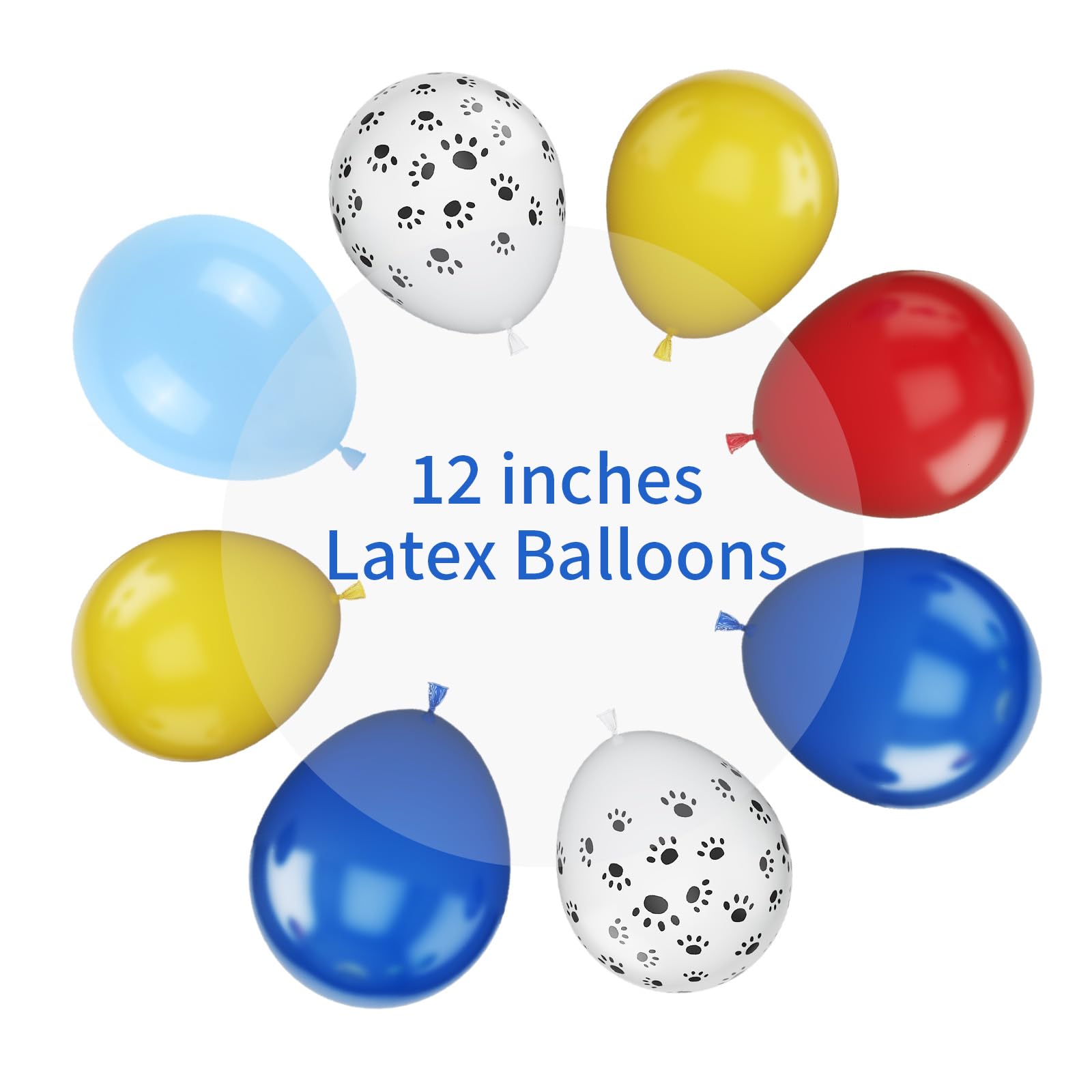 12 Inch dog paw balloons: Package content includes 6 pcs royal blue balloons, 6 pcs yellow balloons, 6 pcs red balloons,6 pcs pastel blue balloons,6 pcs paw balloons, a balloon ribbon.