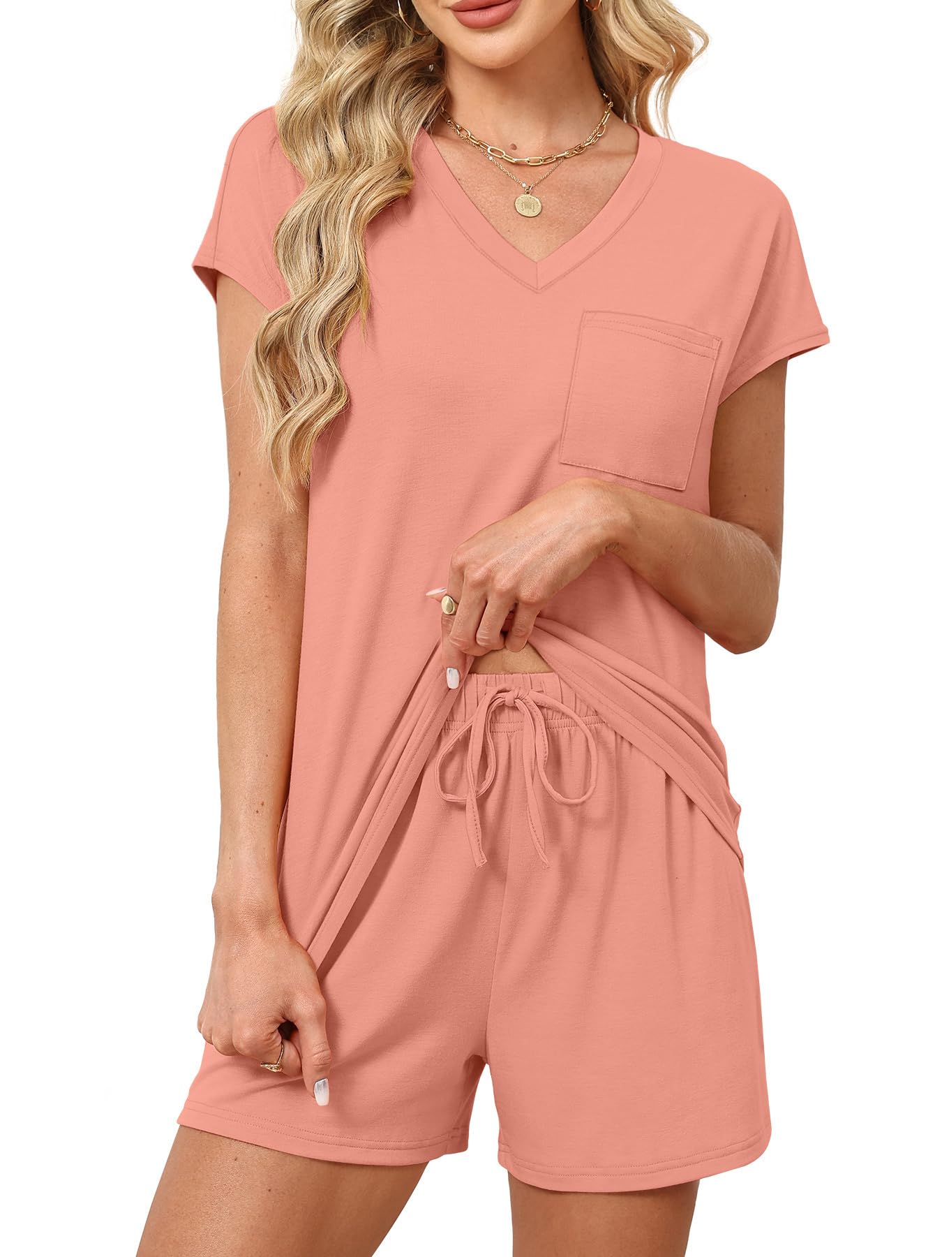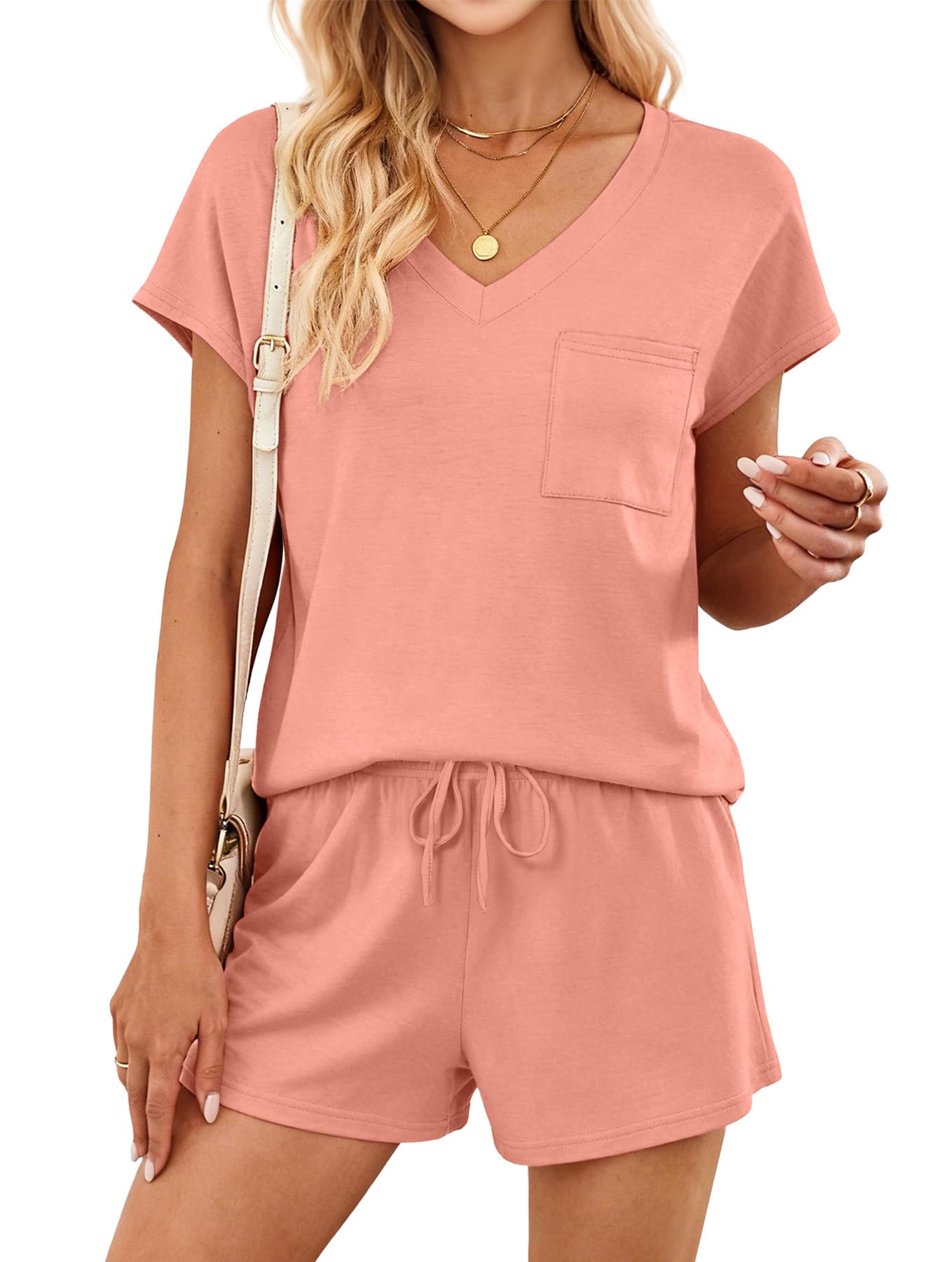 Design: Side-pocket shorts with relaxed fit & adjustable drawstring offer comfort and convenience; the trendy V-neck cap-sleeve top also works as a chic summer piece