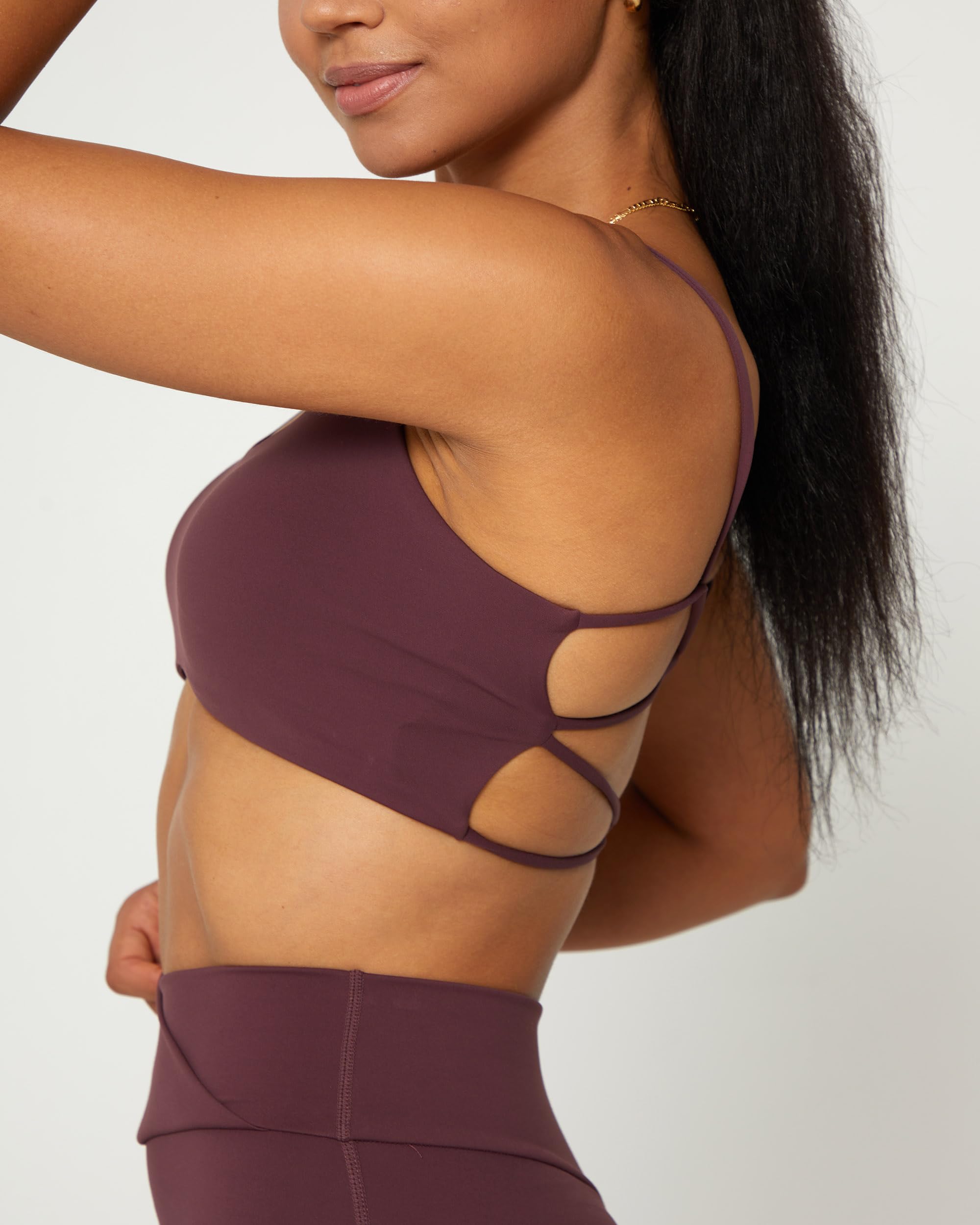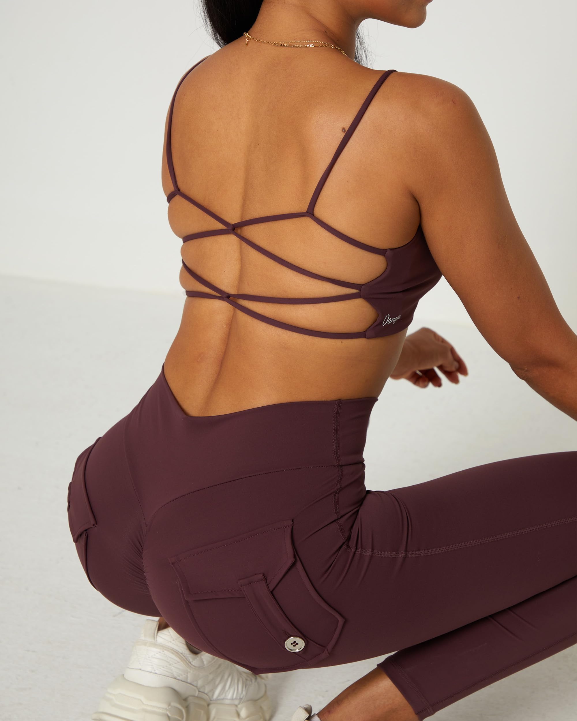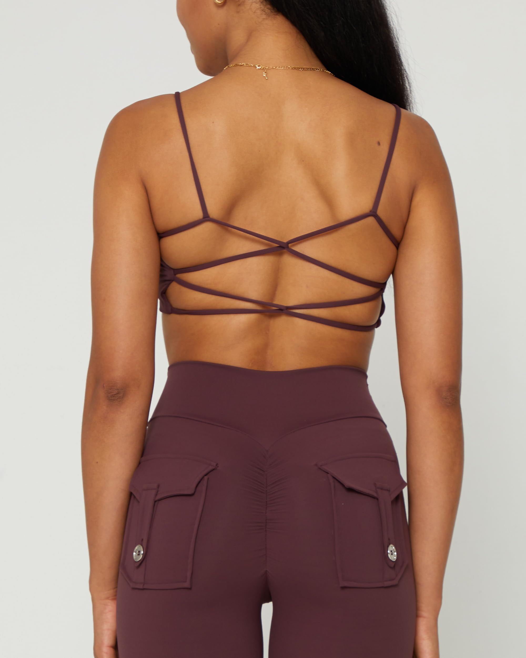 Cross Back Top: Designed for low impact exercises such as pilates, yoga and barre, our backless sports bra combines aesthetic with functionality. This backless sports bra with an open back design enhanced with multiple cross back straps and a bust flattering scoop neckline.
