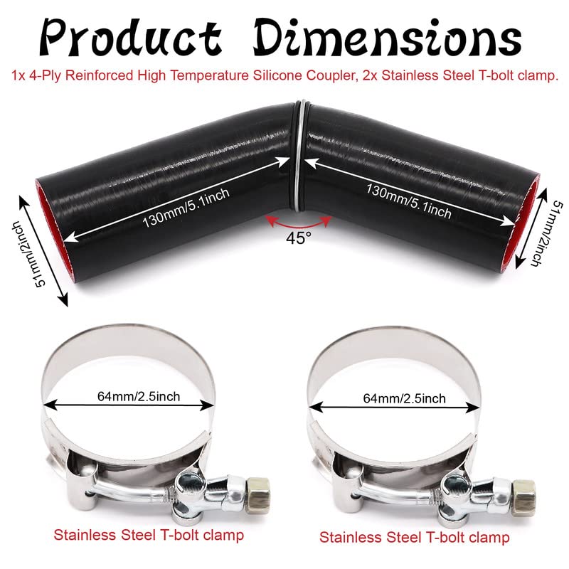 Package including: 1pc silicone 45 Degree Elbow Coupler Hose, 2pcs Stainless steel Hose Clamps.