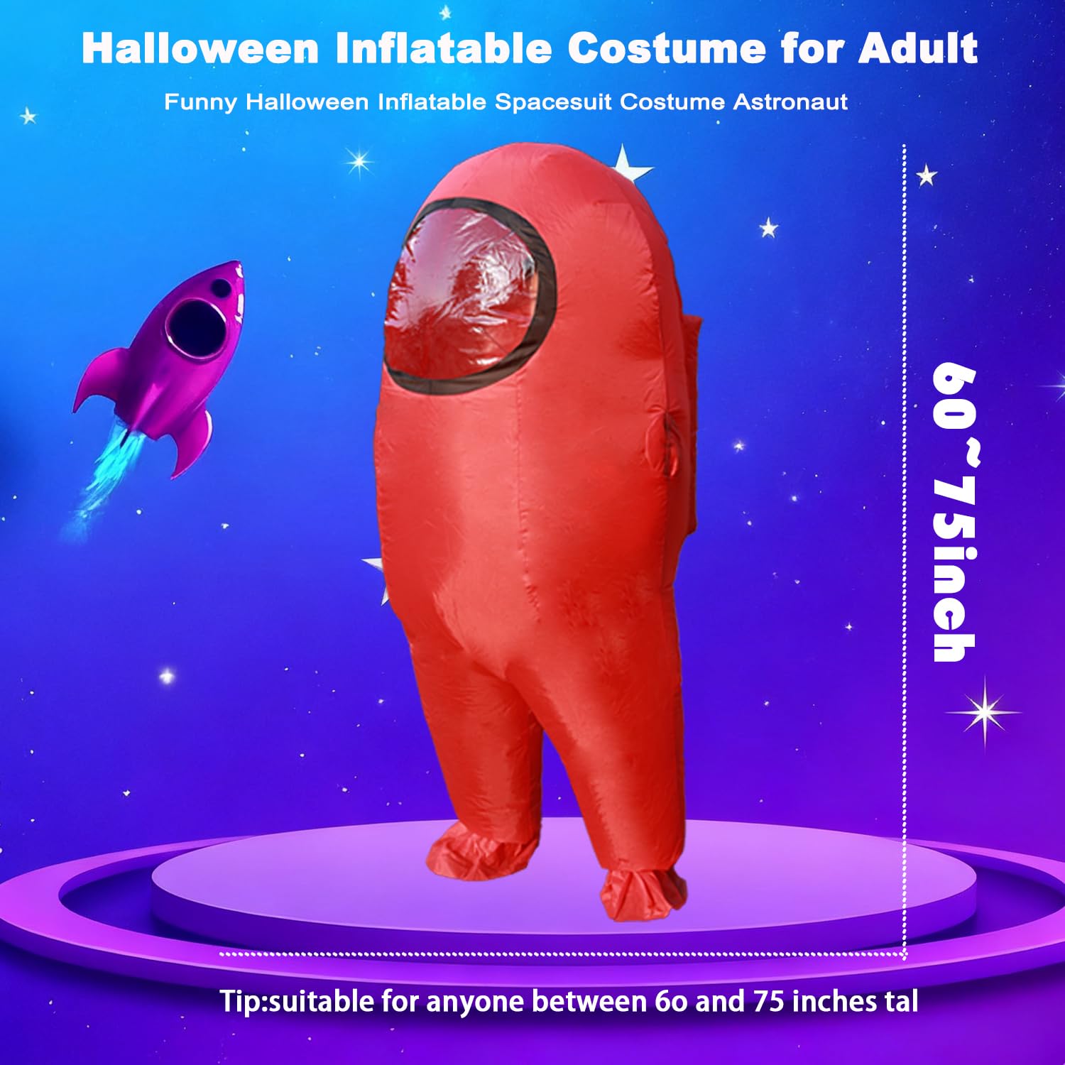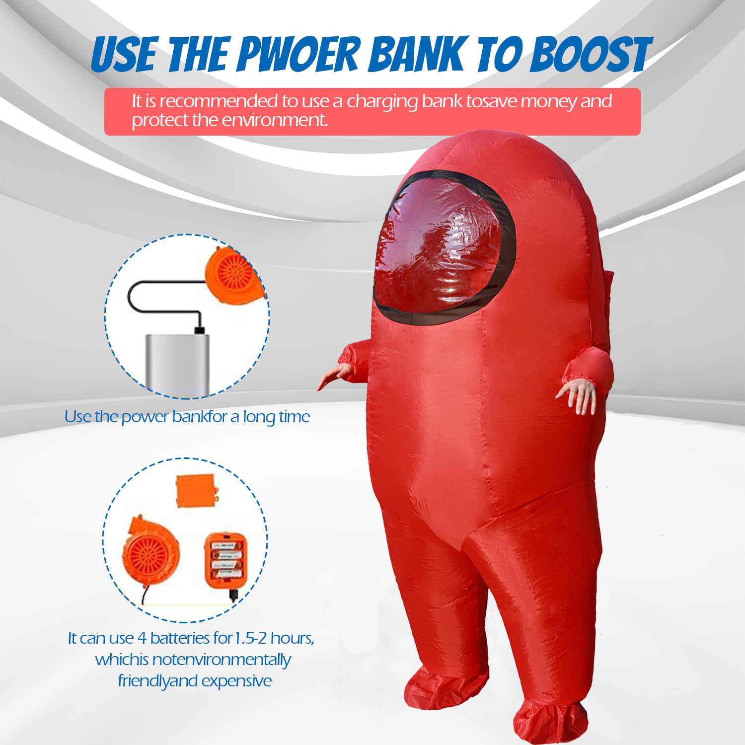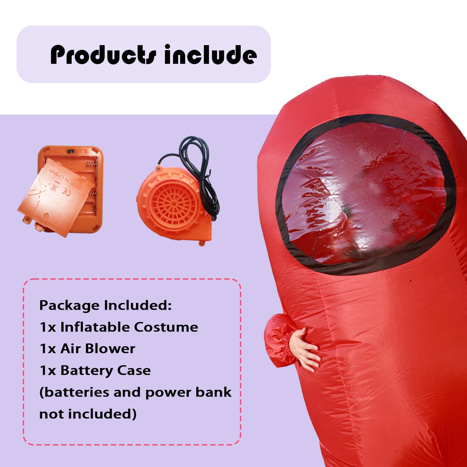 Description Importance: This inflatable space costume is larger than typical options, so we recommend using a USB charger for inflation. This method will ensure quick and complete inflation. The imposter inflatable costume accommodates individuals between 160-195 cm in height. It is crafted from durable polyester, featuring windows made of double-layer material, allowing you the freedom to enjoy trick-or-treating. The Space Crewmate game emphasizes patience and provides an engaging way to pass the time with friends. Arrive at any gathering in style with our new crewmate costumes. Whether you're spending quality time with family or attending a Halloween party with friends, there's no reason not to fully embrace the spirit of the occasion with this spaceman costume. This spaceman outfit represents one of the most popular games today, offering an easy way to connect and play together. You can wear this costume while trick-or-treating alongside your friends without needing a mask. Adult Crewmate Costume